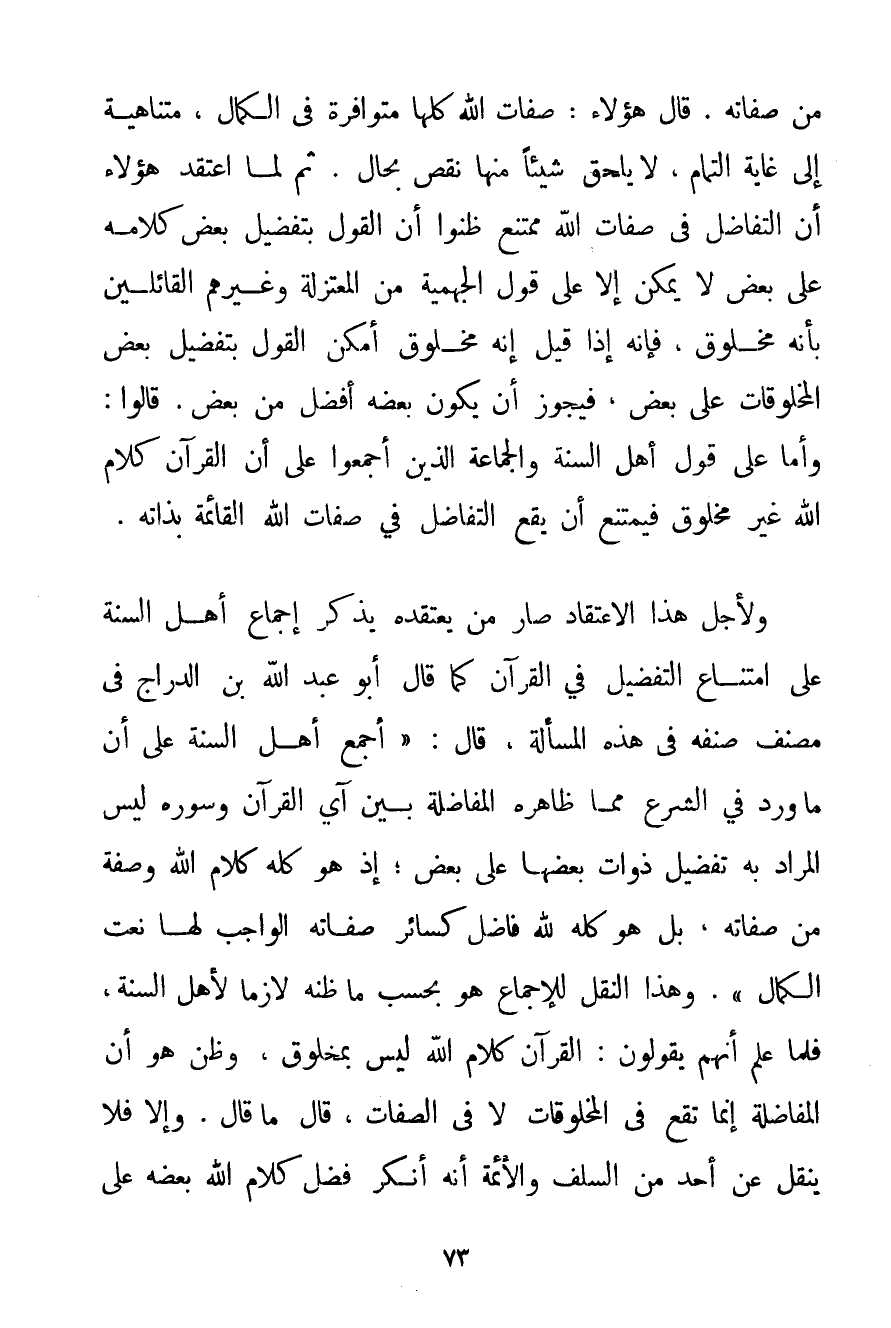 مِنْ صِفَاتِهِ. قَالَ هَؤُلَاءِ: صِفَاتُ اللَّهِ كُلُّهَا مُتَوَافِرَةٌ فِي الْكَمَالِ مُتَنَاهِيَةٌ إلَى غَايَةِ التَّمَامِ لَا يَلْحَقُ شَيْئًا مِنْهَا نَقْصٌ بِحَالِ. ثُمَّ لَمَّا اعْتَقَدَ هَؤُلَاءِ أَنَّ التَّفَاضُلَ فِي صِفَاتِ اللَّهِ مُمْتَنِعٌ ظَنُّوا أَنَّ الْقَوْلَ بِتَفْضِيلِ بَعْضِ كَلَامِهِ عَلَى بَعْضٍ لَا يُمْكِنُ إلَّا عَلَى قَوْلِ الْجَهْمِيَّة مِنْ الْمُعْتَزِلَةِ وَغَيْرِهِمْ الْقَائِلِينَ بِأَنَّهُ مَخْلُوقٌ فَإِنَّهُ إذَا قِيلَ إنَّهُ مَخْلُوقٌ أَمْكَنَ الْقَوْلُ بِتَفْضِيلِ بَعْضِ الْمَخْلُوقَاتِ عَلَى بَعْضٍ فَيَجُوزُ أَنْ يَكُونَ بَعْضُهُ أَفْضَلَ مِنْ بَعْضٍ. قَالُوا: وَأَمَّا عَلَى قَوْلِ أَهْلِ السُّنَّةِ وَالْجَمَاعَةِ الَّذِينَ أَجْمَعُوا عَلَى أَنَّ الْقُرْآنَ كَلَامُ اللَّهِ غَيْرُ مَخْلُوقٍ فَيَمْتَنِعُ أَنْ يَقَعَ التَّفَاضُلُ فِي صِفَاتِ اللَّهِ الْقَائِمَةِ بِذَاتِهِ. وَلِأَجْلِ هَذَا الِاعْتِقَادِ صَارَ مَنْ يَعْتَقِدُهُ يَذْكُرُ إجْمَاعَ أَهْلِ السُّنَّةِ عَلَى امْتِنَاعِ التَّفْضِيلِ فِي الْقُرْآنِ كَمَا قَالَ أَبُو عَبْدِ اللَّهِ بْنُ الدَّرَّاجِ فِي مُصَنَّفٍ صَنَّفَهُ فِي هَذِهِ الْمَسْأَلَةِ قَالَ: " أَجْمَعَ أَهْلُ السُّنَّةِ عَلَى أَنَّ مَا وَرَدَ فِي الشَّرْعِ مِمَّا ظَاهِرُهُ الْمُفَاضَلَةُ بَيْنَ آيِ الْقُرْآنِ وَسُورِهِ لَيْسَ الْمُرَادُ بِهِ تَفْضِيلَ ذَوَاتِ بَعْضِهَا عَلَى بَعْضٍ؛ إذْ هُوَ كُلُّهُ كَلَامُ اللَّهِ وَصِفَةٌ مِنْ صِفَاتِهِ بَلْ هُوَ كُلُّهُ لِلَّهِ فَاضِلٌ كَسَائِرِ صِفَاتِهِ الْوَاجِبِ لَهَا نَعْتُ الْكَمَالِ ". وَهَذَا النَّقْلُ لِلْإِجْمَاعِ هُوَ بِحَسَبِ مَا ظَنَّهُ لَازِمًا لِأَهْلِ السُّنَّةِ فَلَمَّا عَلِمَ أَنَّهُمْ يَقُولُونَ: الْقُرْآنُ كَلَامُ اللَّهِ لَيْسَ بِمَخْلُوقِ وَظَنَّ هُوَ أَنَّ الْمُفَاضَلَةَ إنَّمَا تَقَعُ فِي الْمَخْلُوقَاتِ لَا فِي الصِّفَاتِ قَالَ مَا قَالَ. وَإِلَّا فَلَا يُنْقَلُ عَنْ أَحَدٍ مِنْ السَّلَفِ وَالْأَئِمَّةِ أَنَّهُ أَنْكَرَ فَضْلَ كَلَامِ اللَّهِ بَعْضَهُ