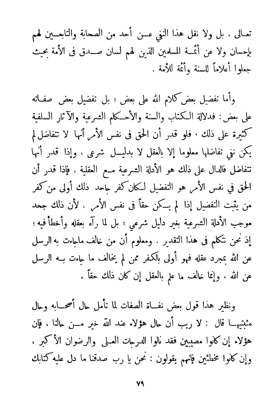 وَأَمَّا تَفْضِيلُ بَعْضِ كَلَامِ اللَّهِ عَلَى بَعْضٍ؛ بَلْ تَفْضِيلُ بَعْضِ صِفَاتِهِ عَلَى بَعْضِ: فَدَلَالَةُ الْكِتَابِ وَالسُّنَّةِ وَالْأَحْكَامِ الشَّرْعِيَّةِ وَالْآثَارِ السَّلَفِيَّةِ كَثِيرَةٌ عَلَى ذَلِكَ فَلَوْ قُدِّرَ أَنَّ الْحَقَّ فِي نَفْسِ الْأَمْرِ أَنَّهَا لَا تَتَفَاضَلُ لَمْ يَكُنْ نَفْيُ تَفَاضُلِهَا مَعْلُومًا إلَّا بِالْعَقْلِ لَا بِدَلِيلِ شَرْعِيٍّ وَإِذَا قُدِّرَ أَنَّهَا تَتَفَاضَلُ فَالدَّالُّ عَلَى ذَلِكَ هُوَ الْأَدِلَّةُ الشَّرْعِيَّةُ مَعَ الْعَقْلِيَّةِ فَإِذَا قُدِّرَ أَنَّ الْحَقَّ فِي نَفْسِ الْأَمْرِ هُوَ التَّفْضِيلُ لَكَانَ كُفْرُ جَاحِدِ ذَلِكَ أَوْلَى مِنْ كُفْرِ مَنْ يُثْبِتُ التَّفْضِيلَ إذَا لَمْ يَكُنْ حَقًّا فِي نَفْسِ الْأَمْرِ لِأَنَّ ذَلِكَ جَحَدَ مُوجِبَ الْأَدِلَّةِ الشَّرْعِيَّةِ بِغَيْرِ دَلِيلٍ شَرْعِيٍّ؛ بَلْ لَمَّا رَآهُ بِعَقْلِهِ وَأَخْطَأَ فِيهِ؛ إذْ نَحْنُ نَتَكَلَّمُ فِي هَذَا التَّقْدِيرِ. وَمَعْلُومٌ أَنَّ مَنْ خَالَفَ مَا جَاءَتْ بِهِ الرُّسُلُ عَنْ اللَّهِ بِمُجَرَّدِ عَقْلِهِ فَهُوَ أَوْلَى بِالْكُفْرِ مِمَّنْ لَمْ يُخَالِفْ مَا جَاءَتْ بِهِ الرُّسُلُ عَنْ اللَّهِ وَإِنَّمَا خَالَفَ مَا عُلِمَ بِالْعَقْلِ إنْ كَانَ ذَلِكَ حَقًّا. وَنَظِيرُ هَذَا قَوْلُ بَعْضِ نفاة الصِّفَاتِ لَمَّا تَأَمَّلَ حَالَ أَصْحَابِهِ وَحَالَ مُثْبِتِيهَا قَالَ: لَا رَيْبَ أَنَّ حَالَ هَؤُلَاءِ عِنْدَ اللَّهِ خَيْرٌ مِنْ حَالِنَا فَإِنَّ هَؤُلَاءِ إنْ كَانُوا مُصِيبِينَ فَقَدْ نَالُوا الدَّرَجَاتِ الْعُلَى وَالرِّضْوَانَ الْأَكْبَرَ وَإِنْ كَانُوا مُخْطِئِينَ فَإِنَّهُمْ يَقُولُونَ: نَحْنُ يَا رَبِّ صَدَّقْنَا مَا دَلَّ عَلَيْهِ كِتَابُك