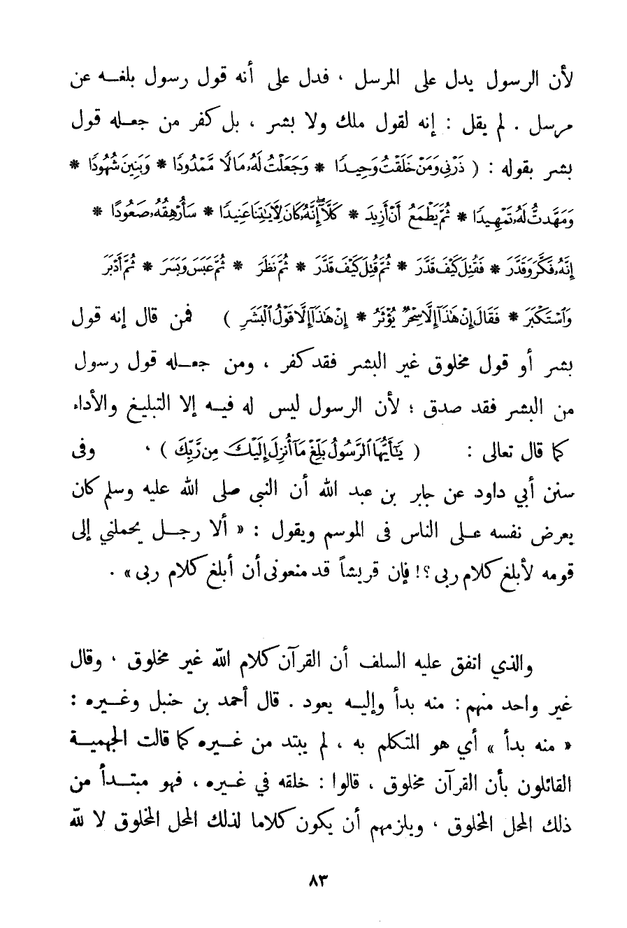 لِأَنَّ الرَّسُولَ يَدُلُّ عَلَى الْمُرْسَلِ فَدَلَّ عَلَى أَنَّهُ قَوْلُ رَسُولٍ بَلَّغَهُ عَنْ مُرْسَلٍ. لَمْ يَقُلْ: إنَّهُ لَقَوْلُ مَلَكٍ وَلَا بَشَرٍ بَلْ كَفَرَ مَنْ جَعَلَهُ قَوْلَ بَشَرٍ بِقَوْلِهِ: {ذَرْنِي وَمَنْ خَلَقْتُ وَحِيدًا} {وَجَعَلْتُ لَهُ مَالًا مَمْدُودًا} {وَبَنِينَ شُهُودًا} {وَمَهَّدْتُ لَهُ تَمْهِيدًا} {ثُمَّ يَطْمَعُ أَنْ أَزِيدَ} {كَلَّا إنَّهُ كَانَ لِآيَاتِنَا عَنِيدًا} {سَأُرْهِقُهُ صَعُودًا} {إنَّهُ فَكَّرَ وَقَدَّرَ} {فَقُتِلَ كَيْفَ قَدَّرَ} {ثُمَّ قُتِلَ كَيْفَ قَدَّرَ} {ثُمَّ نَظَرَ} {ثُمَّ عَبَسَ وَبَسَرَ} {ثُمَّ أَدْبَرَ وَاسْتَكْبَرَ} {فَقَالَ إنْ هَذَا إلَّا سِحْرٌ يُؤْثَرُ} {إنْ هَذَا إلَّا قَوْلُ الْبَشَرِ} فَمِنْ قَالَ إنَّهُ قَوْلُ بِشَرِّ أَوْ قَوْلُ مَخْلُوقٍ غَيْرِ الْبَشَرِ فَقَدْ كَفَرَ وَمَنْ جَعَلَهُ قَوْلَ رَسُولٍ مِنْ الْبَشَرِ فَقَدْ صَدَقَ؛ لِأَنَّ الرَّسُولَ لَيْسَ لَهُ فِيهِ إلَّا التَّبْلِيغُ وَالْأَدَاءُ كَمَا قَالَ تَعَالَى: {يَا أَيُّهَا الرَّسُولُ بَلِّغْ مَا أُنْزِلَ إلَيْكَ مِنْ رَبِّكَ} وَفِي سُنَنِ أَبِي دَاوُد عَنْ جَابِرِ بْنِ عَبْدِ اللَّهِ {أَنَّ النَّبِيَّ صَلَّى اللَّهُ عَلَيْهِ وَسَلَّمَ كَانَ يَعْرِضُ نَفْسَهُ عَلَى النَّاسِ فِي الْمَوْسِمِ وَيَقُولُ: أَلَا رَجُلٍ يَحْمِلُنِي إلَى قَوْمِهِ لِأُبَلِّغَ كَلَامَ رَبِّي؟ فَإِنَّ قُرَيْشًا قَدّ مَنَعُونِي أَنْ أُبَلِّغَ كَلَامَ رَبِّي} . وَاَلَّذِي اتَّفَقَ عَلَيْهِ السَّلَفُ أَنَّ الْقُرْآنَ كَلَامُ اللَّهِ غَيْرُ مَخْلُوقٍ وَقَالَ غَيْرُ وَاحِدٍ مِنْهُمْ: مِنْهُ بَدَأَ وَإِلَيْهِ يَعُودُ. قَالَ أَحْمَد بْنُ حَنْبَلٍ وَغَيْرُهُ: " مِنْهُ بَدَأَ " أَيْ هُوَ الْمُتَكَلِّمُ بِهِ لَمْ يَبْتَدِ مِنْ غَيْرِهِ كَمَا قَالَتْ الْجَهْمِيَّة الْقَائِلُونَ بِأَنَّ الْقُرْآنَ مَخْلُوقٌ قَالُوا: خَلْقُهُ فِي غَيْرِهِ فَهُوَ مُبْتَدَأٌ مِنْ ذَلِكَ الْمَحَلِّ الْمَخْلُوقِ وَيَلْزَمُهُمْ أَنْ يَكُونَ كَلَامًا لِذَلِكَ الْمَحَلِّ الْمَخْلُوقِ لَا لِلَّهِ