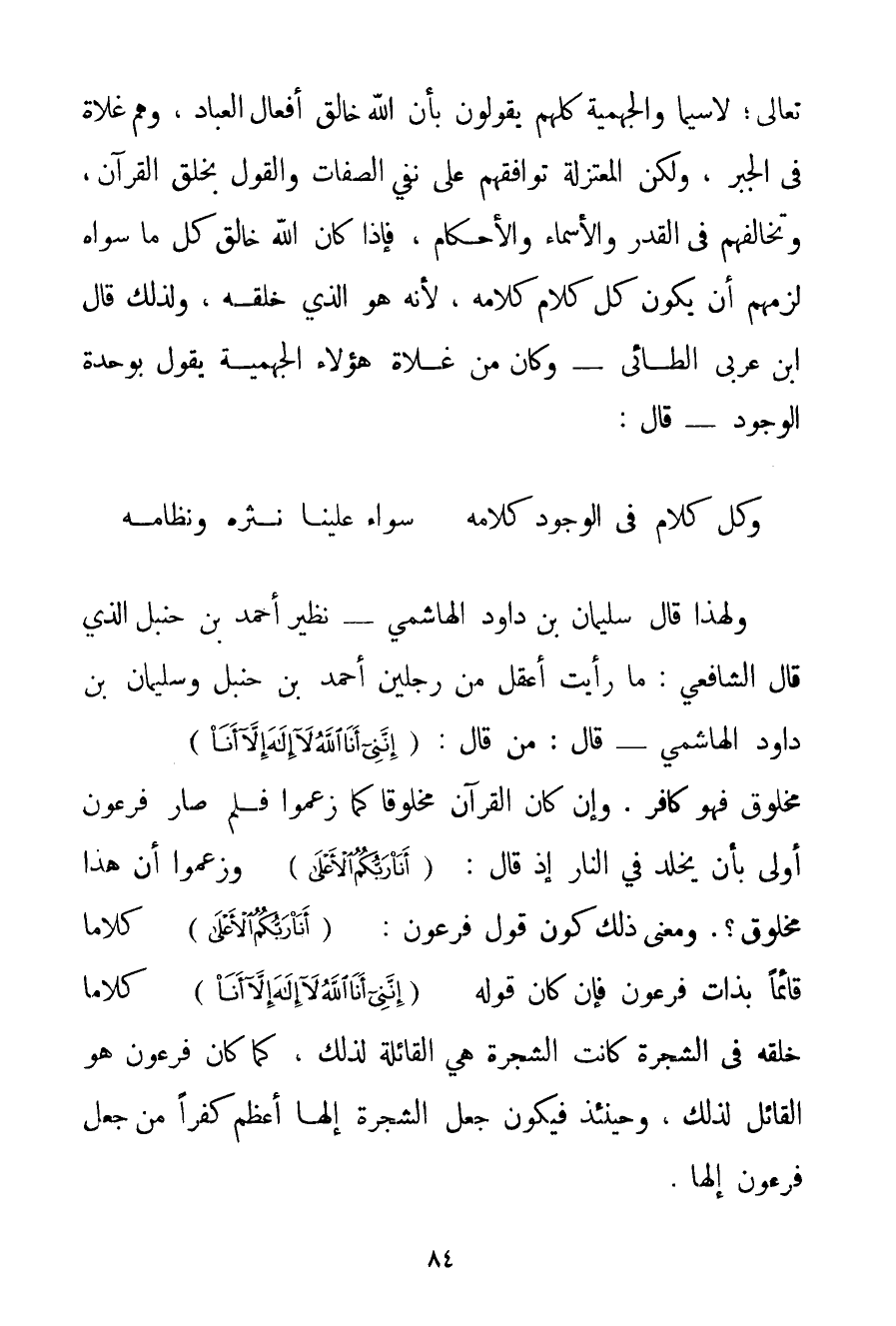 تَعَالَى؛ لَا سِيَّمَا وَالْجَهْمِيَّة كُلُّهُمْ يَقُولُونَ بِأَنَّ اللَّهَ خَالِقُ أَفْعَالِ الْعِبَادِ وَهُمْ غُلَاةٌ فِي الْجَبْرِ وَلَكِنْ الْمُعْتَزِلَةِ تُوَافِقُهُمْ عَلَى نَفْيِ الصِّفَاتِ وَالْقَوْلِ بِخَلْقِ الْقُرْآنِ وَتُخَالِفُهُمْ فِي الْقَدَرِ وَالْأَسْمَاءِ وَالْأَحْكَامِ فَإِذَا كَانَ اللَّهُ خَالِقُ كُلِّ مَا سِوَاهُ لَزِمَهُمْ أَنْ يَكُونَ كُلُّ كَلَامٍ كَلَامَهُ لِأَنَّهُ هُوَ الَّذِي خَلَقَهُ وَلِذَلِكَ قَالَ ابْنُ عَرَبِيٍّ الطَّائِيُّ - وَكَانَ مِنْ غُلَاةِ هَؤُلَاءِ الْجَهْمِيَّة يَقُولُ بِوَحْدَةِ الْوُجُودِ - قَالَ: وَكُلُّ كَلَامٍ فِي الْوُجُودِ كَلَامُهُ سَوَاءٌ عَلَيْنَا نَثْرُهُ وَنِظَامُهُ وَلِهَذَا قَالَ سُلَيْمَانُ بْنُ دَاوُد الْهَاشِمِيُّ - نَظِيرُ أَحْمَد بْنِ حَنْبَلٍ الَّذِي قَالَ الشَّافِعِيُّ: مَا رَأَيْت أَعْقَلَ مِنْ رَجُلَيْنِ أَحْمَد بْنِ حَنْبَلٍ وَسُلَيْمَانَ بْنِ دَاوُد الْهَاشِمِيِّ - قَالَ: مَنْ قَالَ: {إنَّنِي أَنَا اللَّهُ لَا إلَهَ إلَّا أَنَا} مَخْلُوقٌ فَهُوَ كَافِرٌ. وَإِنْ كَانَ الْقُرْآنُ مَخْلُوقًا كَمَا زَعَمُوا فَلِمَ صَارَ فِرْعَوْنُ أَوْلَى بِأَنْ يُخَلَّدُ فِي النَّارِ إذْ قَالَ: {أَنَا رَبُّكُمُ الْأَعْلَى} وَزَعَمُوا أَنَّ هَذَا مَخْلُوقٌ؟ . وَمَعْنَى ذَلِكَ كَوْنُ قَوْلِ فِرْعَوْنَ: {أَنَا رَبُّكُمُ الْأَعْلَى} كَلَامًا قَائِمًا بِذَاتِ فِرْعَوْنَ فَإِنْ كَانَ قَوْلُهُ {إنَّنِي أَنَا اللَّهُ لَا إلَهَ إلَّا أَنَا} كَلَامًا خَلَقَهُ فِي الشَّجَرَةِ كَانَتْ الشَّجَرَةُ هِيَ الْقَائِلَةُ لِذَلِكَ كَمَا كَانَ فِرْعَوْنُ هُوَ الْقَائِلُ لِذَلِكَ وَحِينَئِذٍ فَيَكُونُ جَعْلُ الشَّجَرَةِ إلَهًا أَعْظَمَ كُفْرًا مِنْ جَعْلِ فِرْعَوْنَ إلَهًا.