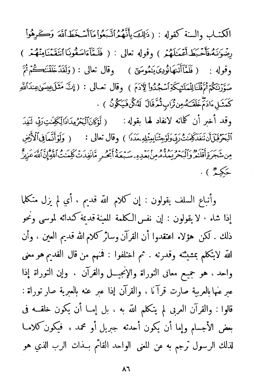 الْكِتَابُ وَالسُّنَّةُ كَقَوْلِهِ: {ذَلِكَ بِأَنَّهُمُ اتَّبَعُوا مَا أَسْخَطَ اللَّهَ وَكَرِهُوا رِضْوَانَهُ فَأَحْبَطَ أَعْمَالَهُمْ} وَقَوْلِهِ تَعَالَى: {فَلَمَّا آسَفُونَا انْتَقَمْنَا مِنْهُمْ} وَقَوْلِهِ: {فَلَمَّا أَتَاهَا نُودِيَ يَا مُوسَى} وَقَالَ تَعَالَى: {وَلَقَدْ خَلَقْنَاكُمْ ثُمَّ صَوَّرْنَاكُمْ ثُمَّ قُلْنَا لِلْمَلَائِكَةِ اسْجُدُوا لِآدَمَ} وَقَالَ تَعَالَى: {إنَّ مَثَلَ عِيسَى عِنْدَ اللَّهِ كَمَثَلِ آدَمَ خَلَقَهُ مِنْ تُرَابٍ ثُمَّ قَالَ لَهُ كُنْ فَيَكُونُ} . وَقَدْ أَخْبَرَ أَنَّ كَلِمَاتِهِ لَا نَفَادَ لَهَا بِقَوْلِهِ: {لَوْ كَانَ الْبَحْرُ مِدَادًا لِكَلِمَاتِ رَبِّي لَنَفِدَ الْبَحْرُ قَبْلَ أَنْ تَنْفَدَ كَلِمَاتُ رَبِّي وَلَوْ جِئْنَا بِمِثْلِهِ مَدَدًا} وَقَالَ تَعَالَى: {وَلَوْ أَنَّمَا فِي الْأَرْضِ مِنْ شَجَرَةٍ أَقْلَامٌ وَالْبَحْرُ يَمُدُّهُ مِنْ بَعْدِهِ سَبْعَةُ أَبْحُرٍ مَا نَفِدَتْ كَلِمَاتُ اللَّهِ إنَّ اللَّهَ عَزِيزٌ حَكِيمٌ} . وَأَتْبَاعُ السَّلَفِ يَقُولُونَ: إنَّ كَلَامَ اللَّهِ قَدِيمٌ أَيْ لَمْ يَزَلْ مُتَكَلِّمًا إذَا شَاءَ لَا يَقُولُونَ: إنَّ نَفْسَ الْكَلِمَةِ الْمُعَيَّنَةِ قَدِيمَةٌ كَنِدَائِهِ لِمُوسَى وَنَحْوِ ذَلِكَ. لَكِنَّ هَؤُلَاءِ اعْتَقَدُوا أَنَّ الْقُرْآنَ وَسَائِرَ كَلَامِ اللَّهِ قَدِيمُ الْعَيْنِ وَأَنَّ اللَّهَ لَا يَتَكَلَّمُ بِمَشِيئَتِهِ وَقُدْرَتِهِ. ثُمَّ اخْتَلَفُوا: فَمِنْهُمْ مَنْ قَالَ الْقَدِيمُ هُوَ مَعْنًى وَاحِدٌ هُوَ جَمِيعُ مَعَانِي التَّوْرَاةِ وَالْإِنْجِيلِ وَالْقُرْآنِ وَأَنَّ التَّوْرَاةَ إذَا عُبِّرَ عَنْهَا بِالْعَرَبِيَّةِ صَارَتْ قُرْآنًا وَالْقُرْآنُ إذَا عُبِّرَ عَنْهُ بِالْعِبْرِيَّةِ صَارَ تَوْرَاةً: قَالُوا: وَالْقُرْآنُ الْعَرَبِيُّ لَمْ يَتَكَلَّمْ اللَّهُ بِهِ بَلْ إمَّا أَنْ يَكُونَ خَلَقَهُ فِي بَعْضِ الْأَجْسَامِ وَإِمَّا أَنْ يَكُونَ أَحْدَثَهُ جِبْرِيلُ أَوْ مُحَمَّدٌ فَيَكُونُ كَلَامًا لِذَلِكَ الرَّسُولِ تَرْجَمَ بِهِ عَنْ الْمَعْنَى الْوَاحِدِ الْقَائِمِ بِذَاتِ الرَّبِّ الَّذِي هُوَ