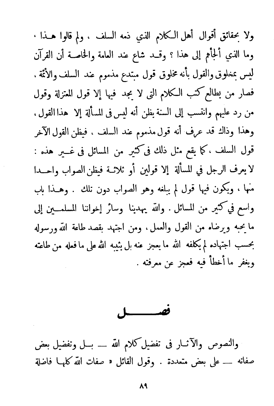 وَلَا بِحَقَائِقِ أَقْوَالِ أَهْلِ الْكَلَامِ الَّذِي ذَمَّهُ السَّلَفُ وَلِمَ قَالُوا هَذَا وَمَا الَّذِي أَلْجَأَهُمْ إلَى هَذَا؟ وَقَدْ شَاعَ عِنْدَ الْعَامَّةِ وَالْخَاصَّةِ أَنَّ الْقُرْآنَ لَيْسَ بِمَخْلُوقِ وَالْقَوْلُ بِأَنَّهُ مَخْلُوقٌ قَوْلٌ مُبْتَدَعٌ مَذْمُومٌ عِنْدَ السَّلَفِ وَالْأَئِمَّةِ فَصَارَ مَنْ يُطَالِعُ كُتُبَ الْكَلَامِ الَّتِي لَا يَجِدُ فِيهَا إلَّا قَوْلَ الْمُعْتَزِلَةِ وَقَوْلَ مَنْ رَدَّ عَلَيْهِمْ وَانْتَسَبَ إلَى السُّنَّةِ يَظُنُّ أَنَّهُ لَيْسَ فِي الْمَسْأَلَةِ إلَّا هَذَا الْقَوْلُ وَهَذَا وَذَاكَ قَدْ عَرَفَ أَنَّهُ قَوْلٌ مَذْمُومٌ عِنْدَ السَّلَفِ فَيُظَنُّ الْقَوْلَ الْآخَرَ قَوْلَ السَّلَفِ كَمَا يَقَعُ مِثْلُ ذَلِكَ فِي كَثِيرٍ مِنْ الْمَسَائِلِ فِي غَيْرِ هَذِهِ: لَا يَعْرِفُ الرَّجُلُ فِي الْمَسْأَلَةِ إلَّا قَوْلَيْنِ أَوْ ثَلَاثَةً فَيَظُنُّ الصَّوَابَ وَاحِدًا مِنْهَا وَيَكُونُ فِيهَا قَوْلٌ لَمْ يَبْلُغْهُ وَهُوَ الصَّوَابُ دُونَ تِلْكَ. وَهَذَا بَابٌ وَاسِعٌ فِي كَثِيرٍ مِنْ الْمَسَائِلِ. وَاَللَّهُ يَهْدِينَا وَسَائِرَ إخْوَانِنَا الْمُسْلِمِينَ إلَى مَا يُحِبُّهُ وَيَرْضَاهُ مِنْ الْقَوْلِ وَالْعَمَلِ وَمَنْ اجْتَهَدَ بِقَصْدِ طَاعَةِ اللَّهِ وَرَسُولِهِ بِحَسَبِ اجْتِهَادِهِ لَمْ يُكَلِّفْهُ اللَّهُ مَا يَعْجِزُ عَنْهُ بَلْ يُثِيبُهُ اللَّهُ عَلَى مَا فَعَلَهُ مِنْ طَاعَتِهِ وَيَغْفِرُ مَا أَخْطَأَ فِيهِ فَعَجَزَ عَنْ مَعْرِفَتِهِ.