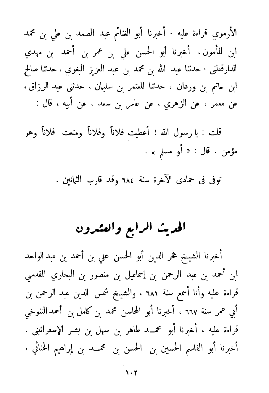 الأرموي قِرَاءَةً عَلَيْهِ أَخْبَرَنَا أَبُو الْغَنَائِمِ عَبْدُ الصَّمَدِ بْنُ عَلِيِّ بْنِ مُحَمَّدِ بْنِ الْمَأْمُونِ أَخْبَرَنَا أَبُو الْحَسَنِ عَلِيُّ بْنُ عُمَرَ بْنِ أَحْمَد بْنِ مَهْدِيٍّ الدارقطني حَدَّثَنَا عَبْدُ اللَّهِ بْنُ مُحَمَّدِ بْنِ عَبْدِ الْعَزِيزِ البغوي حَدَّثَنَا صَالِحُ بْنُ حَاتِمِ بْنِ وَرْدَانَ حَدَّثَنَا الْمُعْتَمِرُ بْنُ سُلَيْمَانَ حَدَّثَنِي عَبْدُ الرَّزَّاقِ عَنْ مَعْمَرٍ عَنْ الزُّهْرِيِّ عَنْ {عَامِرِ بْنِ سَعْدٍ عَنْ أَبِيهِ قَالَ: قُلْت: يَا رَسُولَ اللَّهِ أَعْطَيْت فُلَانًا وَفُلَانًا وَمَنَعْت فُلَانًا وَهُوَ مُؤْمِنٌ. قَالَ: أَوْ مُسْلِمٌ} . تُوُفِّيَ فِي جُمَادَى الْآخِرَةِ سَنَةَ 684 وَقَدْ قَارَبَ الثَّمَانِينَ.