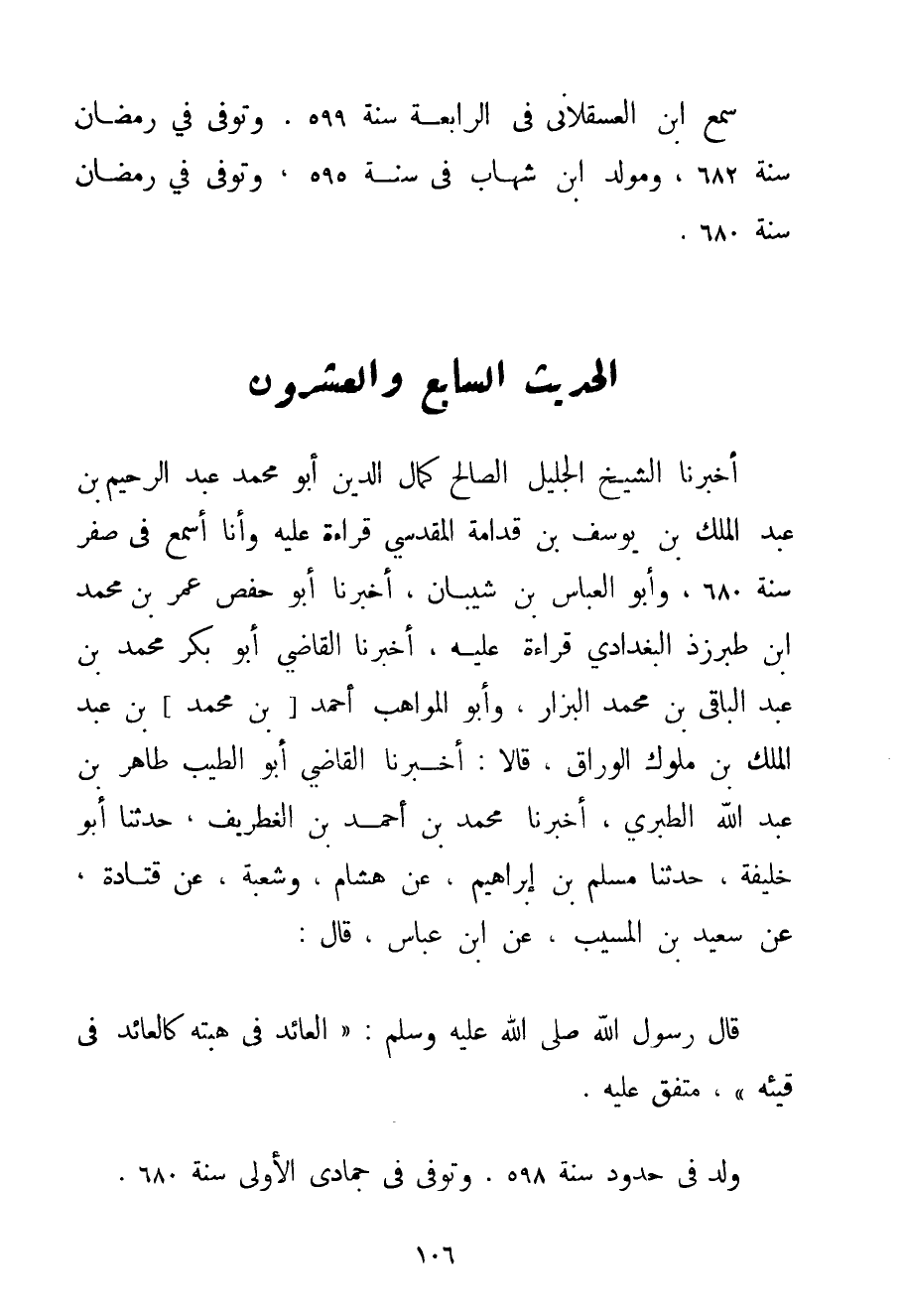 أَخْبَرَنَا الشَّيْخُ الْجَلِيلُ الصَّالِحُ كَمَالُ الدِّينِ أَبُو مُحَمَّدٍ عَبْدُ الرَّحِيمِ بْنُ عَبْدِ الْمَلِكِ بْنِ يُوسُفَ بْنِ قدامة المقدسي قِرَاءَةً عَلَيْهِ وَأَنَا أَسْمَعُ فِي صَفَرٍ سَنَةَ 680 وَأَبُو الْعَبَّاسِ بْنُ شيبان أَخْبَرَنَا أَبُو حَفْصٍ عُمَرُ بْنُ مُحَمَّدِ بْنِ طبرزذ الْبَغْدَادِيُّ قِرَاءَةً عَلَيْهِ أَخْبَرَنَا الْقَاضِي أَبُو بَكْرٍ مُحَمَّدُ بْنُ عَبْدِ الْبَاقِي بْنِ مُحَمَّدٍ الْبَزَّارُ وَأَبُو الْمَوَاهِبِ أَحْمَد بْنُ مُحَمَّدِ بْنِ عَبْدِ الْمَلِكِ بْنِ مُلُوكٍ الْوَرَّاقُ قَالَا: أَخْبَرَنَا الْقَاضِي أَبُو الطَّيِّبِ طَاهِرُ بْنُ عَبْدِ اللَّهِ الطبري أَخْبَرَنَا مُحَمَّدُ بْنُ أَحْمَد بْنِ الْغِطْرِيفِ حَدَّثَنَا أَبُو خَلِيفَةَ حَدَّثَنَا مُسْلِمُ بْنُ إبْرَاهِيمَ عَنْ هِشَامٍ وَشُعْبَةَ عَنْ قتادة عَنْ سَعِيدِ بْنِ الْمُسَيِّبِ عَنْ ابْنِ عَبَّاسٍ قَالَ: قَالَ رَسُولُ اللَّهِ صَلَّى اللَّهُ عَلَيْهِ وَسَلَّمَ {الْعَائِدُ فِي هِبَتِهِ كَالْعَائِدِ فِي قَيْئِهِ} مُتَّفَقٌ عَلَيْهِ. وُلِدَ فِي حُدُودِ سَنَةِ 598. وَتُوُفِّيَ فِي جُمَادَى الْأُولَى سَنَةَ 680.