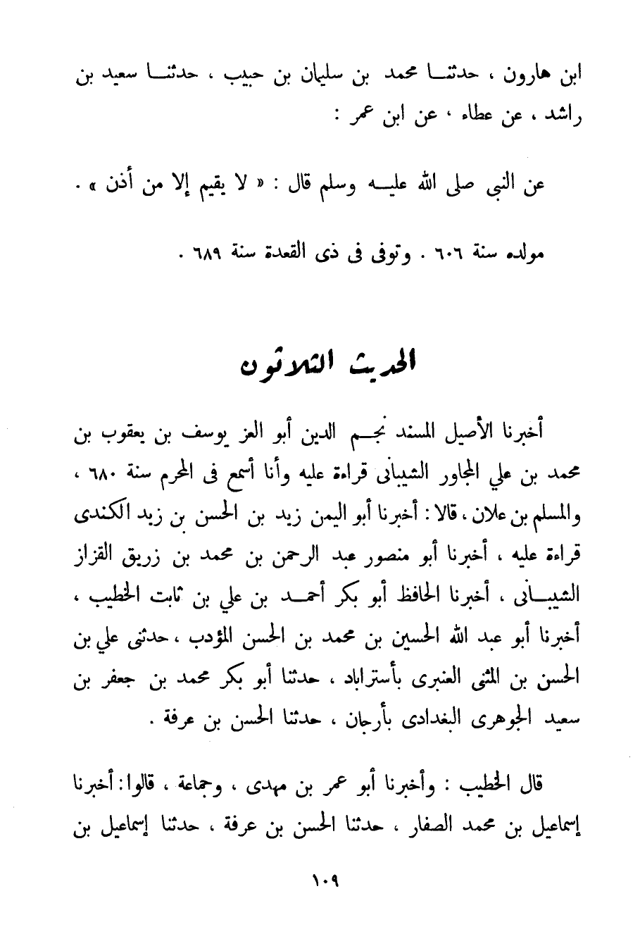 بْنُ هَارُونَ حَدَّثَنَا مُحَمَّدُ بْنُ سُلَيْمَانَ بْنِ حَبِيبٍ حَدَّثَنَا سَعِيدُ بْنُ رَاشِدٍ عَنْ عَطَاءٍ عَنْ ابْنِ عُمَرَ: عَنْ النَّبِيِّ صَلَّى اللَّهُ عَلَيْهِ وَسَلَّمَ قَالَ: {لَا يُقِيمُ إلَّا مَنْ أَذَّنَ} . مَوْلِدُهُ سَنَةَ 606. وَتُوُفِّيَ فِي ذِي الْقَعْدَةِ سَنَةَ 689.