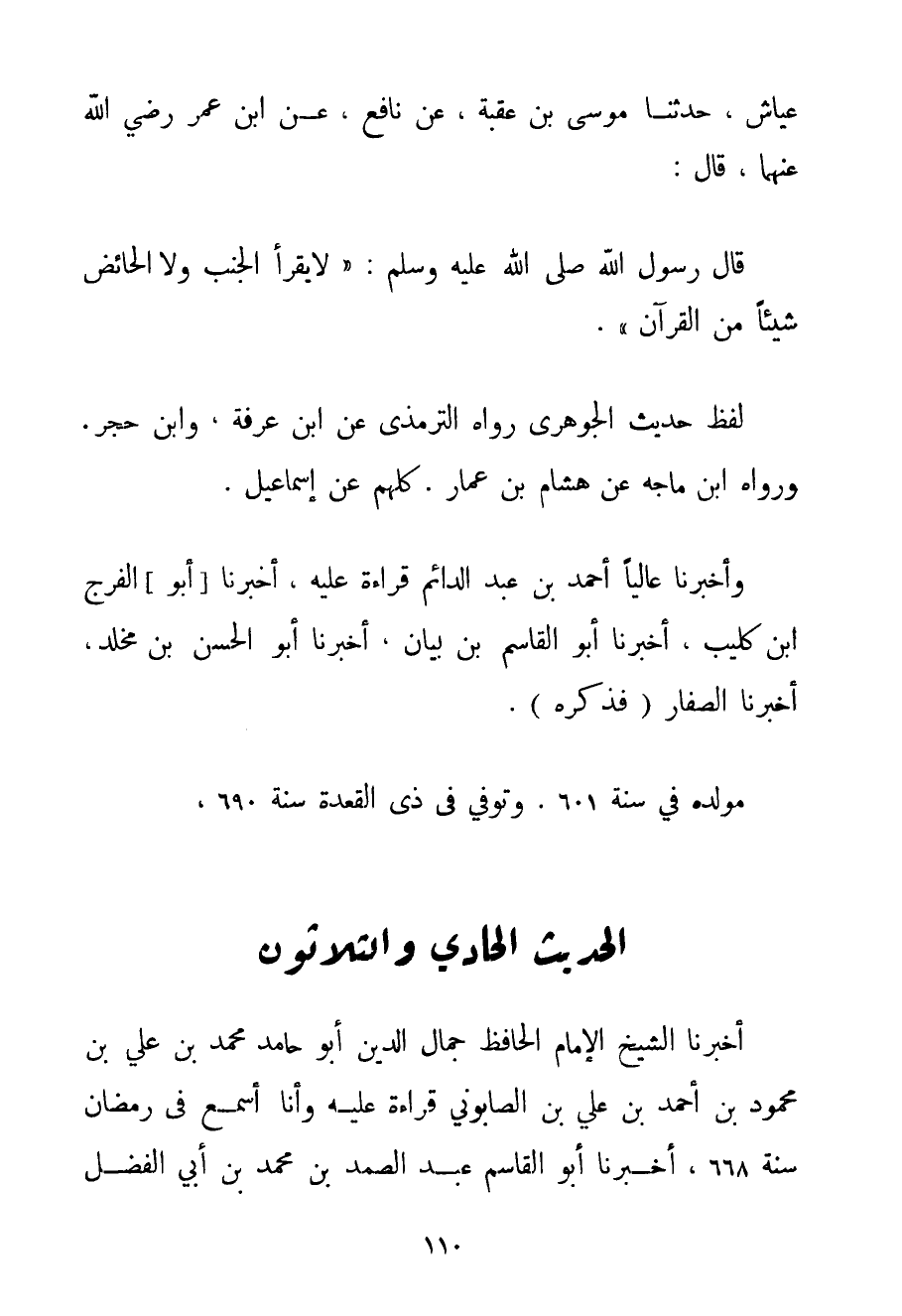 عَيَّاشٍ حَدَّثَنَا مُوسَى بْنُ عُقْبَةَ عَنْ نَافِعٍ عَنْ ابْنِ عُمَرَ رَضِيَ اللَّهُ عَنْهُمَا قَالَ: قَالَ رَسُولُ اللَّهِ صَلَّى اللَّهُ عَلَيْهِ وَسَلَّمَ {لَا يَقْرَأُ الْجُنُبُ وَلَا الْحَائِضُ شَيْئًا مِنْ الْقُرْآنِ} . لَفْظُ حَدِيثِ الْجَوْهَرِيِّ رَوَاهُ التِّرْمِذِيُّ عَنْ ابْنِ عَرَفَةَ وَابْنِ حَجَرٍ. وَرَوَاهُ ابْنُ مَاجَه عَنْ هِشَامِ بْنِ عَمَّارٍ. كُلُّهُمْ عَنْ إسْمَاعِيلَ. وَأَخْبَرَنَا عَالِيَا أَحْمَد بْنُ عَبْدِ الدَّائِمِ قِرَاءَةً عَلَيْهِ أَخْبَرَنَا أَبُو الْفَرَجِ بْنُ كُلَيْبٍ أَخْبَرَنَا أَبُو الْقَاسِمِ بْنُ بَيَانٍ أَخْبَرَنَا أَبُو الْحَسَنِ بْنُ مخلد أَخْبَرَنَا الصَّفَّارُ (فَذَكَرَهُ) . مَوْلِدُهُ فِي سَنَةِ 601. وَتُوُفِّيَ فِي ذِي الْقَعْدَةِ سَنَةَ 690