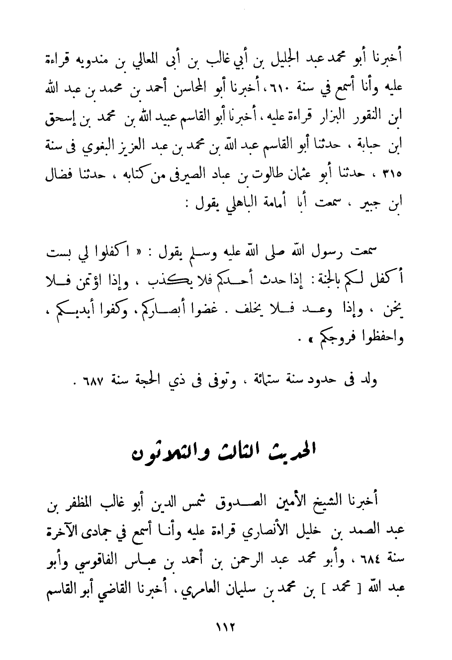 أَخْبَرَنَا أَبُو مُحَمَّدٍ عَبْدُ الْجَلِيلِ بْنُ أَبِي غَالِبِ بْنِ أَبِي الْمَعَالِي بْنِ مندويه قِرَاءَةً عَلَيْهِ وَأَنَا أَسْمَعُ فِي سَنَةِ 610 أَخْبَرَنَا أَبُو الْمَحَاسِنِ أَحْمَد بْنُ مُحَمَّدِ بْنِ عَبْدِ اللَّهِ بْنِ النقور الْبَزَّارُ قِرَاءَةً عَلَيْهِ أَخْبَرَنَا أَبُو الْقَاسِمِ عُبَيْدُ اللَّهِ بْنُ مُحَمَّدِ بْنِ إسْحَاقَ بْنِ حَبَّابَةَ حَدَّثَنَا أَبُو الْقَاسِمِ عَبْدُ اللَّهِ بْنُ مُحَمَّدِ بْنِ عَبْدِ الْعَزِيزِ البغوي فِي سَنَةِ 315 حَدَّثَنَا أَبُو عُثْمَانَ طَالُوتُ بْنُ عَبَّادٍ الصَّيْرَفِيُّ مِنْ كِتَابِهِ حَدَّثَنَا فضال بْنُ جُبَيْرٍ سَمِعْت أَبَا أمامة الْبَاهِلِيَّ يَقُولُ: سَمِعْت رَسُولَ اللَّهِ صَلَّى اللَّهُ عَلَيْهِ وَسَلَّمَ يَقُولُ: {اُكْفُلُوا لِي بِسِتِّ أَكْفُلُ لَكُمْ بِالْجَنَّةِ: إذَا حَدَّثَ أَحَدُكُمْ فَلَا يَكْذِبْ وَإِذَا اُؤْتُمِنَ فَلَا يَخُنْ وَإِذَا وَعَدَ فَلَا يُخْلِفْ. غُضُّوا أَبْصَارَكُمْ وَكُفُّوا أَيْدِيَكُمْ وَاحْفَظُوا فُرُوجَكُمْ} . وُلِدَ فِي حُدُودِ سَنَةِ سِتِّمِائَةٍ وَتُوُفِّيَ فِي ذِي الْحِجَّةِ سَنَةَ 687.