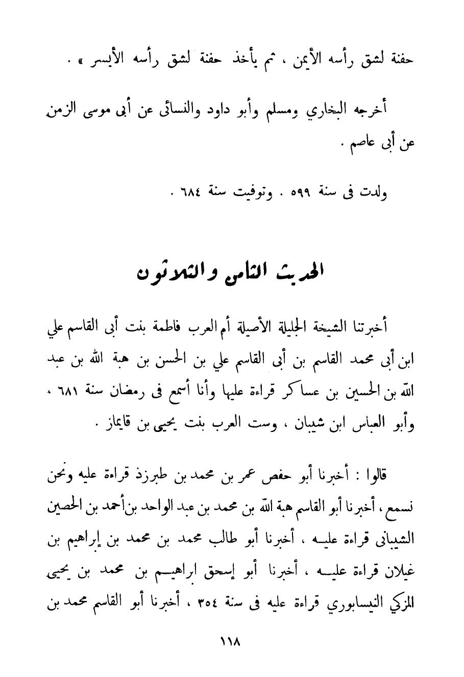 أَخْبَرَتْنَا الشَّيْخَةُ الْجَلِيلَةُ الْأَصِيلَةُ أُمُّ الْعَرَبِ فَاطِمَةُ بِنْتُ أَبِي الْقَاسِمِ عَلِيِّ بْنِ أَبِي مُحَمَّدِ الْقَاسِمِ بْنِ أَبِي الْقَاسِمِ عَلِيِّ بْنِ الْحَسَنِ بْنِ هِبَةِ اللَّهِ بْنِ عَبْدِ اللَّهِ بْنِ الْحُسَيْنِ بْنِ عَسَاكِرَ قِرَاءَةً عَلَيْهَا وَأَنَا أَسْمَعُ فِي رَمَضَانَ سَنَةَ 681 وَأَبُو الْعَبَّاسِ بْنُ شيبان وَسِتُّ الْعَرَبِ بِنْتُ يَحْيَى بْنُ قايماز. قَالُوا: أَخْبَرَنَا أَبُو حَفْصٍ عُمَرُ بْنُ مُحَمَّدِ بْنِ طبرزذ قِرَاءَةً عَلَيْهِ وَنَحْنُ نَسْمَعُ أَخْبَرَنَا أَبُو الْقَاسِمِ هِبَةُ اللَّهِ بْنُ مُحَمَّدِ بْنِ عَبْدِ الْوَاحِدِ بْنِ أَحْمَد بْنِ الْحُصَيْنِ الشيباني قِرَاءَةً عَلَيْهِ أَخْبَرَنَا أَبُو طَالِبٍ مُحَمَّدُ بْنُ مُحَمَّدِ بْنِ إبْرَاهِيمَ بْنِ غَيْلَانَ قِرَاءَةً عَلَيْهِ أَخْبَرَنَا أَبُو إسْحَاقَ إبْرَاهِيمُ بْنُ مُحَمَّدِ بْنِ يَحْيَى الْمُزَكِّي النَّيْسَابُورِيُّ قِرَاءَةً عَلَيْهِ فِي سَنَةِ 354 أَخْبَرَنَا أَبُو الْقَاسِمِ مُحَمَّدُ بْنُ