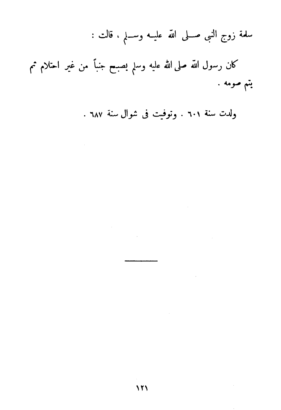 سَلَمَةَ زَوْجِ النَّبِيِّ صَلَّى اللَّهُ عَلَيْهِ وَسَلَّمَ قَالَتْ: {كَانَ رَسُولُ اللَّهِ صَلَّى اللَّهُ عَلَيْهِ وَسَلَّمَ يُصْبِحُ جُنُبًا مِنْ غَيْرِ احْتِلَامٍ ثُمَّ يُتِمُّ صَوْمَهُ} . وُلِدَتْ سَنَةَ 601 وَتُوُفِّيَتْ فِي شَوَّالٍ سَنَةَ 687.