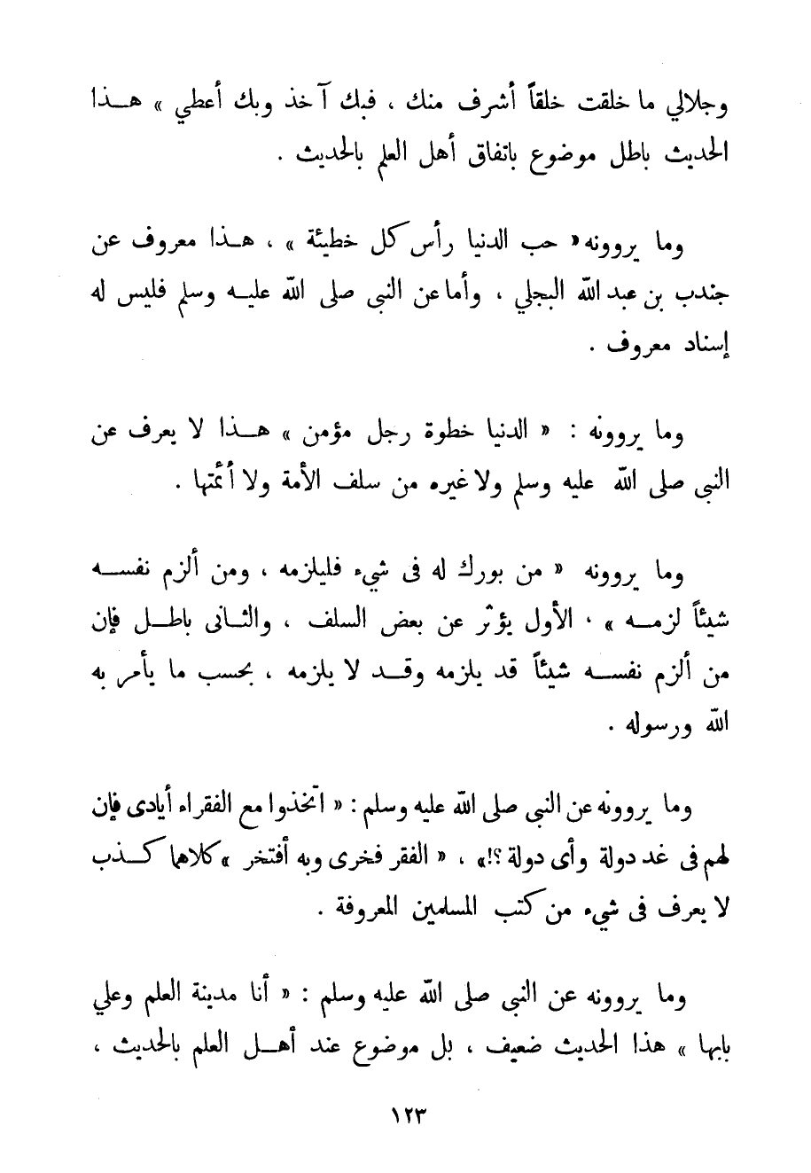وَجَلَالِي مَا خَلَقْت خَلْقًا أَشْرَفَ مِنْك فَبِك آخُذُ وَبِك أُعْطِي} هذا الْحَدِيثُ بَاطِلٌ مَوْضُوعٌ بِاتِّفَاقِ أَهْلِ الْعِلْمِ بِالْحَدِيثِ. وَمَا يَرْوُونَهُ {حُبُّ الدُّنْيَا رَأْسُ كُلِّ خَطِيئَةٍ} هَذَا مَعْرُوفٌ عَنْ جُنْدُبِ بْنِ عَبْدِ اللَّهِ البجلي وَأَمَّا عَنْ النَّبِيِّ صَلَّى اللَّهُ عَلَيْهِ وَسَلَّمَ فَلَيْسَ لَهُ إسْنَادٌ مَعْرُوفٌ. وَمَا يَرْوُونَهُ: {الدُّنْيَا خُطْوَةُ رَجُلٍ مُؤْمِنٍ} هَذَا لَا يُعْرَفُ عَنْ النَّبِيِّ صَلَّى اللَّهُ عَلَيْهِ وَسَلَّمَ وَلَا غَيْرِهِ مِنْ سَلَفِ الْأُمَّةِ وَلَا أَئِمَّتِهَا. وَمَا يَرْوُونَهُ {مَنْ بُورِكَ لَهُ فِي شَيْءٍ فَلْيَلْزَمْهُ وَمَنْ أَلْزَمَ نَفْسَهُ شَيْئًا لَزِمَهُ} الْأَوَّلُ يُؤْثَرُ عَنْ بَعْضِ السَّلَفِ وَالثَّانِي بَاطِلٌ فَإِنَّ مَنْ أَلْزَمَ نَفْسَهُ شَيْئًا قَدْ يَلْزَمُهُ وَقَدْ لَا يَلْزَمُهُ بِحَسَبِ مَا يَأْمُرُ بِهِ اللَّهُ وَرَسُولُهُ. وَمَا يَرْوُوهُ عَنْ النَّبِيِّ صَلَّى اللَّهُ عَلَيْهِ وَسَلَّمَ {اتَّخِذُوا مَعَ الْفُقَرَاءِ أَيَادِي فَإِنَّ لَهُمْ فِي غَد دَوْلَةً وَأَيُّ دَوْلَةٍ} {الْفَقْرُ فَخْرِي وَبِهِ افْتَخَرَ} كِلَاهُمَا كَذِبٌ لَا يُعْرَفُ فِي شَيْءٍ مِنْ كُتُبِ الْمُسْلِمِينَ الْمَعْرُوفَةِ. وَمَا يَرْوُونَهُ عَنْ النَّبِيِّ صَلَّى اللَّهُ عَلَيْهِ وَسَلَّمَ {أَنَا مَدِينَةُ الْعِلْمِ وَعَلِيٌّ بَابُهَا} هَذَا الْحَدِيثُ ضَعِيفٌ بَلْ مَوْضُوعٌ عِنْدَ أَهْلِ الْعِلْمِ بِالْحَدِيثِ