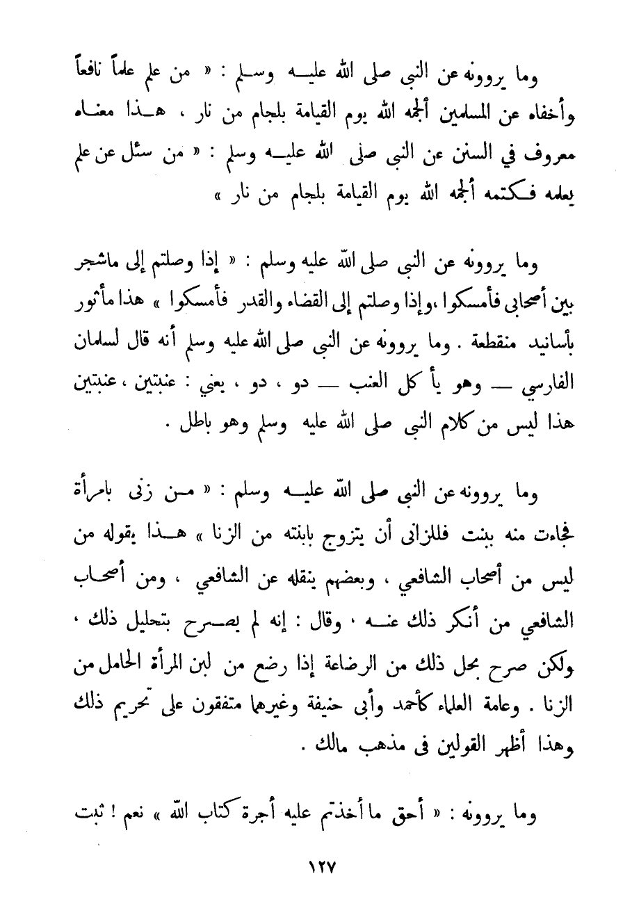 وَمَا يَرْوُونَهُ عَنْ النَّبِيِّ صَلَّى اللَّهُ عَلَيْهِ وَسَلَّمَ {مَنْ عَلِمَ عِلْمًا نَافِعًا وَأَخْفَاهُ عَنْ الْمُسْلِمِينَ أَلْجَمَهُ اللَّهُ يَوْمَ الْقِيَامَةِ بِلِجَامِ مِنْ نَارٍ} هَذَا مَعْنَاهُ مَعْرُوفٌ فِي السُّنَنِ عَنْ النَّبِيِّ صَلَّى اللَّهُ عَلَيْهِ وَسَلَّمَ {مَنْ سُئِلَ عَنْ عِلْمٍ يَعْلَمُهُ فَكَتَمَهُ أَلْجَمَهُ اللَّهُ يَوْمَ الْقِيَامَةِ بِلِجَامِ مِنْ نَارٍ} وَمَا يَرْوُونَهُ عَنْ النَّبِيِّ صَلَّى اللَّهُ عَلَيْهِ وَسَلَّمَ {إذَا وَصَلْتُمْ إلَى مَا شَجَرَ بَيْنَ أَصْحَابِي فَأَمْسِكُوا وَإِذَا وَصَلْتُمْ إلَى الْقَضَاءِ وَالْقَدَرِ فَأَمْسِكُوا} هَذَا مَأْثُورٌ بِأَسَانِيدَ مُنْقَطِعَةٍ. وَمَا يَرْوُونَهُ عَنْ {النَّبِيّ صَلَّى اللَّهُ عَلَيْهِ وَسَلَّمَ أَنَّهُ قَالَ لِسَلْمَانَ الْفَارِسِيِّ - وَهُوَ يَأْكُلُ الْعِنَبَ - دَوٍ دَوٍ يَعْنِي: عِنَبَتَيْنِ عِنَبَتَيْنِ} هَذَا لَيْسَ مِنْ كَلَامِ النَّبِيِّ صَلَّى اللَّهُ عَلَيْهِ وَسَلَّمَ وَهُوَ بَاطِلٌ. وَمَا يَرْوُونَهُ عَنْ النَّبِيِّ صَلَّى اللَّهُ عَلَيْهِ وَسَلَّمَ {مَنْ زَنَى بِامْرَأَةٍ فَجَاءَتْ مِنْهُ بِبِنْتٍ فَلِلزَّانِي أَنْ يَتَزَوَّجَ بِابْنَتِهِ مِنْ الزِّنَا} هَذَا يَقُولُهُ مَنْ لَيْسَ مِنْ أَصْحَابِ الشَّافِعِيِّ وَبَعْضُهُمْ يَنْقُلُهُ عَنْ الشَّافِعِيِّ وَمِنْ أَصْحَابِ الشَّافِعِيِّ مَنْ أَنْكَرَ ذَلِكَ عَنْهُ وَقَالَ: إنَّهُ لَمْ يُصَرِّحْ بِتَحْلِيلِ ذَلِكَ وَلَكِنْ صَرَّحَ بِحِلِّ ذَلِكَ مِنْ الرَّضَاعَةِ إذَا رَضَعَ مِنْ لَبَنِ الْمَرْأَةِ الْحَامِلِ مِنْ الزِّنَا. وَعَامَّةُ الْعُلَمَاءِ كَأَحْمَدَ وَأَبِي حَنِيفَةَ وَغَيْرِهِمَا مُتَّفِقُونَ عَلَى تَحْرِيمِ ذَلِكَ وَهَذَا أَظْهَرُ الْقَوْلَيْنِ فِي مَذْهَبِ مَالِكٍ.