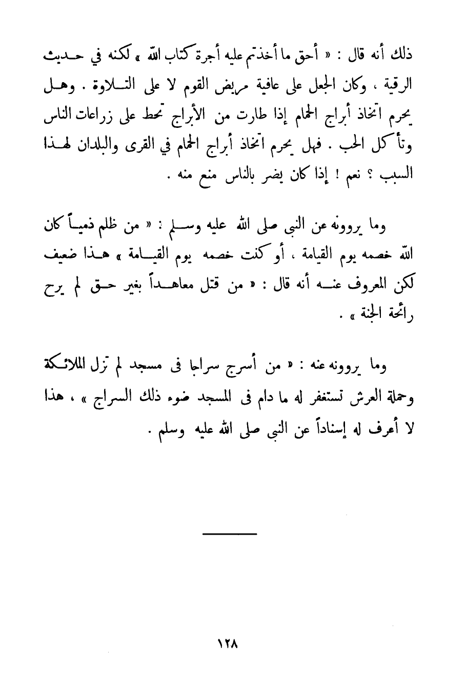 وَمَا يَرْوُونَهُ: {أَحَقُّ مَا أَخَذْتُمْ عَلَيْهِ أُجْرَةً كِتَابُ اللَّهِ} نَعَمْ ثَبَتَ ذَلِكَ أَنَّهُ قَالَ: {أَحَقُّ مَا أَخَذْتُمْ عَلَيْهِ أُجْرَةً كِتَابُ اللَّهِ} لَكِنَّهُ فِي حَدِيثِ الرُّقْيَةِ وَكَانَ الْجُعْلُ عَلَى عَافِيَةِ مَرِيضِ الْقَوْمِ لَا عَلَى التِّلَاوَةِ. وَهَلْ يَحْرُمُ اتِّخَاذُ أَبْرَاجِ الْحَمَامِ إذَا طَارَتْ مِنْ الْأَبْرَاجِ تَحُطُّ عَلَى زِرَاعَاتِ النَّاسِ وَتَأْكُلُ الْحَبَّ. فَهَلْ يَحْرُمُ اتِّخَاذُ أَبْرَاجِ الْحَمَامِ فِي الْقُرَى وَالْبُلْدَانِ لِهَذَا السَّبَبِ؟ نَعَمْ إذَا كَانَ يَضُرُّ بِالنَّاسِ مُنِعَ مِنْهُ. وَمَا يَرْوُونَهُ عَنْ النَّبِيِّ صَلَّى اللَّهُ عَلَيْهِ وَسَلَّمَ {مَنْ ظَلَمَ ذِمِّيًّا كَانَ اللَّهُ خَصْمَهُ يَوْمَ الْقِيَامَةِ أَوْ كُنْت خَصْمَهُ يَوْمَ الْقِيَامَةِ} هَذَا ضَعِيفٌ لَكِنْ الْمَعْرُوفُ عَنْهُ أَنَّهُ قَالَ: {مَنْ قَتَلَ مُعَاهَدًا بِغَيْرِ حَقٍّ لَمْ يُرِحْ رَائِحَةَ الْجَنَّةِ} . وَمَا يَرْوُونَهُ عَنْهُ: {مَنْ أَسْرَجَ سِرَاجًا فِي مَسْجِدٍ لَمْ تَزَلْ الْمَلَائِكَةُ وَحَمَلَةُ الْعَرْشِ تَسْتَغْفِرُ لَهُ مَا دَامَ فِي الْمَسْجِدِ ضَوْءُ ذَلِكَ السِّرَاجِ} هَذَا لَا أَعْرِفُ لَهُ إسْنَادًا عَنْ النَّبِيِّ صَلَّى اللَّهُ عَلَيْهِ وَسَلَّمَ.