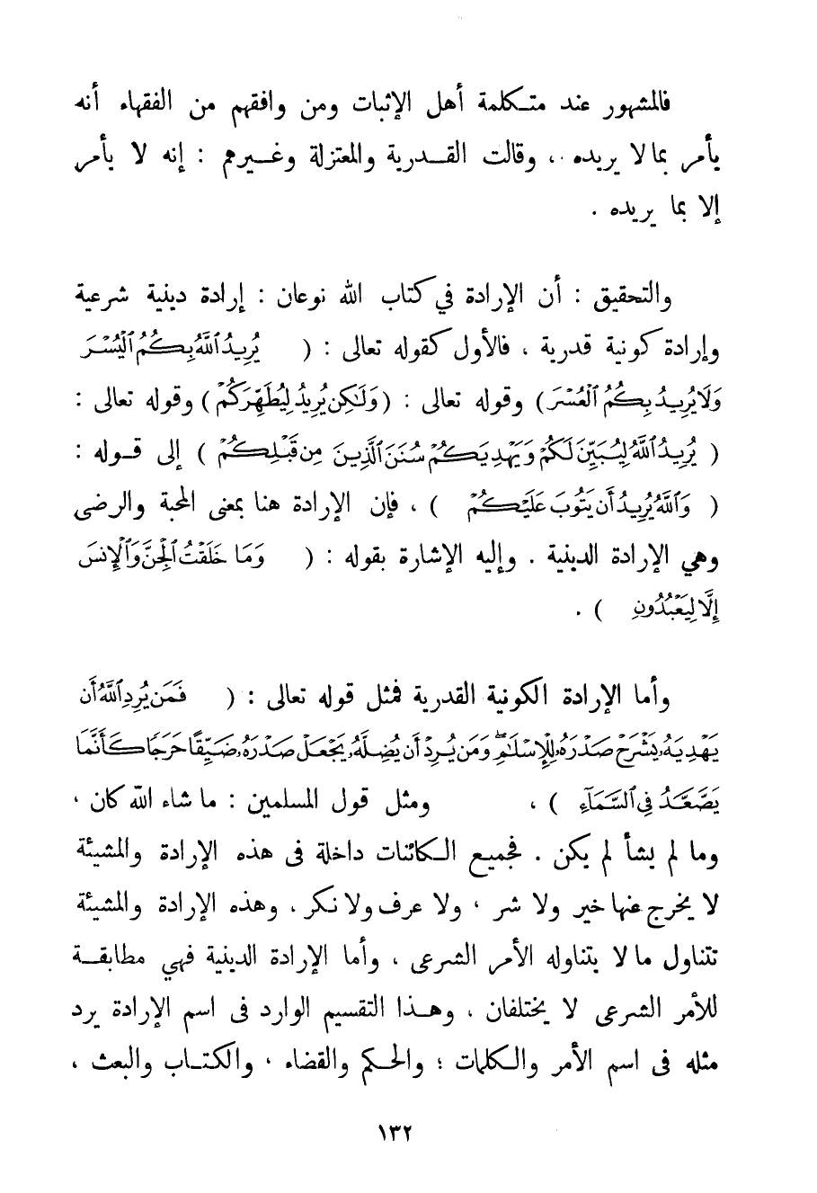 فَالْمَشْهُورُ عِنْدَ مُتَكَلِّمَةِ أَهْلِ الْإِثْبَاتِ وَمَنْ وَافَقَهُمْ مِنْ الْفُقَهَاءِ أَنَّهُ يَأْمُرُ بِمَا لَا يُرِيدُهُ وَقَالَتْ الْقَدَرِيَّةُ وَالْمُعْتَزِلَةُ وَغَيْرُهُمْ: إنَّهُ لَا يَأْمُرُ إلَّا بِمَا يُرِيدُهُ. وَالتَّحْقِيقُ: أَنَّ الْإِرَادَةَ فِي كِتَابِ اللَّهِ نَوْعَانِ: إرَادَةٌ دِينِيَّةٌ شَرْعِيَّةٌ وَإِرَادَةٌ كَوْنِيَّةٌ قَدَرِيَّةٌ: فَالْأَوَّلُ كَقَوْلِهِ تَعَالَى: {يُرِيدُ اللَّهُ بِكُمُ الْيُسْرَ وَلَا يُرِيدُ بِكُمُ الْعُسْرَ} وقَوْله تَعَالَى {وَلَكِنْ يُرِيدُ لِيُطَهِّرَكُمْ} وقَوْله تَعَالَى {يُرِيدُ اللَّهُ لِيُبَيِّنَ لَكُمْ وَيَهْدِيَكُمْ سُنَنَ الَّذِينَ مِنْ قَبْلِكُمْ} إلَى قَوْلِهِ: {وَاللَّهُ يُرِيدُ أَنْ يَتُوبَ عَلَيْكُمْ} فَإِنَّ الْإِرَادَةَ هُنَا بِمَعْنَى الْمَحَبَّةِ وَالرِّضَى وَهِيَ الْإِرَادَةُ الدِّينِيَّةُ. وَإِلَيْهِ الْإِشَارَةُ بِقَوْلِهِ: {وَمَا خَلَقْتُ الْجِنَّ وَالْإِنْسَ إلَّا لِيَعْبُدُونِ} . وَأَمَّا الْإِرَادَةُ الْكَوْنِيَّةُ الْقَدَرِيَّةُ فَمِثْلُ قَوْله تَعَالَى {فَمَنْ يُرِدِ اللَّهُ أَنْ يَهدِيَهُ يَشْرَحْ صَدْرَهُ لِلْإِسْلَامِ وَمَنْ يُرِدْ أَنْ يُضِلَّهُ يَجْعَلْ صَدْرَهُ ضَيِّقًا حَرَجًا كَأَنَّمَا يَصَّعَّدُ فِي السَّمَاءِ} وَمِثْلُ قَوْلِ الْمُسْلِمِينَ: مَا شَاءَ اللَّهُ كَانَ وَمَا لَمْ يَشَأْ لَمْ يَكُنْ. فَجَمِيعُ الْكَائِنَاتِ دَاخِلَةٌ فِي هَذِهِ الْإِرَادَةِ وَالْمَشِيئَةِ لَا يَخْرُجُ عَنْهَا خَيْرٌ وَلَا شَرٌّ وَلَا عُرْفٌ وَلَا نُكْرٌ وَهَذِهِ الْإِرَادَةُ وَالْمَشِيئَةُ تَتَنَاوَلُ مَا لَا يَتَنَاوَلُهُ الْأَمْرُ الشَّرْعِيُّ وَأَمَّا الْإِرَادَةُ الدِّينِيَّةُ فَهِيَ مُطَابِقَةٌ لِلْأَمْرِ الشَّرْعِيِّ لَا يَخْتَلِفَانِ وَهَذَا التَّقْسِيمُ الْوَارِدُ فِي اسْمِ الْإِرَادَةِ يُرَدُّ مِثْلُهُ فِي اسْمِ الْأَمْرِ وَالْكَلِمَاتِ؛ وَالْحُكْمِ