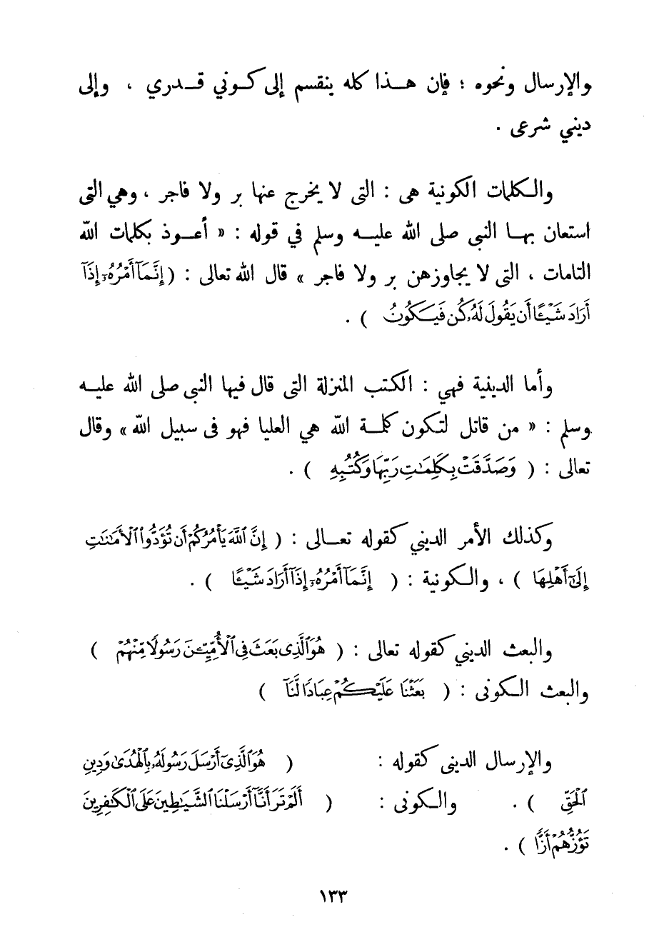 وَالْقَضَاءِ وَالْكِتَابِ وَالْبَعْثِ وَالْإِرْسَالِ وَنَحْوِهِ؛ فَإِنَّ هَذَا كُلَّهُ يَنْقَسِمُ إلَى كَوْنِيٍّ قَدَرِيٍّ وَإِلَى دِينِيٍّ شَرْعِيٍّ. وَالْكَلِمَاتُ الْكَوْنِيَّةُ هِيَ: الَّتِي لَا يَخْرُجُ عَنْهَا بَرٌّ وَلَا فَاجِرٌ وَهِيَ الَّتِي اسْتَعَانَ بِهَا النَّبِيُّ صَلَّى اللَّهُ عَلَيْهِ وَسَلَّمَ فِي قَوْلِهِ: {أَعُوذُ بِكَلِمَاتِ اللَّهِ التَّامَّاتِ الَّتِي لَا يُجَاوِزُهُنَّ بَرٌّ وَلَا فَاجِرٌ} قَالَ اللَّهُ تَعَالَى: {إنَّمَا أَمْرُهُ إذَا أَرَادَ شَيْئًا أَنْ يَقُولَ لَهُ كُنْ فَيَكُونُ} . وَأَمَّا الدِّينِيَّةُ فَهِيَ: الْكُتُبُ الْمُنَزَّلَةُ الَّتِي قَالَ فِيهَا النَّبِيُّ صَلَّى اللَّهُ عَلَيْهِ وَسَلَّمَ {مَنْ قَاتَلَ لِتَكُونَ كَلِمَةُ اللَّهِ هِيَ الْعُلْيَا فَهُوَ فِي سَبِيلِ اللَّهِ} وَقَالَ تَعَالَى: {وَصَدَّقَتْ بِكَلِمَاتِ رَبِّهَا وَكُتُبِهِ} . وَكَذَلِكَ الْأَمْرُ الدِّينِيُّ كَقَوْلِهِ تَعَالَى: {إنَّ اللَّهَ يَأْمُرُكُمْ أَنْ تُؤَدُّوا الْأَمَانَاتِ إلَى أَهْلِهَا} وَالْكَوْنِيَّةُ: {إنَّمَا أَمْرُهُ إذَا أَرَادَ شَيْئًا} . وَالْبَعْثُ الدِّينِيُّ كَقَوْلِهِ تَعَالَى: {هُوَ الَّذِي بَعَثَ فِي الْأُمِّيِّينَ رَسُولًا مِنْهُمْ} وَالْبَعْثُ الْكَوْنِيُّ: {بَعَثْنَا عَلَيْكُمْ عِبَادًا لَنَا} وَالْإِرْسَالُ الدِّينِيُّ كَقَوْلِهِ: {هُوَ الَّذِي أَرْسَلَ رَسُولَهُ بِالْهُدَى وَدِينِ الْحَقِّ} . وَالْكَوْنِيُّ: {أَلَمْ تَرَ أَنَّا أَرْسَلْنَا الشَّيَاطِينَ عَلَى الْكَافِرِينَ تَؤُزُّهُمْ أَزًّا} .