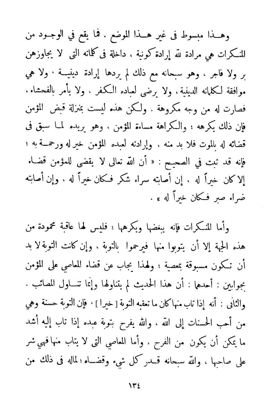 وَهَذَا مَبْسُوطٌ فِي غَيْرِ هَذَا الْمَوْضِعِ. فَمَا يَقَعُ فِي الْوُجُودِ مِنْ الْمُنْكَرَاتِ هِيَ مُرَادَةٌ لِلَّهِ إرَادَةً كَوْنِيَّةً دَاخِلَةً فِي كَلِمَاتِهِ الَّتِي لَا يُجَاوِزُهُنَّ بَرٌّ وَلَا فَاجِرٌ وَهُوَ سُبْحَانَهُ مَعَ ذَلِكَ لَمْ يُرِدْهَا إرَادَةً دِينِيَّةً وَلَا هِيَ مُوَافِقَةٌ لِكَلِمَاتِهِ الدِّينِيَّةِ وَلَا يَرْضَى لِعِبَادِهِ الْكُفْرَ وَلَا يَأْمُرُ بِالْفَحْشَاءِ فَصَارَتْ لَهُ مِنْ وَجْهٍ مَكْرُوهَةً. وَلَكِنَّ هَذِهِ لَيْسَتْ بِمَنْزِلَةِ قَبْضِ الْمُؤْمِنِ فَإِنَّ ذَلِكَ يَكْرَهُهُ؛ وَالْكَرَاهَةُ مُسَاءَةُ الْمُؤْمِنِ وَهُوَ يُرِيدُهُ لِمَا سَبَقَ فِي قَضَائِهِ لَهُ بِالْمَوْتِ فَلَا بُدَّ مِنْهُ وَإِرَادَتُهُ لِعَبْدِهِ الْمُؤْمِنِ خَيْرٌ لَهُ وَرَحْمَةٌ بِهِ؛ فَإِنَّهُ قَدْ ثَبَتَ فِي الصَّحِيحِ: {أَنَّ اللَّهَ تَعَالَى لَا يَقْضِي لِلْمُؤْمِنِ قَضَاءً إلَّا كَانَ خَيْرًا لَهُ إنْ أَصَابَتْهُ سَرَّاءُ شَكَرَ فَكَانَ خَيْرًا لَهُ وَإِنْ أَصَابَتْهُ ضَرَّاءُ صَبَرَ فَكَانَ خَيْرًا لَهُ} . وَأَمَّا الْمُنْكَرَاتُ فَإِنَّهُ يُبْغِضُهَا وَيَكْرَهُهَا؛ فَلَيْسَ لَهَا عَاقِبَةٌ مَحْمُودَةٌ مِنْ هَذِهِ الْجِهَةِ إلَّا أَنْ يَتُوبُوا مِنْهَا فَيُرْحَمُوا بِالتَّوْبَةِ وَإِنْ كَانَتْ التَّوْبَةُ لَا بُدَّ أَنْ تَكُونَ مَسْبُوقَةً بِمَعْصِيَةِ؛ وَلِهَذَا يُجَابُ عَنْ قَضَاءِ الْمَعَاصِي عَلَى الْمُؤْمِنِ بِجَوَابَيْنِ: أَحَدُهُمَا: أَنَّ هَذَا الْحَدِيثَ لَمْ يَتَنَاوَلْهَا وَإِنَّمَا تَنَاوَلَ الْمَصَائِبَ. وَالثَّانِي: أَنَّهُ إذَا تَابَ مِنْهَا كَانَ مَا تَعْقُبُهُ التَّوْبَةُ خَيْرًا فَإِنَّ التَّوْبَةَ حَسَنَةٌ وَهِيَ مِنْ أَحَبِّ الْحَسَنَاتِ إلَى اللَّهِ وَاَللَّهُ يَفْرَحُ بِتَوْبَةِ عَبْدِهِ إذَا تَابَ إلَيْهِ أَشَدُّ مَا يُمْكِنُ أَنْ يَكُونَ مِنْ الْفَرَحِ وَأَمَّا الْمَعَاصِي الَّتِي لَا يُتَابَا مِنْهَا فَهِيَ شَرٌّ. عَلَى صَاحِبِهَا وَاَللَّهُ سُبْحَانَهُ قَدَّرَ كُلَّ شَيْءٍ وَقَضَاهُ؛ لِمَا لَهُ فِي ذَلِكَ مِنْ