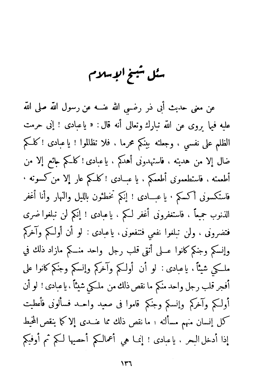 عَنْ مَعْنَى حَدِيثِ أَبِي ذَرٍّ رَضِيَ اللَّهُ عَنْهُ عَنْ رَسُولِ اللَّهِ صَلَّى اللَّهُ عَلَيْهِ وَسَلَّمَ فِيمَا يُرْوَى عَنْ اللَّهِ تَبَارَكَ وَتَعَالَى أَنَّهُ قَالَ: " {يَا عِبَادِي إنِّي حَرَّمْت الظُّلْمَ عَلَى نَفْسِي وَجَعَلْته بَيْنَكُمْ مُحَرَّمًا فَلَا تظالموا يَا عِبَادِي كُلُّكُمْ ضَالٌّ إلَّا مَنْ هَدَيْته فَاسْتَهْدُونِي أَهْدِكُمْ يَا عِبَادِي كُلُّكُمْ جَائِعٌ إلَّا مَنْ أَطْعَمْته فَاسْتَطْعِمُونِي أُطْعِمْكُمْ يَا عِبَادِي كُلُّكُمْ عَارٍ إلَّا مَنْ كَسَوْته فَاسْتَكْسُونِي أَكْسُكُمْ يَا عِبَادِي إنَّكُمْ تُخْطِئُونَ بِاللَّيْلِ وَالنَّهَارِ وَأَنَا أَغْفِرُ الذُّنُوبَ جَمِيعًا فَاسْتَغْفِرُونِي أَغْفِرْ لَكُمْ يَا عِبَادِي إنَّكُمْ لَنْ تَبْلُغُوا ضُرِّي فَتَضُرُّونِي وَلَنْ تَبْلُغُوا نَفْعِي فَتَنْفَعُونِي يَا عِبَادِي لَوْ أَنَّ أَوَّلَكُمْ وَآخِرَكُمْ وَإِنْسَكُمْ وَجِنَّكُمْ كَانُوا عَلَى أَتْقَى قَلْبِ رَجُلٍ وَاحِدٍ مِنْكُمْ مَا زَادَ ذَلِكَ فِي مُلْكِي شَيْئًا يَا عِبَادِي: لَوْ أَنَّ أَوَّلَكُمْ وَآخِرَكُمْ وَإِنْسَكُمْ وَجِنَّكُمْ كَانُوا عَلَى أَفْجَرِ قَلْبِ رَجُلٍ وَاحِدٍ مِنْكُمْ مَا نَقَصَ ذَلِكَ مِنْ مُلْكِي شَيْئًا يَا عِبَادِي لَوْ أَنَّ أَوَّلَكُمْ وَآخِرَكُمْ وَإِنْسَكُمْ وَجِنَّكُمْ قَامُوا فِي صَعِيدٍ وَاحِدٍ فَسَأَلُونِي فَأَعْطَيْت كُلَّ إنْسَانٍ مِنْهُمْ مَسْأَلَتَهُ؛ مَا نَقَصَ ذَلِكَ مِمَّا عِنْدِي إلَّا كَمَا يَنْقُصُ الْمَخِيطُ إذَا أُدْخِلَ الْبَحْرَ يَا عِبَادِي إنَّمَا هِيَ أَعْمَالُكُمْ أُحْصِيهَا لَكُمْ ثُمَّ أُوَفِّيكُمْ