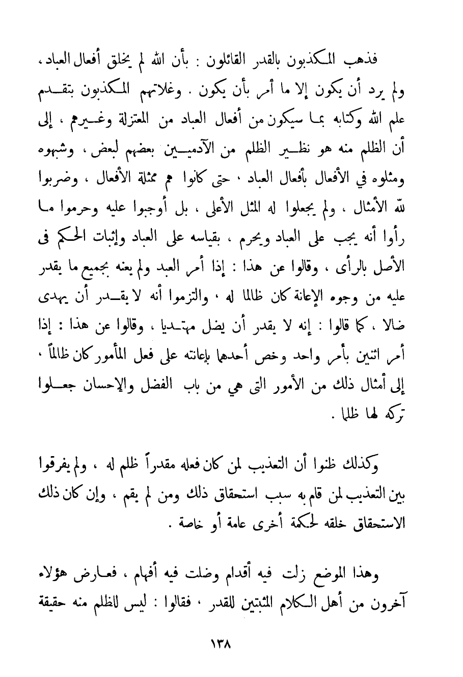 فَذَهَبَ الْمُكَذِّبُونَ بِالْقَدَرِ الْقَائِلُونَ: بِأَنَّ اللَّهَ لَمْ يَخْلُقْ أَفْعَالَ الْعِبَادِ وَلَمْ يُرِدْ أَنْ يَكُونَ إلَّا مَا أَمَرَ بِأَنْ يَكُونَ. وَغُلَاتُهُمْ الْمُكَذِّبُونَ بِتَقَدُّمِ عِلْمِ اللَّهِ وَكِتَابِهِ بِمَا سَيَكُونُ مِنْ أَفْعَالِ الْعِبَادِ مِنْ الْمُعْتَزِلَةِ وَغَيْرِهِمْ إلَى أَنَّ الظُّلْمَ مِنْهُ هُوَ نَظِيرُ الظُّلْمِ مِنْ الْآدَمِيِّينَ بَعْضُهُمْ لِبَعْضِ وَشَبَّهُوهُ وَمَثَّلُوهُ فِي الْأَفْعَالِ بِأَفْعَالِ الْعِبَادِ حَتَّى كَانُوا هُمْ مُمَثِّلَةَ الْأَفْعَالِ وَضَرَبُوا لِلَّهِ الْأَمْثَالَ وَلَمْ يَجْعَلُوا لَهُ الْمَثَلَ الْأَعْلَى بَلْ أَوْجَبُوا عَلَيْهِ وَحَرَّمُوا مَا رَأَوْا أَنَّهُ يَجِبُ عَلَى الْعِبَادِ وَيَحْرُمُ بِقِيَاسِهِ عَلَى الْعِبَادِ وَإِثْبَاتِ الْحُكْمِ فِي الْأَصْلِ بِالرَّأْيِ وَقَالُوا عَنْ هَذَا: إذَا أَمَرَ الْعَبْدَ وَلَمْ يَعْنِهِ بِجَمِيعِ مَا يَقْدِرُ عَلَيْهِ مِنْ وُجُوهِ الْإِعَانَةِ كَانَ ظَالِمًا لَهُ وَالْتَزَمُوا أَنَّهُ لَا يَقْدِرُ أَنْ يَهْدِيَ ضَالًّا كَمَا قَالُوا: إنَّهُ لَا يَقْدِرُ أَنْ يَضِلَّ مُهْتَدِيًا وَقَالُوا مِنْ هَذَا: إذَا أَمَرَ اثْنَيْنِ بِأَمْرِ وَاحِدٍ وَخَصَّ أَحَدَهُمَا بِإِعَانَتِهِ عَلَى فِعْلِ الْمَأْمُورِ كَانَ ظَالِمًا إلَى أَمْثَالِ ذَلِكَ مِنْ الْأُمُورِ الَّتِي هِيَ مِنْ بَابِ الْفَضْلِ وَالْإِحْسَانِ جَعَلُوا تَرْكَهُ لَهَا ظُلْمًا. وَكَذَلِكَ ظَنُّوا أَنَّ التَّعْذِيبَ لِمَنْ كَانَ فِعْلُهُ مُقَدَّرًا ظُلْمٌ لَهُ وَلَمْ يُفَرِّقُوا بَيْنَ التَّعْذِيبِ لِمَنْ قَامَ بِهِ سَبَبُ اسْتِحْقَاقِ ذَلِكَ وَمَنْ لَمْ يَقُمْ وَإِنْ كَانَ ذَلِكَ الِاسْتِحْقَاقُ خَلَقَهُ لِحِكْمَةِ أُخْرَى عَامَّةٍ أَوْ خَاصَّةٍ. وَهَذَا الْمَوْضِعُ زَلَّتْ فِيهِ أَقْدَامٌ وَضَلَّتْ فِيهِ أَفْهَامٌ فَعَارَضَ هَؤُلَاءِ آخَرُونَ مِنْ أَهْلِ الْكَلَامِ الْمُثْبِتِينَ لِلْقَدَرِ فَقَالُوا: لَيْسَ لِلظُّلْمِ مِنْهُ حَقِيقَةٌ