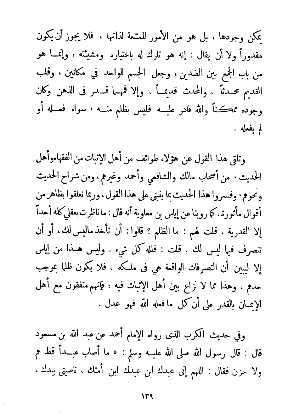 يُمْكِنُ وُجُودُهَا بَلْ هُوَ مِنْ الْأُمُورِ الْمُمْتَنِعَةِ لِذَاتِهَا فَلَا يَجُوزُ أَنْ يَكُونَ مَقْدُورًا وَلَا أَنْ يُقَالَ: إنَّهُ هُوَ تَارِكٌ لَهُ بِاخْتِيَارِهِ وَمَشِيئَتِهِ وَإِنَّمَا هُوَ مِنْ بَابِ الْجَمْعِ بَيْنَ الضِّدَّيْنِ وَجَعْلِ الْجِسْمِ الْوَاحِدِ فِي مَكَانَيْنِ وَقَلْبِ الْقَدِيمِ مُحْدَثًا وَالْمُحْدَثِ قَدِيمًا وَإِلَّا فَمَهْمَا قُدِّرَ فِي الذِّهْنِ وَكَانَ وُجُودُهُ مُمْكِنًا وَاَللَّهُ قَادِرٌ عَلَيْهِ فَلَيْسَ بِظُلْمِ مِنْهُ؛ سَوَاءٌ فَعَلَهُ أَوْ لَمْ يَفْعَلْهُ. وَتَلَقَّى هَذَا الْقَوْلَ عَنْ هَؤُلَاءِ طَوَائِفُ مِنْ أَهْلِ الْإِثْبَاتِ مِنْ الْفُقَهَاءِ وَأَهْلِ الْحَدِيثِ مِنْ أَصْحَابِ مَالِكٍ وَالشَّافِعِيِّ وَأَحْمَد وَغَيْرِهِمْ وَمِنْ شُرَّاحِ الْحَدِيثِ وَنَحْوِهِمْ وَفَسَّرُوا هَذَا الْحَدِيثَ بِمَا يَنْبَنِي عَلَى هَذَا الْقَوْلِ وَرُبَّمَا تَعَلَّقُوا بِظَاهِرِ مِنْ أَقْوَالٍ مَأْثُورَةٍ كَمَا رَوَيْنَا عَنْ إيَاسِ بْنِ مُعَاوِيَةَ أَنَّهُ قَالَ: مَا نَاظَرْت بِعَقْلِي كُلِّهِ أَحَدًا إلَّا الْقَدَرِيَّةُ قُلْت لَهُمْ: مَا الظُّلْمُ؟ قَالُوا: أَنْ تَأْخُذَ مَا لَيْسَ لَك أَوْ أَنْ تَتَصَرَّفَ فِيمَا لَيْسَ لَك. قُلْت: فَلِلَّهِ كُلُّ شَيْءٍ. وَلَيْسَ هَذَا مِنْ إيَاسٍ إلَّا لِيُبَيِّنَ أَنَّ التَّصَرُّفَاتِ الْوَاقِعَةَ هِيَ فِي مِلْكِهِ فَلَا يَكُونُ ظُلْمًا بِمُوجِبِ حَدِّهِمْ وَهَذَا مِمَّا لَا نِزَاعَ بَيْنَ أَهْلِ الْإِثْبَاتِ فِيهِ؛ فَإِنَّهُمْ مُتَّفِقُونَ مَعَ أَهْلِ الْإِيمَانِ بِالْقَدَرِ عَلَى أَنَّ كُلَّ مَا فَعَلَهُ اللَّهُ فَهُوَ عَدْلٌ. وَفِي حَدِيثِ الْكُرَبِ الَّذِي رَوَاهُ الْإِمَامُ أَحْمَد عَنْ عَبْدِ اللَّهِ بْنِ مَسْعُودٍ قَالَ: قَالَ رَسُولُ اللَّهِ صَلَّى اللَّهُ عَلَيْهِ وَسَلَّمَ " {مَا أَصَابَ عَبْدًا قَطُّ هَمٌّ وَلَا حُزْنٌ فَقَالَ: اللَّهُمَّ إنِّي عَبْدُك ابْنُ عَبْدِك ابْنُ أُمَّتِك نَاصِيَتِي بِيَدِك
