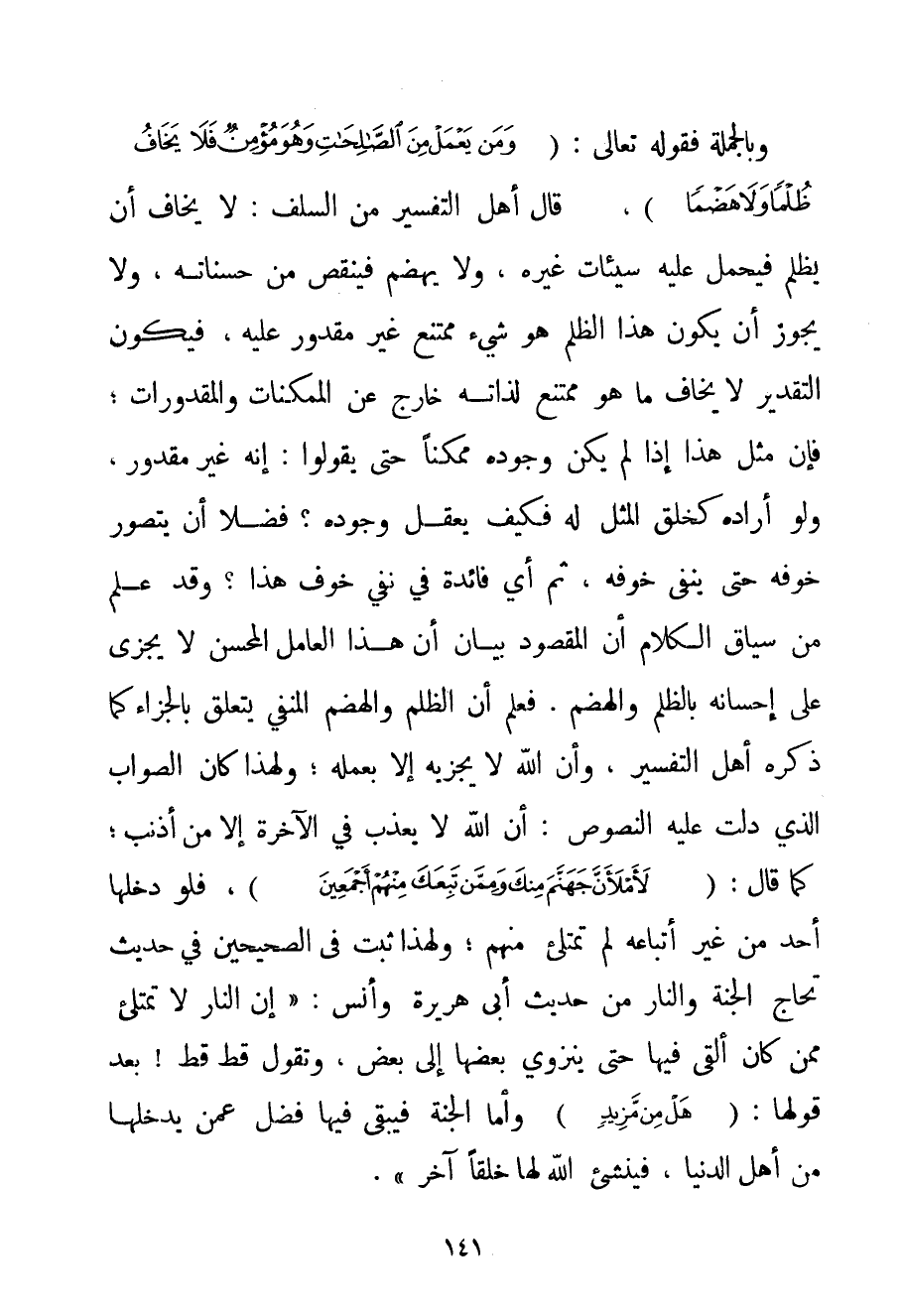 وَبِالْجُمْلَةِ فَقَوْلُهُ تَعَالَى: {وَمَنْ يَعْمَلْ مِنَ الصَّالِحَاتِ وَهُوَ مُؤْمِنٌ فَلَا يَخَافُ ظُلْمًا وَلَا هَضْمًا} قَالَ أَهْلُ التَّفْسِيرِ مِنْ السَّلَفِ: لَا يَخَافُ أَنْ يُظْلَمَ فَيُحْمَلَ عَلَيْهِ سَيِّئَاتُ غَيْرِهِ وَلَا يُهْضَمَ فَيُنْقَصَ مِنْ حَسَنَاتِهِ وَلَا يَجُوزُ أَنْ يَكُونَ هَذَا الظُّلْمُ هُوَ شَيْءٌ مُمْتَنِعٌ غَيْرُ مَقْدُورٍ عَلَيْهِ فَيَكُونُ التَّقْدِيرُ لَا يَخَافُ مَا هُوَ مُمْتَنِعٌ لِذَاتِهِ خَارِجٌ عَنْ الْمُمْكِنَاتِ وَالْمَقْدُورَاتِ؛ فَإِنَّ مِثْلَ هَذَا إذَا لَمْ يَكُنْ وُجُودُهُ مُمْكِنًا حَتَّى يَقُولُوا: أَنَّهُ غَيْرُ مَقْدُورٍ وَلَوْ أَرَادَهُ كَخَلْقِ الْمِثْلِ لَهُ فَكَيْفَ يُعْقَلُ وُجُودُهُ؟ فَضْلًا أَنْ يُتَصَوَّرَ خَوْفُهُ حَتَّى يَنْفِيَ خَوْفَهُ ثُمَّ أَيُّ فَائِدَةٍ فِي نَفْيِ خَوْفِ هَذَا؟ وَقَدْ عُلِمَ مِنْ سِيَاقِ الْكَلَامِ أَنَّ الْمَقْصُودَ بَيَانُ أَنَّ هَذَا الْعَامِلَ الْمُحْسِنَ لَا يُجْزَى عَلَى إحْسَانِهِ بِالظُّلْمِ وَالْهَضْمِ. فَعُلِمَ أَنَّ الظُّلْمَ وَالْهَضْمَ الْمَنْفِيَّ يَتَعَلَّقُ بِالْجَزَاءِ كَمَا ذَكَرَهُ أَهْلُ التَّفْسِيرِ وَأَنَّ اللَّهَ لَا يَجْزِيهِ إلَّا بِعَمَلِهِ؛ وَلِهَذَا كَانَ الصَّوَابُ الَّذِي دَلَّتْ عَلَيْهِ النُّصُوصُ: أَنَّ اللَّهَ لَا يُعَذِّبُ فِي الْآخِرَةِ إلَّا مَنْ أَذْنَبَ؛ كَمَا قَالَ: {لَأَمْلَأَنَّ جَهَنَّمَ مِنْكَ وَمِمَّنْ تَبِعَكَ مِنْهُمْ أَجْمَعِينَ} فَلَوْ دَخَلَهَا أَحَدٌ مِنْ غَيْرِ أَتْبَاعِهِ لَمْ تَمْتَلِئْ مِنْهُمْ؛ وَلِهَذَا ثَبَتَ فِي الصَّحِيحَيْنِ فِي حَدِيثِ تَحَاجِّ الْجَنَّةِ وَالنَّارِ مِنْ حَدِيثِ أَبِي هُرَيْرَةَ وَأَنَسٍ: " {إنَّ النَّارَ لَا تَمْتَلِئُ مِمَّنْ كَانَ أُلْقِيَ فِيهَا حَتَّى يَنْزَوِيَ بَعْضُهَا إلَى بَعْضٍ وَتَقُولَ قَطْ قَطْ بَعْدَ قَوْلِهَا: {هَلْ مِنْ مَزِيدٍ} وَأَمَّا الْجَنَّةُ فَيَبْقَى فِيهَا فَضْلٌ عَمَّنْ يَدْخُلُهَا مِنْ أَهْلِ الدُّنْيَا فَيُنْشِئُ اللَّهُ لَهَا خَلْقًا آخَرَ} ".