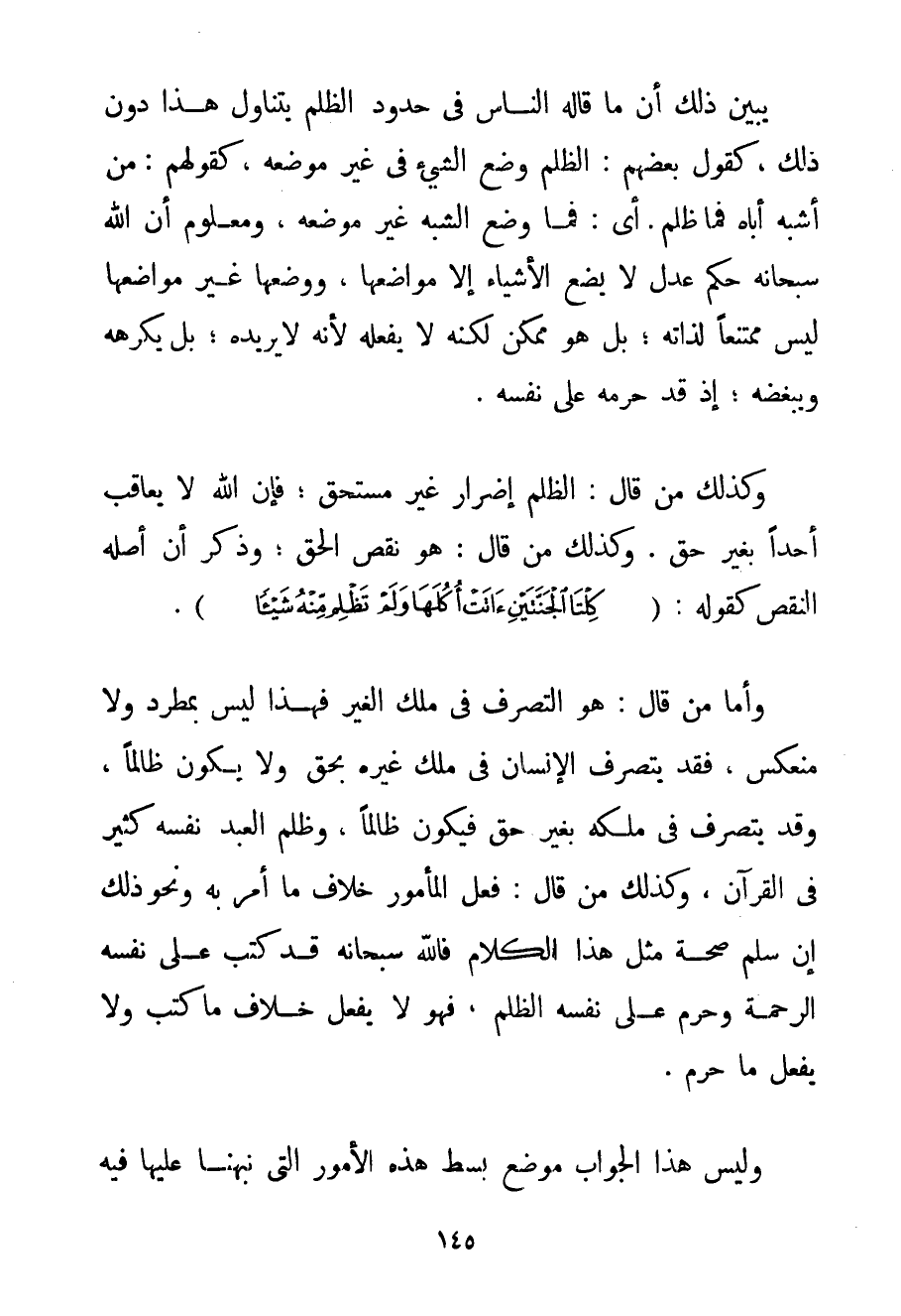 يُبَيِّنُ ذَلِكَ أَنَّ مَا قَالَهُ النَّاسُ فِي حُدُودِ الظُّلْمِ يَتَنَاوَلُ هَذَا دُونَ ذَلِكَ كَقَوْلِ بَعْضِهِمْ: الظُّلْمُ وَضْعُ الشَّيْءِ فِي غَيْرِ مَوْضِعِهِ كَقَوْلِهِمْ: مَنْ أَشْبَهَ أَبَاهُ فَمَا ظَلَمَ. أَيْ: فَمَا وَضَعَ الشَّبَهَ غَيْرَ مَوْضِعِهِ وَمَعْلُومٌ أَنَّ اللَّهَ سُبْحَانَهُ حَكَمٌ عَدْلٌ لَا يَضَعُ الْأَشْيَاءَ إلَّا مَوَاضِعَهَا وَوَضْعُهَا غَيْرَ مَوَاضِعِهَا لَيْسَ مُمْتَنِعًا لِذَاتِهِ؛ بَلْ هُوَ مُمْكِنٌ لَكِنَّهُ لَا يَفْعَلُهُ لِأَنَّهُ لَا يُرِيدُهُ؛ بَلْ يَكْرَهُهُ وَيُبْغِضُهُ؛ إذْ قَدْ حَرَّمَهُ عَلَى نَفْسِهِ. وَكَذَلِكَ مَنْ قَالَ: الظُّلْمُ إضْرَارٌ غَيْرُ مُسْتَحَقٍّ؛ فَإِنَّ اللَّهَ لَا يُعَاقِبُ أَحَدًا بِغَيْرِ حَقٍّ. وَكَذَلِكَ مَنْ قَالَ: هُوَ نَقْصُ الْحَقِّ؛ وَذَكَرَ أَنَّ أَصْلَهُ النَّقْصُ كَقَوْلِهِ: {كِلْتَا الْجَنَّتَيْنِ آتَتْ أُكُلَهَا وَلَمْ تَظْلِمْ مِنْهُ شَيْئًا} . وَأَمَّا مَنْ قَالَ: هُوَ التَّصَرُّفُ فِي مِلْكِ الْغَيْرِ فَهَذَا لَيْسَ بِمُطَّرِدِ وَلَا مُنْعَكِسٍ فَقَدْ يَتَصَرَّفُ الْإِنْسَانُ فِي مِلْكِ غَيْرِهِ بِحَقِّ وَلَا يَكُونُ ظَالِمًا وَقَدْ يَتَصَرَّفُ فِي مِلْكِهِ بِغَيْرِ حَقٍّ فَيَكُونُ ظَالِمًا وَظُلْمُ الْعَبْدِ نَفْسَهُ كَثِيرٌ فِي الْقُرْآنِ. وَكَذَلِكَ مَنْ قَالَ: فِعْلُ الْمَأْمُورِ خِلَافُ مَا أَمَرَ بِهِ وَنَحْوُ ذَلِكَ إنْ سَلِمَ صِحَّةُ مِثْلِ هَذَا الْكَلَامِ فَاَللَّهُ سُبْحَانَهُ قَدْ كَتَبَ عَلَى نَفْسِهِ الرَّحْمَةَ وَحَرَّمَ عَلَى نَفْسِهِ الظُّلْمَ فَهُوَ لَا يَفْعَلُ خِلَافَ مَا كَتَبَ وَلَا يَفْعَلُ مَا حَرَّمَ. وَلَيْسَ هَذَا الْجَوَابُ مَوْضِعَ بَسْطِ هَذِهِ الْأُمُورِ الَّتِي نَبَّهْنَا عَلَيْهَا فِيهِ