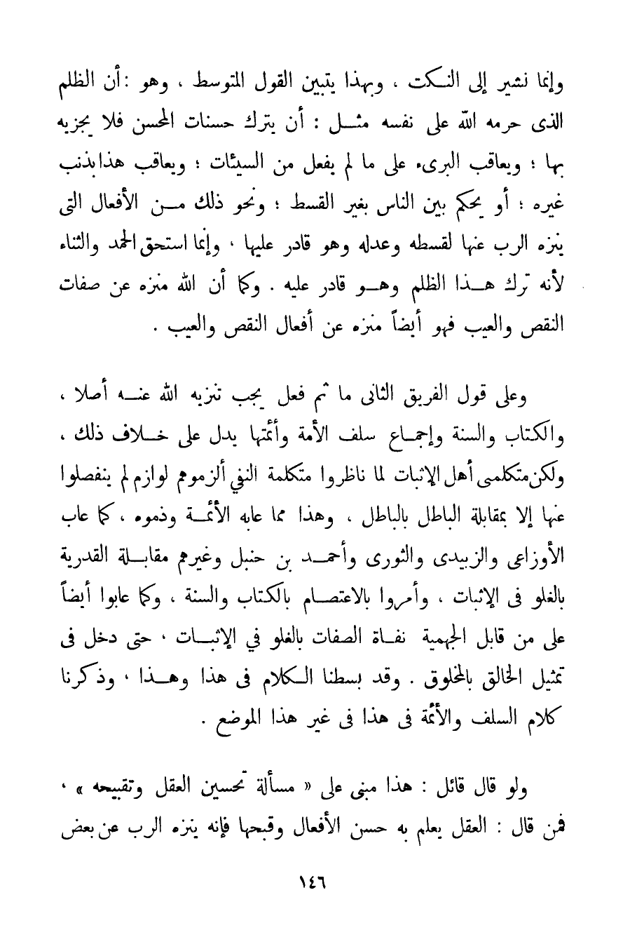 وَإِنَّمَا نُشِيرُ إلَى النُّكَتِ وَبِهَذَا يَتَبَيَّنُ الْقَوْلُ الْمُتَوَسِّطُ وَهُوَ: أَنَّ الظُّلْمَ الَّذِي حَرَّمَهُ اللَّهُ عَلَى نَفْسِهِ مِثْلَ: أَنْ يَتْرُكَ حَسَنَاتِ الْمُحْسِنِ فَلَا يَجْزِيهِ بِهَا؛ وَيُعَاقِبَ الْبَرِيءَ عَلَى مَا لَمْ يَفْعَلْ مِنْ السَّيِّئَاتِ؛ وَيُعَاقِبَ هَذَا بِذَنْبِ غَيْرِهِ؛ أَوْ يَحْكُمَ بَيْنَ النَّاسِ بِغَيْرِ الْقِسْطِ؛ وَنَحْوَ ذَلِكَ مِنْ الْأَفْعَالِ الَّتِي يُنَزَّهُ الرَّبُّ عَنْهَا لِقِسْطِهِ وَعَدْلِهِ وَهُوَ قَادِرٌ عَلَيْهَا وَإِنَّمَا اسْتَحَقَّ الْحَمْدَ وَالثَّنَاءَ لِأَنَّهُ تَرَكَ هَذَا الظُّلْمَ وَهُوَ قَادِرٌ عَلَيْهِ. وَكَمَا أَنَّ اللَّهَ مُنَزَّهٌ عَنْ صِفَاتِ النَّقْصِ وَالْعَيْبِ فَهُوَ أَيْضًا مُنَزَّهٌ عَنْ أَفْعَالِ النَّقْصِ وَالْعَيْبِ. وَعَلَى قَوْلِ الْفَرِيقِ الثَّانِي مَا ثَمَّ فَعَلَ يَجِبُ تَنْزِيهُ اللَّهِ عَنْهُ أَصْلًا وَالْكِتَابُ وَالسُّنَّةُ وَإِجْمَاعُ سَلَفِ الْأُمَّةِ وَأَئِمَّتِهَا يَدُلُّ عَلَى خِلَافِ ذَلِكَ وَلَكِنَّ مُتَكَلِّمِي أَهْلِ الْإِثْبَاتِ لَمَّا نَاظَرُوا مُتَكَلِّمَةَ النَّفْيِ أَلْزَمُوهُمْ لَوَازِمَ لَمْ يَنْفَصِلُوا عَنْهَا إلَّا بِمُقَابَلَةِ الْبَاطِلِ بِالْبَاطِلِ وَهَذَا مِمَّا عَابَهُ الْأَئِمَّةُ وَذَمُّوهُ كَمَا عَابَ الأوزاعي وَالزُّبَيْدِيُّ وَالثَّوْرِيّ وَأَحْمَد بْنُ حَنْبَلٍ وَغَيْرُهُمْ مُقَابَلَةَ الْقَدَرِيَّةِ بِالْغُلُوِّ فِي الْإِثْبَاتِ وَأَمَرُوا بِالِاعْتِصَامِ بِالْكِتَابِ وَالسُّنَّةِ وَكَمَا عَابُوا أَيْضًا عَلَى مَنْ قَابَلَ الْجَهْمِيَّة نفاة الصِّفَاتِ بِالْغُلُوِّ فِي الْإِثْبَاتِ حَتَّى دَخَلَ فِي تَمْثِيلِ الْخَالِقِ بِالْمَخْلُوقِ. وَقَدْ بَسَطْنَا الْكَلَامَ فِي هَذَا وَهَذَا وَذَكَرْنَا كَلَامَ السَّلَفِ وَالْأَئِمَّةِ فِي هَذَا فِي غَيْرِ هَذَا الْمَوْضِعِ. وَلَوْ قَالَ قَائِلٌ: هَذَا مَبْنِيٌّ عَلَى " مَسْأَلَةِ تَحْسِينِ الْعَقْلِ وَتَقْبِيحِهِ " فَمَنْ قَالَ: الْعَقْلُ يُعْلَمُ بِهِ حُسْنُ الْأَفْعَالِ وَقُبْحُهَا فَإِنَّهُ يُنَزِّهُ الرَّبَّ عَنْ بَعْضِ