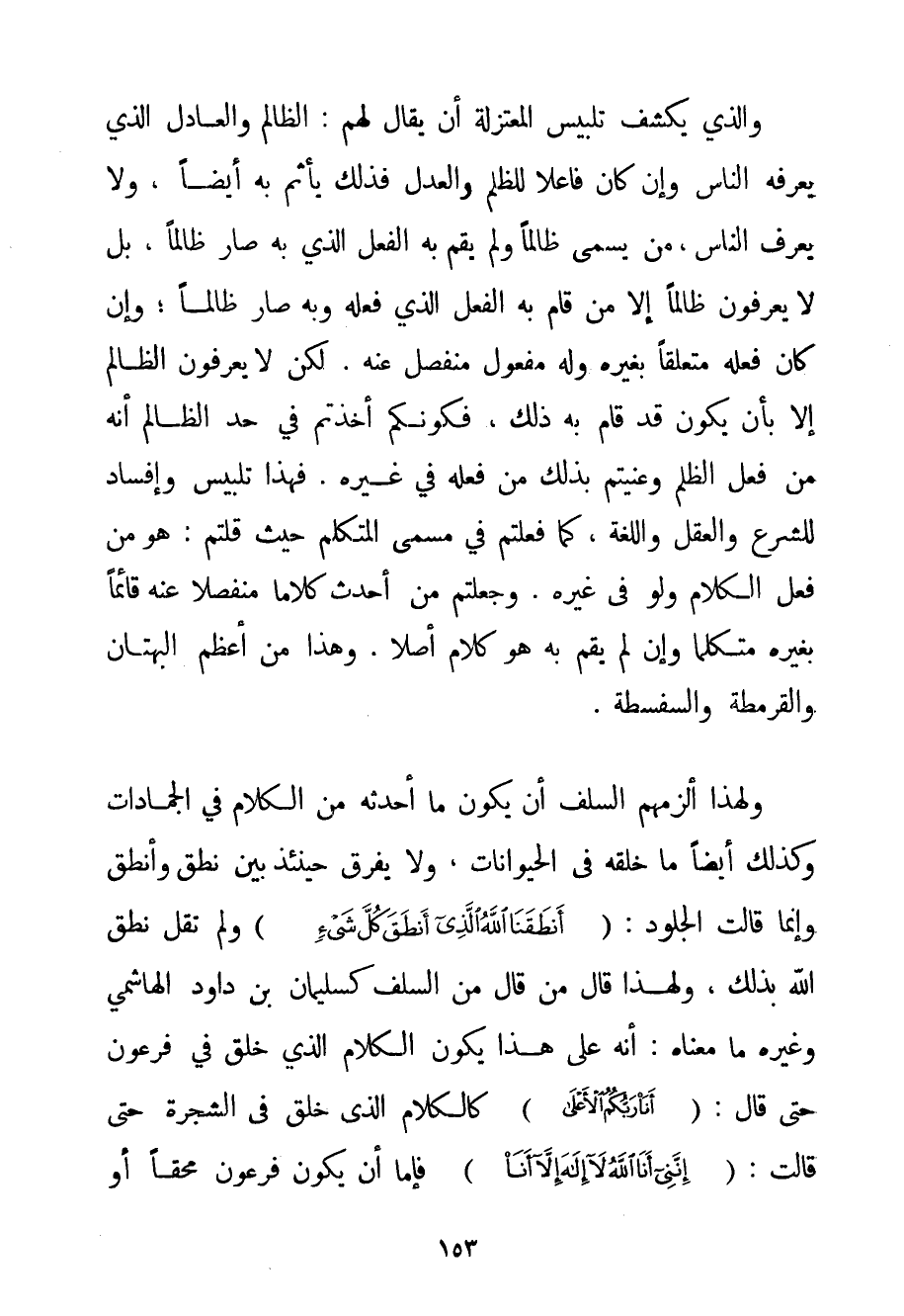 وَاَلَّذِي يَكْشِفُ تَلْبِيسَ الْمُعْتَزِلَةِ أَنْ يُقَالَ لَهُمْ: الظَّالِمُ وَالْعَادِلُ الَّذِي يَعْرِفُهُ النَّاسُ وَإِنْ كَانَ فَاعِلًا لِلظُّلْمِ وَالْعَدْلِ فَذَلِكَ يَأْثَمُ بِهِ أَيْضًا وَلَا يَعْرِفُ النَّاسُ مَنْ يُسَمَّى ظَالِمًا وَلَمْ يَقُمْ بِهِ الْفِعْلُ الَّذِي بِهِ صَارَ ظَالِمًا بَلْ لَا يَعْرِفُونَ ظَالِمًا إلَّا مَنْ قَامَ بِهِ الْفِعْلُ الَّذِي فَعَلَهُ وَبِهِ صَارَ ظَالِمًا؛ وَإِنْ كَانَ فِعْلُهُ مُتَعَلِّقًا بِغَيْرِهِ وَلَهُ مَفْعُولٌ مُنْفَصِلٌ عَنْهُ. لَكِنْ لَا يَعْرِفُونَ الظَّالِمَ إلَّا بِأَنْ يَكُونَ قَدْ قَامَ بِهِ ذَلِكَ فَكَوْنُكُمْ أَخَذْتُمْ فِي حَدِّ الظَّالِمِ أَنَّهُ مَنْ فَعَلَ الظُّلْمَ وَعَنَيْتُمْ بِذَلِكَ مَنْ فَعَلَهُ فِي غَيْرِهِ. فَهَذَا تَلْبِيسٌ وَإِفْسَادٌ لِلشَّرْعِ وَالْعَقْلِ وَاللُّغَةِ كَمَا فَعَلْتُمْ فِي مُسَمَّى الْمُتَكَلِّمِ حَيْثُ قُلْتُمْ: هُوَ مِنْ فِعْلِ الْكَلَامِ وَلَوْ فِي غَيْرِهِ. وَجَعَلْتُمْ مَنْ أَحْدَثَ كَلَامًا مُنْفَصِلًا عَنْهُ قَائِمًا بِغَيْرِهِ مُتَكَلِّمًا وَإِنْ لَمْ يَقُمْ بِهِ هُوَ كَلَامٌ أَصْلًا. وَهَذَا مِنْ أَعْظَمِ الْبُهْتَانِ وَالْقَرْمَطَةِ وَالسَّفْسَطَةِ. وَلِهَذَا أَلْزَمَهُمْ السَّلَفُ أَنْ يَكُونَ مَا أَحْدَثَهُ مِنْ الْكَلَامِ فِي الْجَمَادَاتِ وَكَذَلِكَ أَيْضًا مَا خَلَقَهُ فِي الْحَيَوَانَاتِ وَلَا يُفَرِّقُ حِينَئِذٍ بَيْنَ نَطَقَ وَأَنْطَقَ وَإِنَّمَا قَالَتْ الْجُلُودُ: {أَنْطَقَنَا اللَّهُ الَّذِي أَنْطَقَ كُلَّ شَيْءٍ} وَلَمْ تَقُلْ نَطَقَ اللَّهُ بِذَلِكَ وَلِهَذَا قَالَ مَنْ قَالَ مِنْ السَّلَفِ كَسُلَيْمَانَ بْنِ دَاوُد الْهَاشِمِيِّ وَغَيْرِهِ مَا مَعْنَاهُ: أَنَّهُ عَلَى هَذَا يَكُونُ الْكَلَامُ الَّذِي خُلِقَ فِي فِرْعَوْنَ حَتَّى قَالَ: {أَنَا رَبُّكُمُ الْأَعْلَى} كَالْكَلَامِ الَّذِي خُلِقَ فِي الشَّجَرَةِ حَتَّى قَالَتْ: {إنَّنِي أَنَا اللَّهُ لَا إلَهَ إلَّا أَنَا} فَإِمَّا أَنْ يَكُونَ فِرْعَوْنُ مُحِقًّا أَوْ