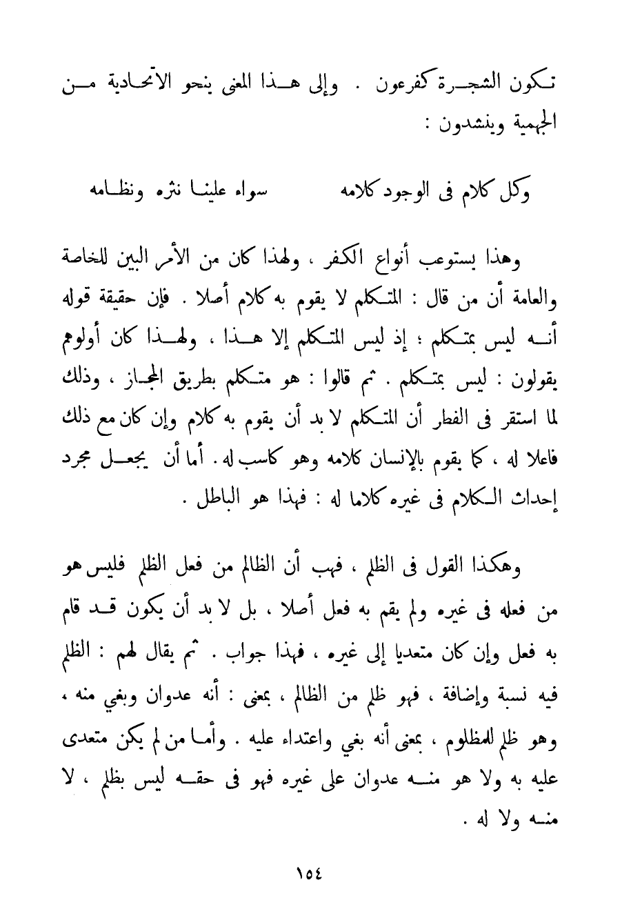 تَكُونُ الشَّجَرَةُ كَفِرْعَوْنَ. وَإِلَى هَذَا الْمَعْنَى بِنَحْوِ الِاتِّحَادِيَّةِ مِنْ الْجَهْمِيَّة وَيُنْشِدُونَ: وَكُلُّ كَلَامٍ فِي الْوُجُودِ كَلَامُهُ سَوَاءٌ عَلَيْنَا نَثْرُهُ وَنِظَامُهُ وَهَذَا يَسْتَوْعِبُ أَنْوَاعَ الْكُفْرِ وَلِهَذَا كَانَ مِنْ الْأَمْرِ الْبَيِّنِ لِلْخَاصَّةِ وَالْعَامَّةِ أَنَّ مَنْ قَالَ: الْمُتَكَلِّمُ لَا يَقُومُ بِهِ كَلَامٌ أَصْلًا. فَإِنَّ حَقِيقَةَ قَوْلِهِ أَنَّهُ لَيْسَ بِمُتَكَلِّمِ؛ إذْ لَيْسَ الْمُتَكَلِّمُ إلَّا هَذَا وَلِهَذَا كَانَ أَوَّلُوهُمْ يَقُولُونَ: لَيْسَ بِمُتَكَلِّمِ. ثُمَّ قَالُوا: هُوَ مُتَكَلِّمٌ بِطَرِيقِ الْمَجَازِ وَذَلِكَ لِمَا اسْتَقَرَّ فِي الْفِطَرِ أَنَّ الْمُتَكَلِّمَ لَا بُدَّ أَنْ يَقُومَ بِهِ كَلَامٌ وَإِنْ كَانَ مَعَ ذَلِكَ فَاعِلًا لَهُ كَمَا يَقُومُ بِالْإِنْسَانِ كَلَامُهُ وَهُوَ كَاسِبٌ لَهُ. أَمَّا أَنْ يَجْعَلَ مُجَرَّدَ إحْدَاثِ الْكَلَامِ فِي غَيْرِهِ كَلَامًا لَهُ: فَهَذَا هُوَ الْبَاطِلُ. وَهَكَذَا الْقَوْلُ فِي الظُّلْمِ فَهَبْ أَنَّ الظَّالِمَ مَنْ فَعَلَ الظُّلْمَ فَلَيْسَ هُوَ مَنْ فَعَلَهُ فِي غَيْرِهِ وَلَمْ يَقُمْ بِهِ فِعْلٌ أَصْلًا بَلْ لَا بُدَّ أَنْ يَكُونَ قَدْ قَامَ بِهِ فِعْلٌ وَإِنْ كَانَ مُتَعَدِّيًا إلَى غَيْرِهِ فَهَذَا جَوَابٌ. ثُمَّ يُقَالُ لَهُمْ: الظُّلْمُ فِيهِ نِسْبَةٌ وَإِضَافَةٌ فَهُوَ ظُلْمٌ مِنْ الظَّالِمِ بِمَعْنَى: أَنَّهُ عُدْوَانٌ وَبَغْيٌ مِنْهُ وَهُوَ ظُلْمٌ لِلْمَظْلُومِ بِمَعْنَى أَنَّهُ بَغْيٌ وَاعْتِدَاءٌ عَلَيْهِ. وَأَمَّا مَنْ لَمْ يَكُنْ مُتَعَدًّى عَلَيْهِ بِهِ وَلَا هُوَ مِنْهُ عُدْوَانٌ عَلَى غَيْرِهِ فَهُوَ فِي حَقِّهِ لَيْسَ بِظُلْمِ لَا مِنْهُ وَلَا لَهُ.