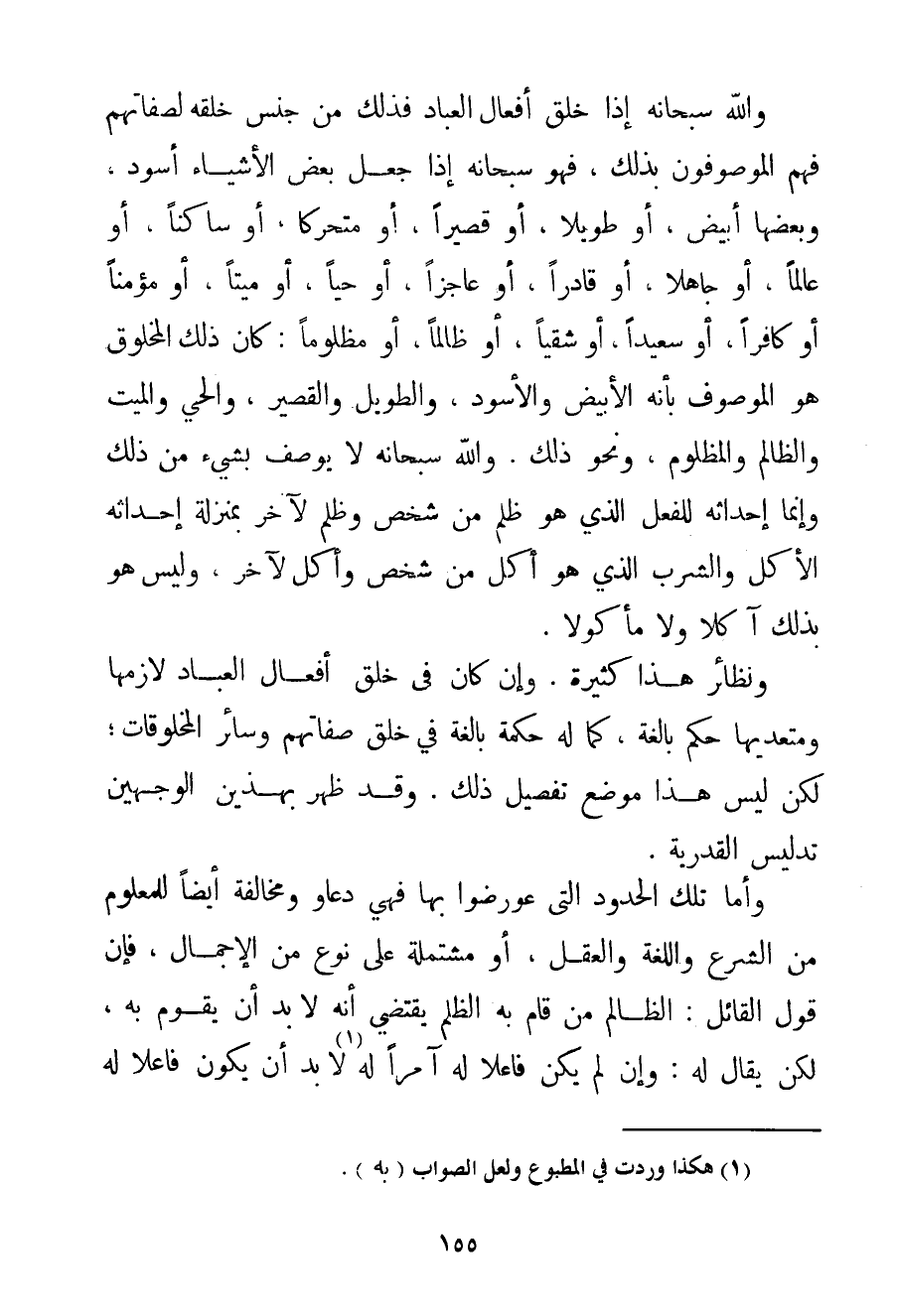 وَاَللَّهُ سُبْحَانَهُ إذَا خَلَقَ أَفْعَالَ الْعِبَادِ فَذَلِكَ مِنْ جِنْسِ خَلْقِهِ لِصِفَاتِهِمْ فَهُمْ الْمَوْصُوفُونَ بِذَلِكَ فَهُوَ سُبْحَانَهُ إذَا جَعَلَ بَعْضَ الْأَشْيَاءِ أَسْوَدَ وَبَعْضَهَا أَبْيَضَ أَوْ طَوِيلًا أَوْ قَصِيرًا أَوْ مُتَحَرِّكًا أَوْ سَاكِنًا أَوْ عَالِمًا أَوْ جَاهِلًا أَوْ قَادِرًا أَوْ عَاجِزًا أَوْ حَيًّا أَوْ مَيِّتًا أَوْ مُؤْمِنًا أَوْ كَافِرًا أَوْ سَعِيدًا أَوْ شَقِيًّا أَوْ ظَالِمًا أَوْ مَظْلُومًا: كَانَ ذَلِكَ الْمَخْلُوقُ هُوَ الْمَوْصُوفَ بِأَنَّهُ الْأَبْيَضُ وَالْأَسْوَدُ وَالطَّوِيلُ وَالْقَصِيرُ وَالْحَيُّ وَالْمَيِّتُ وَالظَّالِمُ وَالْمَظْلُومُ وَنَحْوُ ذَلِكَ. وَاَللَّهُ سُبْحَانَهُ لَا يُوصَفُ بِشَيْءِ مِنْ ذَلِكَ وَإِنَّمَا إحْدَاثُهُ لِلْفِعْلِ الَّذِي هُوَ ظُلْمٌ مِنْ شَخْصٍ وَظُلْمٌ لِآخَرَ بِمَنْزِلَةِ إحْدَاثِهِ الْأَكْلَ وَالشُّرْبَ الَّذِي هُوَ أَكْلٌ مِنْ شَخْصٍ وَأَكْلٌ لِآخَرَ وَلَيْسَ هُوَ بِذَلِكَ آكِلًا وَلَا مَأْكُولًا. وَنَظَائِرُ هَذَا كَثِيرَةٌ. وَإِنْ كَانَ فِي خَلْقِ أَفْعَالِ الْعِبَادِ لَازِمِهَا وَمُتَعَدِّيهَا حِكَمٌ بَالِغَةٌ كَمَا لَهُ حِكْمَةٌ بَالِغَةٌ فِي خَلْقِ صِفَاتِهِمْ وَسَائِرِ الْمَخْلُوقَاتِ؛ لَكِنْ لَيْسَ هَذَا مَوْضِعَ تَفْصِيلِ ذَلِكَ. وَقَدْ ظَهَرَ بِهَذَيْنِ الْوَجْهَيْنِ تَدْلِيسُ الْقَدَرِيَّةِ. وَأَمَّا تِلْكَ الْحُدُودُ الَّتِي عُورِضُوا بِهَا فَهِيَ دَعَاوٍ وَمُخَالِفَةٌ أَيْضًا لِلْمَعْلُومِ مِنْ الشَّرْعِ وَاللُّغَةِ وَالْعَقْلِ أَوْ مُشْتَمِلَةٌ عَلَى نَوْعٍ مِنْ الْإِجْمَالِ فَإِنَّ قَوْلَ الْقَائِلِ: الظَّالِمُ مَنْ قَامَ بِهِ الظُّلْمُ يَقْتَضِي أَنَّهُ لَا بُدَّ أَنْ يَقُومَ بِهِ لَكِنْ يُقَالُ لَهُ: وَإِنْ لَمْ يَكُنْ فَاعِلًا لَهُ آمِرًا لَهُ لَا بُدَّ أَنْ يَكُونَ فَاعِلًا لَهُ