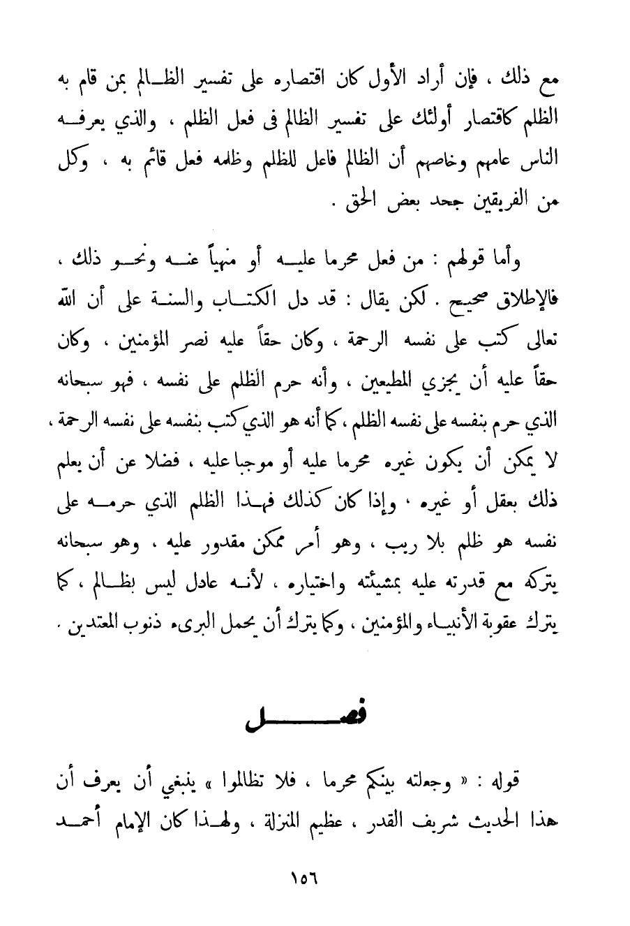 مَعَ ذَلِكَ فَإِنْ أَرَادَ الْأَوَّلَ كَانَ اقْتِصَارُهُ عَلَى تَفْسِيرِ الظَّالِمِ بِمَنْ قَامَ بِهِ الظُّلْمُ كَاقْتِصَارِ أُولَئِكَ عَلَى تَفْسِيرِ الظَّالِمِ فِي فِعْلِ الظُّلْمِ وَاَلَّذِي يَعْرِفُهُ النَّاسُ عَامُّهُمْ وَخَاصُّهُمْ أَنَّ الظَّالِمَ فَاعِلٌ لِلظُّلْمِ وَظُلْمُهُ فِعْلٌ قَائِمٌ بِهِ وَكُلٌّ مِنْ الْفَرِيقَيْنِ جَحَدَ بَعْضَ الْحَقِّ. وَأَمَّا قَوْلُهُمْ: مَنْ فَعَلَ مُحَرَّمًا عَلَيْهِ أَوْ مَنْهِيًّا عَنْهُ وَنَحْوَ ذَلِكَ فَالْإِطْلَاقُ صَحِيحٌ. لَكِنْ يُقَالُ: قَدْ دَلَّ الْكِتَابُ وَالسُّنَّةُ عَلَى أَنَّ اللَّهَ تَعَالَى كَتَبَ عَلَى نَفْسِهِ الرَّحْمَةَ وَكَانَ حَقًّا عَلَيْهِ نَصْرُ الْمُؤْمِنِينَ وَكَانَ حَقًّا عَلَيْهِ أَنْ يَجْزِيَ الْمُطِيعِينَ وَأَنَّهُ حَرَّمَ الظُّلْمَ عَلَى نَفْسِهِ فَهُوَ سُبْحَانَهُ الَّذِي حَرَّمَ بِنَفْسِهِ عَلَى نَفْسِهِ الظُّلْمَ كَمَا أَنَّهُ هُوَ الَّذِي كَتَبَ بِنَفْسِهِ عَلَى نَفْسِهِ الرَّحْمَةَ لَا يُمْكِنُ أَنْ يَكُونَ غَيْرُهُ مُحَرَّمًا عَلَيْهِ أَوْ مُوجِبًا عَلَيْهِ فَضْلًا عَنْ أَنْ يَعْلَمَ ذَلِكَ بِعَقْلِ أَوْ غَيْرِهِ وَإِذَا كَانَ كَذَلِكَ فَهَذَا الظُّلْمُ الَّذِي حَرَّمَهُ عَلَى نَفْسِهِ هُوَ ظُلْمٌ بِلَا رَيْبٍ وَهُوَ أَمْرٌ مُمْكِنٌ مَقْدُورٌ عَلَيْهِ وَهُوَ سُبْحَانَهُ يَتْرُكُهُ مَعَ قُدْرَتِهِ عَلَيْهِ بِمَشِيئَتِهِ وَاخْتِيَارِهِ لِأَنَّهُ عَادِلٌ لَيْسَ بِظَالِمِ كَمَا يَتْرُكُ عُقُوبَةَ الْأَنْبِيَاءِ وَالْمُؤْمِنِينَ وَكَمَا يَتْرُكُ أَنْ يَحْمِلَ الْبَرِيءُ ذُنُوبَ الْمُعْتَدِينَ.