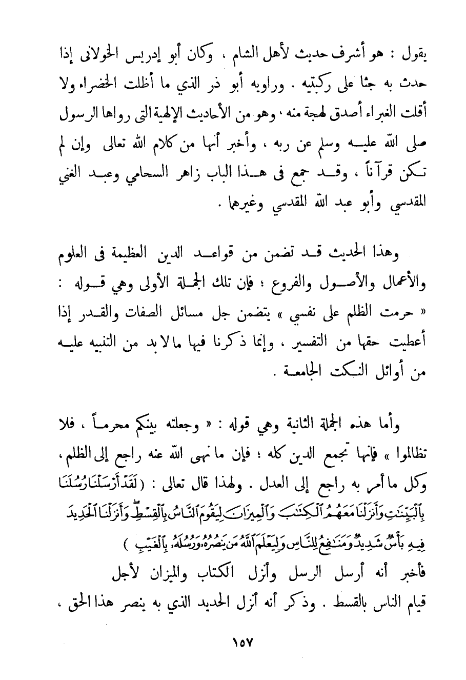 يَقُولُ: هُوَ أَشْرَفُ حَدِيثٍ لِأَهْلِ الشَّامِ وَكَانَ أَبُو إدْرِيسَ الخولاني إذَا حَدَّثَ بِهِ جَثَا عَلَى رُكْبَتَيْهِ. وَرَاوِيهِ أَبُو ذَرٍّ الَّذِي مَا أَظَلَّتْ الْخَضْرَاءُ وَلَا أَقَلَّتْ الْغَبْرَاءُ أَصْدَقَ لَهْجَةً مِنْهُ وَهُوَ مِنْ الْأَحَادِيثِ الْإِلَهِيَّةِ الَّتِي رَوَاهَا الرَّسُولُ صَلَّى اللَّهُ عَلَيْهِ وَسَلَّمَ عَنْ رَبِّهِ وَأَخْبَرَ أَنَّهَا مِنْ كَلَامِ اللَّهِ تَعَالَى وَإِنْ لَمْ تَكُنْ قُرْآنًا وَقَدْ جَمَعَ فِي هَذَا الْبَابِ زَاهِرٌ الشحامي وَعَبْدُ الْغَنِيِّ المقدسي وَأَبُو عَبْدِ اللَّهِ المقدسي وَغَيْرُهُمْ. وَهَذَا الْحَدِيثُ قَدْ تَضَمَّنَ مِنْ قَوَاعِدِ الدِّينِ الْعَظِيمَةِ فِي الْعُلُومِ وَالْأَعْمَالِ وَالْأُصُولِ وَالْفُرُوعِ؛ فَإِنَّ تِلْكَ الْجُمْلَةَ الْأُولَى وَهِيَ قَوْلُهُ: " {حَرَّمْت الظُّلْمَ عَلَى نَفْسِي} " يَتَضَمَّنُ جُلَّ مَسَائِلِ الصِّفَاتِ وَالْقَدَرِ إذَا أُعْطِيَتْ حَقَّهَا مِنْ التَّفْسِيرِ وَإِنَّمَا ذَكَرْنَا فِيهَا مَا لَا بُدَّ مِنْ التَّنْبِيهِ عَلَيْهِ مِنْ أَوَائِلِ النُّكَتِ الْجَامِعَةِ. وَأَمَّا هَذِهِ الْجُمْلَةُ الثَّانِيَةُ وَهِيَ قَوْلُهُ: " {وَجَعَلْته بَيْنَكُمْ مُحَرَّمًا فَلَا تظالموا} " فَإِنَّهَا تَجْمَعُ الدِّينَ كُلَّهُ؛ فَإِنَّ مَا نَهَى اللَّهُ عَنْهُ رَاجِعٌ إلَى الظُّلْمِ وَكُلُّ مَا أَمَرَ بِهِ رَاجِعٌ إلَى الْعَدْلِ. وَلِهَذَا قَالَ تَعَالَى: {لَقَدْ أَرْسَلْنَا رُسُلَنَا بِالْبَيِّنَاتِ وَأَنْزَلْنَا مَعَهُمُ الْكِتَابَ وَالْمِيزَانَ لِيَقُومَ النَّاسُ بِالْقِسْطِ وَأَنْزَلْنَا الْحَدِيدَ فِيهِ بَأْسٌ شَدِيدٌ وَمَنَافِعُ لِلنَّاسِ وَلِيَعْلَمَ اللَّهُ مَنْ يَنْصُرُهُ وَرُسُلَهُ بِالْغَيْبِ} فَأَخْبَرَ أَنَّهُ أَرْسَلَ الرُّسُلَ وَأَنْزَلَ الْكِتَابَ وَالْمِيزَانَ لِأَجْلِ قِيَامِ النَّاسِ بِالْقِسْطِ. وَذَكَرَ أَنَّهُ أَنْزَلَ الْحَدِيدَ الَّذِي بِهِ يَنْصُرُ هَذَا الْحَقَّ
