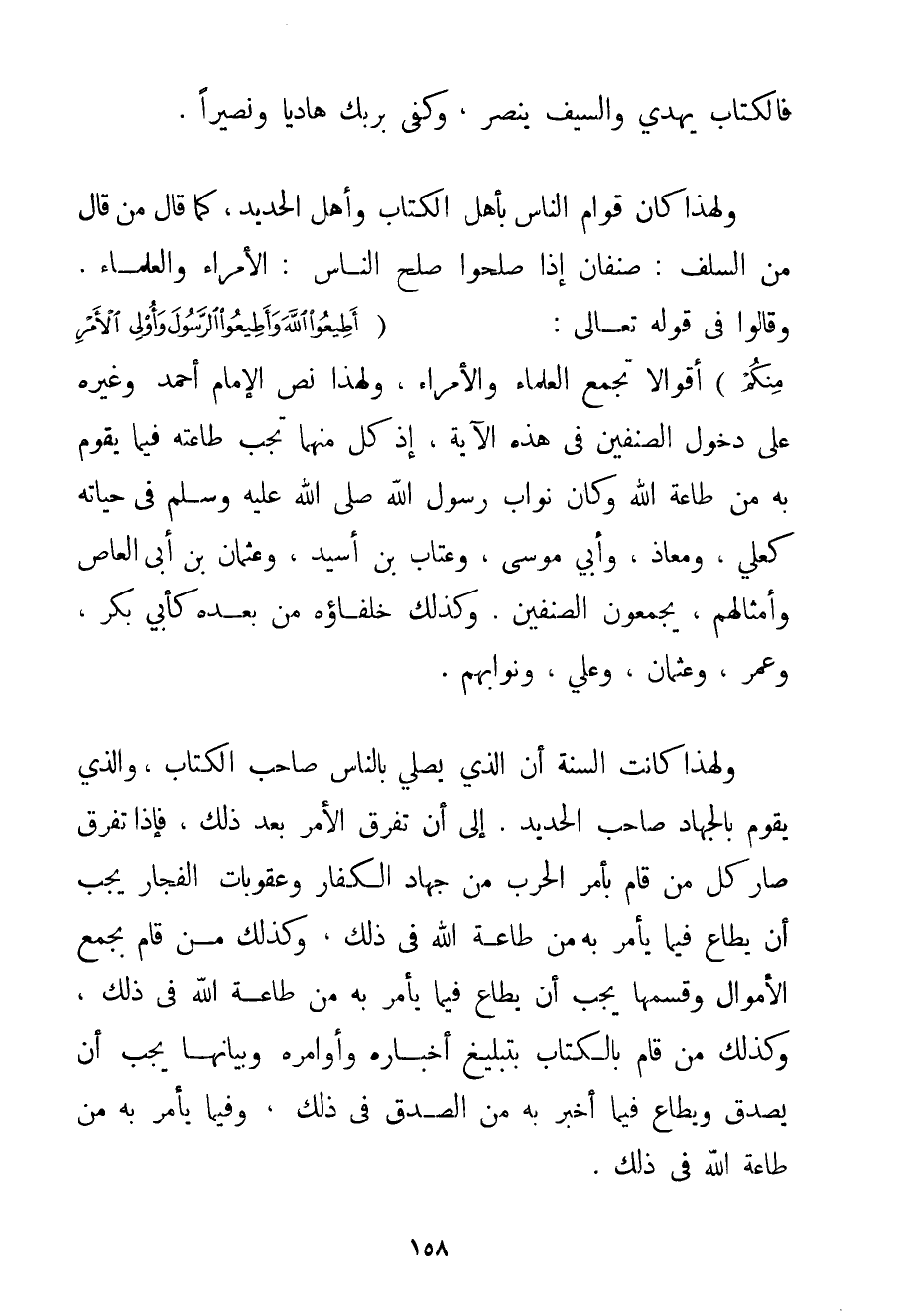 فَالْكِتَابُ يَهْدِي وَالسَّيْفُ يَنْصُرُ وَكَفَى بِرَبِّك هَادِيًا وَنَصِيرًا. وَلِهَذَا كَانَ قِوَامُ النَّاسِ بِأَهْلِ الْكِتَابِ وَأَهْلِ الْحَدِيدِ كَمَا قَالَ مَنْ قَالَ مِنْ السَّلَفِ: صِنْفَانِ إذَا صَلَحُوا صَلَحَ النَّاسُ: الْأُمَرَاءُ وَالْعُلَمَاءُ. وَقَالُوا فِي قَوْله تَعَالَى {أَطِيعُوا اللَّهَ وَأَطِيعُوا الرَّسُولَ وَأُولِي الْأَمْرِ مِنْكُمْ} أَقْوَالًا تَجْمَعُ الْعُلَمَاءَ وَالْأُمَرَاءَ وَلِهَذَا نَصَّ الْإِمَامُ أَحْمَد وَغَيْرُهُ عَلَى دُخُولِ الصِّنْفَيْنِ فِي هَذِهِ الْآيَةِ؟ إذْ كُلٌّ مِنْهُمَا تَجِبُ طَاعَتُهُ فِيمَا يَقُومُ بِهِ مِنْ طَاعَةِ اللَّهِ وَكَانَ نُوَّابُ رَسُولِ اللَّه صَلَّى اللَّهُ عَلَيْهِ وَسَلَّمَ فِي حَيَاتِهِ كَعَلِيِّ وَمُعَاذٍ وَأَبِي مُوسَى وَعَتَّابِ بْنِ أسيد وَعُثْمَانَ بْنِ أَبِي العاص وَأَمْثَالِهِمْ يَجْمَعُونَ الصِّنْفَيْنِ. وَكَذَلِكَ خُلَفَاؤُهُ مِنْ بَعْدِهِ كَأَبِي بَكْرٍ وَعُمَرَ وَعُثْمَانَ وَعَلِيٍّ وَنُوَّابِهِمْ. وَلِهَذَا كَانَتْ السُّنَّةُ أَنَّ الَّذِي يُصَلِّي بِالنَّاسِ صَاحِبُ الْكِتَابِ وَاَلَّذِي يَقُومُ بِالْجِهَادِ صَاحِبُ الْحَدِيدِ. إلَى أَنْ تَفَرَّقَ الْأَمْرُ بَعْدَ ذَلِكَ فَإِذَا تَفَرَّقَ صَارَ كُلُّ مَنْ قَامَ بِأَمْرِ الْحَرْبِ مِنْ جِهَادِ الْكُفَّارِ وَعُقُوبَاتِ الْفُجَّارِ يَجِبُ أَنْ يُطَاعَ فِيمَا يَأْمُرُ بِهِ مِنْ طَاعَةِ اللَّهِ فِي ذَلِكَ وَكَذَلِكَ مَنْ قَامَ بِجَمْعِ الْأَمْوَالِ وَقَسْمِهَا يَجِبُ أَنْ يُطَاعَ فِيمَا يَأْمُرُ بِهِ مِنْ طَاعَةِ اللَّهِ فِي ذَلِكَ وَكَذَلِكَ مَنْ قَامَ بِالْكِتَابِ بِتَبْلِيغِ أَخْبَارِهِ وَأَوَامِرِهِ وَبَيَانِهَا يَجِبُ أَنْ يُصَدَّقَ وَيُطَاعَ فِيمَا أَخْبَرَ بِهِ مِنْ الصِّدْقِ فِي ذَلِكَ وَفِيمَا يَأْمُرُ بِهِ مِنْ طَاعَةِ اللَّهِ فِي ذَلِكَ.