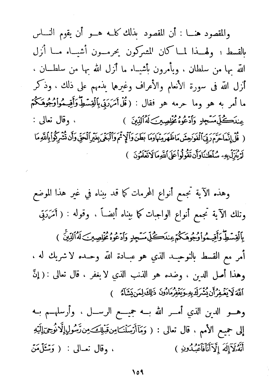 وَالْمَقْصُودُ هُنَا: أَنَّ الْمَقْصُودَ بِذَلِكَ كُلِّهِ هُوَ أَنْ يَقُومَ النَّاسُ بِالْقِسْطِ؛ وَلِهَذَا لَمَّا كَانَ الْمُشْرِكُونَ يُحَرِّمُونَ أَشْيَاءَ مَا أَنْزَلَ اللَّهُ بِهَا مِنْ سُلْطَانٍ وَيَأْمُرُونَ بِأَشْيَاءَ مَا أَنْزَلَ اللَّهُ بِهَا مِنْ سُلْطَانٍ أَنْزَلَ اللَّهُ فِي سُورَةِ الْأَنْعَامِ وَالْأَعْرَافِ وَغَيْرِهِمَا يَذُمُّهُمْ عَلَى ذَلِكَ وَذَكَرَ مَا أَمَرَ بِهِ هُوَ وَمَا حَرَّمَهُ هُوَ فَقَالَ: {قُلْ أَمَرَ رَبِّي بِالْقِسْطِ وَأَقِيمُوا وُجُوهَكُمْ عِنْدَ كُلِّ مَسْجِدٍ وَادْعُوهُ مُخْلِصِينَ لَهُ الدِّينَ} وَقَالَ تَعَالَى: {قُلْ إنَّمَا حَرَّمَ رَبِّيَ الْفَوَاحِشَ مَا ظَهَرَ مِنْهَا وَمَا بَطَنَ وَالْإِثْمَ وَالْبَغْيَ بِغَيْرِ الْحَقِّ وَأَنْ تُشْرِكُوا بِاللَّهِ مَا لَمْ يُنَزِّلْ بِهِ سُلْطَانًا وَأَنْ تَقُولُوا عَلَى اللَّهِ مَا لَا تَعْلَمُونَ} . وَهَذِهِ الْآيَةُ تَجْمَعُ أَنْوَاعَ الْمُحَرَّمَاتِ كَمَا قَدْ بَيَّنَّاهُ فِي غَيْرِ هَذَا الْمَوْضِعِ وَتِلْكَ الْآيَةُ تَجْمَعُ أَنْوَاعَ الْوَاجِبَاتِ كَمَا بَيَّنَّاهُ أَيْضًا وَقَوْلُهُ: {أَمَرَ رَبِّي بِالْقِسْطِ وَأَقِيمُوا وُجُوهَكُمْ عِنْدَ كُلِّ مَسْجِدٍ وَادْعُوهُ مُخْلِصِينَ لَهُ الدِّينَ} أَمَرَ مَعَ الْقِسْطِ بِالتَّوْحِيدِ الَّذِي هُوَ عِبَادَةُ اللَّهِ وَحْدَهُ لَا شَرِيكَ لَهُ وَهَذَا أَصْلُ الدِّينِ وَضِدُّهُ هُوَ الذَّنْبُ الَّذِي لَا يُغْفَرُ قَالَ تَعَالَى: {إنَّ اللَّهَ لَا يَغْفِرُ أَنْ يُشْرَكَ بِهِ وَيَغْفِرُ مَا دُونَ ذَلِكَ لِمَنْ يَشَاءُ} وَهُوَ الدِّينُ الَّذِي أَمَرَ اللَّهُ بِهِ جَمِيعَ الرُّسُلِ وَأَرْسَلَهُمْ بِهِ إلَى جَمِيعِ الْأُمَمِ قَالَ تَعَالَى: {وَمَا أَرْسَلْنَا مِنْ قَبْلِكَ مِنْ رَسُولٍ إلَّا نُوحِي إلَيْهِ أَنَّهُ لَا إلَهَ إلَّا أَنَا فَاعْبُدُونِ} وَقَالَ تَعَالَى: {وَاسْأَلْ مَنْ