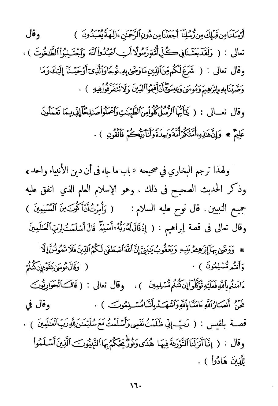 أَرْسَلْنَا مِنْ قَبْلِكَ مِنْ رُسُلِنَا أَجَعَلْنَا مِنْ دُونِ الرَّحْمَنِ آلِهَةً يُعْبَدُونَ} وَقَالَ تَعَالَى: {وَلَقَدْ بَعَثْنَا فِي كُلِّ أُمَّةٍ رَسُولًا أَنِ اُعْبُدُوا اللَّهَ وَاجْتَنِبُوا الطَّاغُوتَ} وَقَالَ تَعَالَى: {شَرَعَ لَكُمْ مِنَ الدِّينِ مَا وَصَّى بِهِ نُوحًا وَالَّذِي أَوْحَيْنَا إلَيْكَ وَمَا وَصَّيْنَا بِهِ إبْرَاهِيمَ وَمُوسَى وَعِيسَى أَنْ أَقِيمُوا الدِّينَ وَلَا تَتَفَرَّقُوا فِيهِ} . وَقَالَ تَعَالَى: {يَا أَيُّهَا الرُّسُلُ كُلُوا مِنَ الطَّيِّبَاتِ وَاعْمَلُوا صَالِحًا إنِّي بِمَا تَعْمَلُونَ عَلِيمٌ} {وَإِنَّ هَذِهِ أُمَّتُكُمْ أُمَّةً وَاحِدَةً وَأَنَا رَبُّكُمْ فَاتَّقُونِ} . وَلِهَذَا تَرْجَمَ الْبُخَارِيُّ فِي صَحِيحِهِ " بَابَ مَا جَاءَ فِي أَنَّ دِينَ الْأَنْبِيَاءِ وَاحِدٌ " وَذَكَرَ الْحَدِيثَ الصَّحِيحَ فِي ذَلِكَ وَهُوَ الْإِسْلَامُ الْعَامُّ الَّذِي اتَّفَقَ عَلَيْهِ جَمِيعُ النَّبِيِّينَ. قَالَ نُوحٌ عَلَيْهِ السَّلَامُ {وَأُمِرْتُ أَنْ أَكُونَ مِنَ الْمُسْلِمِينَ} وَقَالَ تَعَالَى فِي قِصَّةِ إبْرَاهِيمَ: {إذْ قَالَ لَهُ رَبُّهُ أَسْلِمْ قَالَ أَسْلَمْتُ لِرَبِّ الْعَالَمِينَ} {وَوَصَّى بِهَا إبْرَاهِيمُ بَنِيهِ وَيَعْقُوبُ يَا بَنِيَّ إنَّ اللَّهَ اصْطَفَى لَكُمُ الدِّينَ فَلَا تَمُوتُنَّ إلَّا وَأَنْتُمْ مُسْلِمُونَ} {وَقَالَ مُوسَى يَا قَوْمِ إنْ كُنْتُمْ آمَنْتُمْ بِاللَّهِ فَعَلَيْهِ تَوَكَّلُوا إنْ كُنْتُمْ مُسْلِمِينَ} وَقَالَ تَعَالَى: {قَالَ الْحَوَارِيُّونَ نَحْنُ أَنْصَارُ اللَّهِ آمَنَّا بِاللَّهِ وَاشْهَدْ بِأَنَّا مُسْلِمُونَ} . وَقَالَ فِي قِصَّة بلقيس: {رَبِّ إنِّي ظَلَمْتُ نَفْسِي وَأَسْلَمْتُ مَعَ سُلَيْمَانَ لِلَّهِ رَبِّ الْعَالَمِينَ} وَقَالَ: {إنَّا أَنْزَلْنَا التَّوْرَاةَ فِيهَا هُدًى وَنُورٌ يَحْكُمُ بِهَا النَّبِيُّونَ الَّذِينَ أَسْلَمُوا لِلَّذِينَ هَادُوا} .