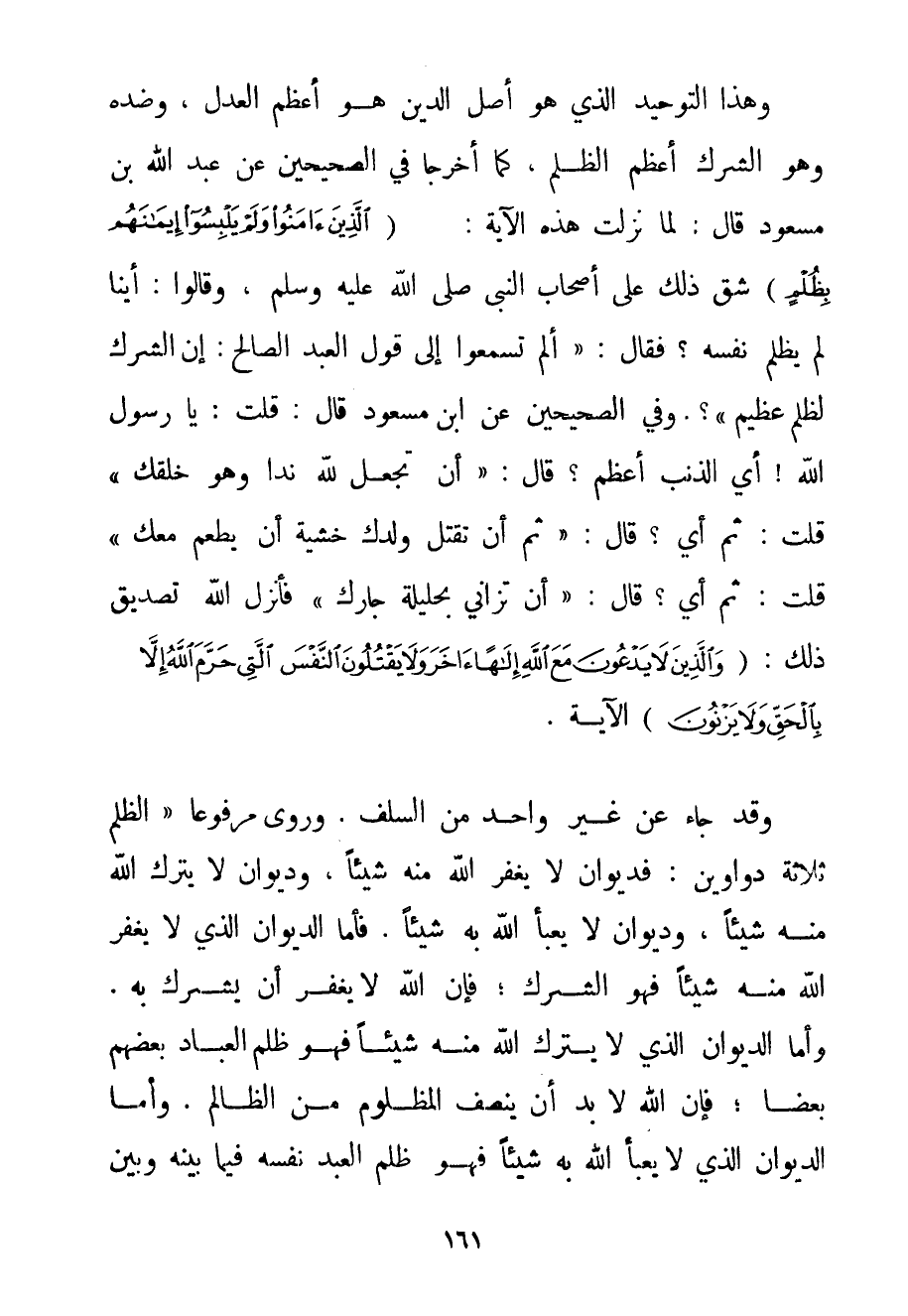 وَهَذَا التَّوْحِيدُ الَّذِي هُوَ أَصْلُ الدِّينِ هُوَ أَعْظَمُ الْعَدْلِ وَضِدُّهُ وَهُوَ الشِّرْكُ أَعْظَمُ الظُّلْمِ كَمَا أَخْرَجَا فِي الصَّحِيحَيْنِ عَنْ {عَبْدِ اللَّهِ بْنِ مَسْعُودٍ قَالَ: لَمَّا نَزَلَتْ هَذِهِ الْآيَةُ: {الَّذِينَ آمَنُوا وَلَمْ يَلْبِسُوا إيمَانَهُمْ بِظُلْمٍ} شَقَّ ذَلِكَ عَلَى أَصْحَابِ النَّبِيِّ صَلَّى اللَّهُ عَلَيْهِ وَسَلَّمَ وَقَالُوا: أَيُّنَا لَمْ يَظْلِمْ نَفْسَهُ؟ فَقَالَ: أَلَمْ تَسْمَعُوا إلَى قَوْلِ الْعَبْدِ الصَّالِحِ: {إنَّ الشِّرْكَ لَظُلْمٌ عَظِيمٌ} } "؟ وَفِي الصَّحِيحَيْنِ عَنْ {ابْنِ مَسْعُودٍ قَالَ: قُلْت: يَا رَسُولَ اللَّهِ أَيُّ الذَّنْبِ أَعْظَمُ؟ قَالَ: أَنْ تَجْعَلَ لِلَّهِ نِدًّا وَهُوَ خَلَقَك قُلْت: ثُمَّ أَيُّ؟ قَالَ: ثُمَّ أَنْ تَقْتُلَ وَلَدَك خَشْيَةَ أَنْ يَطْعَمَ مَعَك قُلْت: ثُمَّ أَيُّ؟ قَالَ: أَنْ تُزَانِيَ بِحَلِيلَةِ جَارك فَأَنْزَلَ اللَّهُ تَصْدِيقَ ذَلِكَ: {وَالَّذِينَ لَا يَدْعُونَ مَعَ اللَّهِ إلَهًا آخَرَ وَلَا يَقْتُلُونَ النَّفْسَ الَّتِي حَرَّمَ اللَّهُ إلَّا بِالْحَقِّ وَلَا يَزْنُونَ} الْآيَةَ} . وَقَدْ جَاءَ عَنْ غَيْرِ وَاحِدٍ مِنْ السَّلَفِ. وَرُوِيَ مَرْفُوعًا {الظُّلْمُ ثَلَاثَةُ دَوَاوِينَ: فَدِيوَانٌ لَا يَغْفِرُ اللَّهُ مِنْهُ شَيْئًا وَدِيوَانٌ لَا يَتْرُكُ اللَّهُ مِنْهُ شَيْئًا وَدِيوَانٌ لَا يَعْبَأُ اللَّهُ بِهِ شَيْئًا. فَأَمَّا الدِّيوَانُ الَّذِي لَا يَغْفِرُ اللَّهُ مِنْهُ شَيْئًا فَهُوَ الشِّرْكُ؛ فَإِنَّ اللَّهَ لَا يَغْفِرُ أَنْ يُشْرَكَ بِهِ. وَأَمَّا الدِّيوَانُ الَّذِي لَا يَتْرُكُ اللَّهُ مِنْهُ شَيْئًا فَهُوَ ظُلْمُ الْعِبَادِ بَعْضُهُمْ بَعْضًا؛ فَإِنَّ اللَّهَ لَا بُدَّ أَنْ يُنْصِفَ الْمَظْلُومَ مِنْ الظَّالِمِ. وَأَمَّا الدِّيوَانُ الَّذِي لَا يَعْبَأُ اللَّهُ بِهِ شَيْئًا فَهُوَ ظُلْمُ الْعَبْدِ نَفْسَهُ فِيمَا بَيْنَهُ وَبَيْنَ