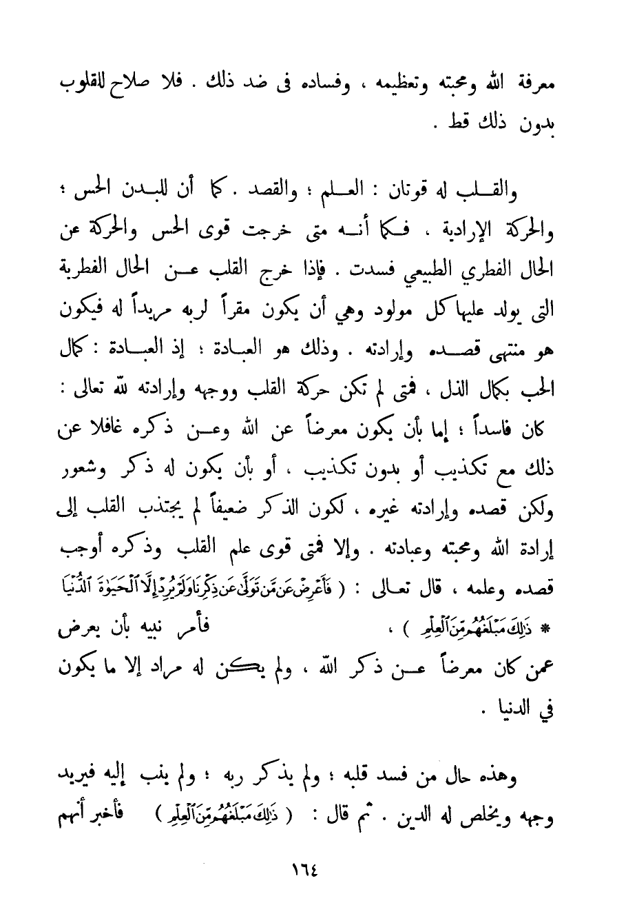 مَعْرِفَةِ اللَّهِ وَمَحَبَّتِهِ وَتَعْظِيمِهِ وَفَسَادِهِ فِي ضِدِّ ذَلِكَ. فَلَا صَلَاحَ لِلْقُلُوبِ بِدُونِ ذَلِكَ قَطُّ. وَالْقَلْبُ لَهُ قُوَّتَانِ: الْعِلْمُ؛ وَالْقَصْدُ كَمَا أَنَّ لِلْبَدَنِ الْحِسَّ؛ وَالْحَرَكَةَ الْإِرَادِيَّةَ فَكَمَا أَنَّهُ مَتَى خَرَجَتْ قُوَى الْحِسِّ وَالْحَرَكَةِ عَنْ الْحَالِ الْفِطْرِيِّ الطَّبِيعِيِّ فَسَدَتْ. فَإِذَا خَرَجَ الْقَلْبُ عَنْ الْحَالِ الْفِطْرِيَّةِ الَّتِي يُولَدُ عَلَيْهَا كُلُّ مَوْلُودٍ وَهِيَ أَنْ يَكُونَ مُقِرًّا لِرَبِّهِ مُرِيدًا لَهُ فَيَكُونُ هُوَ مُنْتَهَى قَصْدِهِ وَإِرَادَتِهِ. وَذَلِكَ هِيَ الْعِبَادَةُ؛ إذْ الْعِبَادَةُ: كَمَالُ الْحُبِّ بِكَمَالِ الذُّلِّ فَمَتَى لَمْ تَكُنْ حَرَكَةُ الْقَلْبِ وَوَجْهُهُ وَإِرَادَتُهُ لِلَّهِ تَعَالَى كَانَ فَاسِدًا؛ إمَّا بِأَنْ يَكُونَ مُعْرِضًا عَنْ اللَّهِ وَعَنْ ذَكَرَهُ غَافِلًا عَنْ ذَلِكَ مَعَ تَكْذِيبٍ أَوْ بِدُونِ تَكْذِيبٍ أَوْ بِأَنْ يَكُونَ لَهُ ذِكْرٌ وَشُعُورٌ وَلَكِنْ قَصْدُهُ وَإِرَادَتُهُ غَيْرَهُ لِكَوْنِ الذِّكْرِ ضَعِيفًا لَمْ يَجْتَذِبْ الْقَلْبَ إلَى إرَادَةِ اللَّهِ وَمَحَبَّتِهِ وَعِبَادَتِهِ. وَإِلَّا فَمَتَى قَوِيَ عِلْمُ الْقَلْبِ وَذِكْرُهُ أَوْجَبَ قَصْدَهُ وَعِلْمَهُ قَالَ تَعَالَى: {فَأَعْرِضْ عَنْ مَنْ تَوَلَّى عَنْ ذِكْرِنَا وَلَمْ يُرِدْ إلَّا الْحَيَاةَ الدُّنْيَا} {ذَلِكَ مَبْلَغُهُمْ مِنَ الْعِلْمِ} فَأَمَرَ نَبِيَّهُ بِأَنْ يُعْرِضَ عَمَّنْ كَانَ مُعْرِضًا عَنْ ذِكْرِ اللَّهِ وَلَمْ يَكُنْ لَهُ مُرَادٌ إلَّا مَا يَكُونُ فِي الدُّنْيَا. وَهَذِهِ حَالُ مَنْ فَسَدَ قَلْبُهُ؛ وَلَمْ يَذْكُرْ رَبَّهُ؛ وَلَمْ يُنِبْ إلَيْهِ فَيُرِيدُ وَجْهَهُ وَيُخْلِصُ لَهُ الدِّينَ. ثُمَّ قَالَ: {ذَلِكَ مَبْلَغُهُمْ مِنَ الْعِلْمِ} فَأَخْبَرَ أَنَّهُمْ