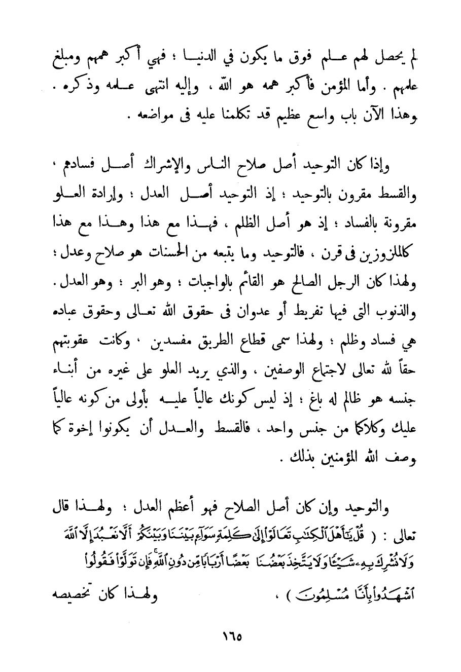لَمْ يَحْصُلْ لَهُمْ عِلْمٌ فَوْقَ مَا يَكُونُ فِي الدُّنْيَا؛ فَهِيَ أَكْبَرُ هَمِّهِمْ وَمَبْلَغُ عِلْمِهِمْ. وَأَمَّا الْمُؤْمِنُ فَأَكْبَرُ هَمِّهِ هُوَ اللَّهُ وَإِلَيْهِ انْتَهَى عِلْمُهُ وَذِكْرُهُ. وَهَذَا الْآنُ بَابٌ وَاسِعٌ عَظِيمٌ قَدْ تَكَلَّمْنَا عَلَيْهِ فِي مَوَاضِعِهِ. وَإِذَا كَانَ التَّوْحِيدُ أَصْلَ صَلَاحِ النَّاسِ وَالْإِشْرَاكُ أَصْلَ فَسَادِهِمْ وَالْقِسْطُ مَقْرُونٌ بِالتَّوْحِيدِ؛ إذْ التَّوْحِيدُ أَصْلُ الْعَدْلِ؛ وَإِرَادَةُ الْعُلُوِّ مَقْرُونَةٌ بِالْفَسَادِ؛ إذْ هُوَ أَصْلُ الظُّلْمِ فَهَذَا مَعَ هَذَا وَهَذَا مَعَ هَذَا كَالْمَلْزُوزِينَ فِي قَرْنٍ فَالتَّوْحِيدُ وَمَا يَتْبَعُهُ مِنْ الْحَسَنَاتِ هُوَ صَلَاحٌ وَعَدْلٌ؛ وَلِهَذَا كَانَ الرَّجُلُ الصَّالِحُ هُوَ الْقَائِمَ بِالْوَاجِبَاتِ؛ وَهُوَ الْبِرُّ؛ وَهُوَ الْعَدْلُ. وَالذُّنُوبُ الَّتِي فِيهَا تَفْرِيطٌ أَوْ عُدْوَانٌ فِي حُقُوقِ اللَّهِ تَعَالَى وَحُقُوقِ عِبَادِهِ هِيَ فَسَادٌ وَظُلْمٌ؛ وَلِهَذَا سُمِّيَ قُطَّاعُ الطَّرِيقِ مُفْسِدِينَ وَكَانَتْ عُقُوبَتُهُمْ حَقًّا لِلَّهِ تَعَالَى لِاجْتِمَاعِ الْوَصْفَيْنِ وَاَلَّذِي يُرِيدُ الْعُلُوَّ عَلَى غَيْرِهِ مِنْ أَبْنَاءِ جِنْسِهِ هُوَ ظَالِمٌ لَهُ بَاغٍ؛ إذْ لَيْسَ كَوْنُك عَالِيًا عَلَيْهِ بِأَوْلَى مِنْ كَوْنِهِ عَالِيًا عَلَيْك وَكِلَاكُمَا مِنْ جِنْسٍ وَاحِدٍ فَالْقِسْطُ وَالْعَدْلُ أَنْ يَكُونُوا إخْوَةً كَمَا وَصَفَ اللَّهُ الْمُؤْمِنِينَ بِذَلِكَ. وَالتَّوْحِيدُ وَإِنْ كَانَ أَصْلَ الصَّلَاحِ فَهُوَ أَعْظَمُ الْعَدْلِ؛ وَلِهَذَا قَالَ تَعَالَى: {قُلْ يَا أَهْلَ الْكِتَابِ تَعَالَوْا إلَى كَلِمَةٍ سَوَاءٍ بَيْنَنَا وَبَيْنَكُمْ أَلَّا نَعْبُدَ إلَّا اللَّهَ وَلَا نُشْرِكَ بِهِ شَيْئًا وَلَا يَتَّخِذَ بَعْضُنَا بَعْضًا أَرْبَابًا مِنْ دُونِ اللَّهِ فَإِنْ تَوَلَّوْا فَقُولُوا اشْهَدُوا بِأَنَّا مُسْلِمُونَ} وَلِهَذَا كَانَ تَخْصِيصُهُ
