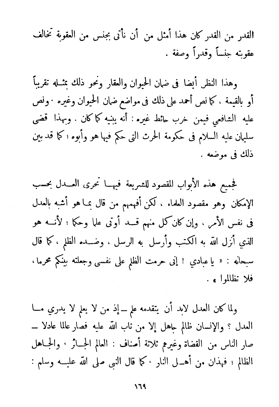 الْقَدْرَ مِنْ الْقَدْرِ كَانَ هَذَا أَمْثَلَ مِنْ أَنْ نَأْتِيَ بِجِنْسِ مِنْ الْعُقُوبَةِ تُخَالِفُ عُقُوبَتُهُ جِنْسًا وَقَدْرًا وَصِفَةً. وَهَذَا النَّظَرُ أَيْضًا فِي ضَمَانِ الْحَيَوَانِ وَالْعَقَارِ وَنَحْوِ ذَلِكَ بِمِثْلِهِ تَقْرِيبًا أَوْ بِالْقِيمَةِ كَمَا نَصَّ أَحْمَد عَلَى ذَلِكَ فِي مَوَاضِعِ ضَمَانِ الْحَيَوَانِ وَغَيْرِهِ. وَنَصَّ عَلَيْهِ الشَّافِعِيُّ فِيمَنْ خَرَّبَ حَائِطَ غَيْرِهِ: أَنَّهُ يَبْنِيهِ كَمَا كَانَ. وَبِهَذَا قَضَى سُلَيْمَانُ عَلَيْهِ السَّلَامُ فِي حُكُومَةِ الْحَرْثِ الَّتِي حَكَمَ فِيهَا هُوَ وَأَبُوهُ؛ كَمَا قَدْ بُيِّنَ ذَلِكَ فِي مَوْضِعِهِ. فَجَمِيعُ هَذِهِ الْأَبْوَابِ الْمَقْصُودُ لِلشَّرِيعَةِ فِيهَا تَحَرِّي الْعَدْلِ بِحَسَبِ الْإِمْكَانِ وَهُوَ مَقْصُودُ الْعُلَمَاءِ لَكِنْ أَفْهَمُهُمْ مَنْ قَالَ بِمَا هُوَ أَشْبَهُ بِالْعَدْلِ فِي نَفْسِ الْأَمْرِ وَإِنْ كَانَ كُلٌّ مِنْهُمْ قَدْ أُوتِيَ عِلْمًا وَحُكْمًا؛ لِأَنَّهُ هُوَ الَّذِي أَنْزَلَ اللَّهُ بِهِ الْكُتُبَ وَأَرْسَلَ بِهِ الرُّسُلَ وَضِدُّهُ الظُّلْمُ كَمَا قَالَ سُبْحَانَهُ: " {يَا عِبَادِي إنِّي حَرَّمْت الظُّلْمَ عَلَى نَفْسِي وَجَعَلْته بَيْنَكُمْ مُحَرَّمًا فَلَا تظالموا} ". وَلَمَّا كَانَ الْعَدْلُ لَا بُدَّ أَنْ يَتَقَدَّمَهُ عِلْمٌ - إذْ مَنْ لَا يَعْلَمُ لَا يَدْرِي مَا الْعَدْلُ؟ وَالْإِنْسَانُ ظَالِمٌ جَاهِلٌ إلَّا مَنْ تَابَ اللَّهُ عَلَيْهِ فَصَارَ عَالِمًا عَادِلًا - صَارَ النَّاسُ مِنْ الْقُضَاةِ وَغَيْرِهِمْ ثَلَاثَةَ أَصْنَافٍ: الْعَالِمُ الْجَائِرُ وَالْجَاهِلُ الظَّالِمُ؛ فَهَذَانِ مِنْ أَهْلِ النَّارِ كَمَا قَالَ النَّبِيُّ صَلَّى اللَّهُ عَلَيْهِ وَسَلَّمَ: