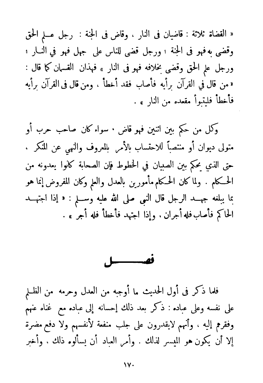 " {الْقُضَاةُ ثَلَاثَةٌ: قَاضِيَانِ فِي النَّارِ وَقَاضٍ فِي الْجَنَّةِ: رَجُلٌ عَلِمَ الْحَقَّ وَقَضَى بِهِ فَهُوَ فِي الْجَنَّةِ؛ وَرَجُلٌ قَضَى لِلنَّاسِ عَلَى جَهْلٍ فَهُوَ فِي النَّارِ؛ وَرَجُلٌ عَلِمَ الْحَقَّ وَقَضَى بِخِلَافِهِ فَهُوَ فِي النَّارِ} " فَهَذَانِ الْقِسْمَانِ كَمَا قَالَ: " {مَنْ قَالَ فِي الْقُرْآنِ بِرَأْيِهِ فَأَصَابَ فَقَدْ أَخْطَأَ وَمَنْ قَالَ فِي الْقُرْآنِ بِرَأْيِهِ فَأَخْطَأَ فَلْيَتَبَوَّأْ مَقْعَدَهُ مِنْ النَّارِ} ". وَكُلُّ مَنْ حَكَمَ بَيْنَ اثْنَيْنِ فَهُوَ قَاضٍ سَوَاءٌ كَانَ صَاحِبَ حَرْبٍ أَوْ مُتَوَلِّي دِيوَانٍ أَوْ مُنْتَصِبًا لِلِاحْتِسَابِ بِالْأَمْرِ بِالْمَعْرُوفِ وَالنَّهْيِ عَنْ الْمُنْكَرِ حَتَّى الَّذِي يَحْكُمُ بَيْنَ الصِّبْيَانِ فِي الْخُطُوطِ فَإِنَّ الصَّحَابَةَ كَانُوا يَعُدُّونَهُ مِنْ الْحُكَّامِ. وَلَمَّا كَانَ الْحُكَّامُ مَأْمُورِينَ بِالْعَدْلِ وَالْعِلْمِ وَكَانَ الْمَفْرُوضُ إنَّمَا هُوَ بِمَا يَبْلُغُهُ جُهْدُ الرَّجُلِ قَالَ النَّبِيُّ صَلَّى اللَّهُ عَلَيْهِ وَسَلَّمَ " {إذَا اجْتَهَدَ الْحَاكِمُ فَأَصَابَ فَلَهُ أَجْرَانِ وَإِذَا اجْتَهَدَ فَأَخْطَأَ فَلَهُ أَجْرٌ} ".