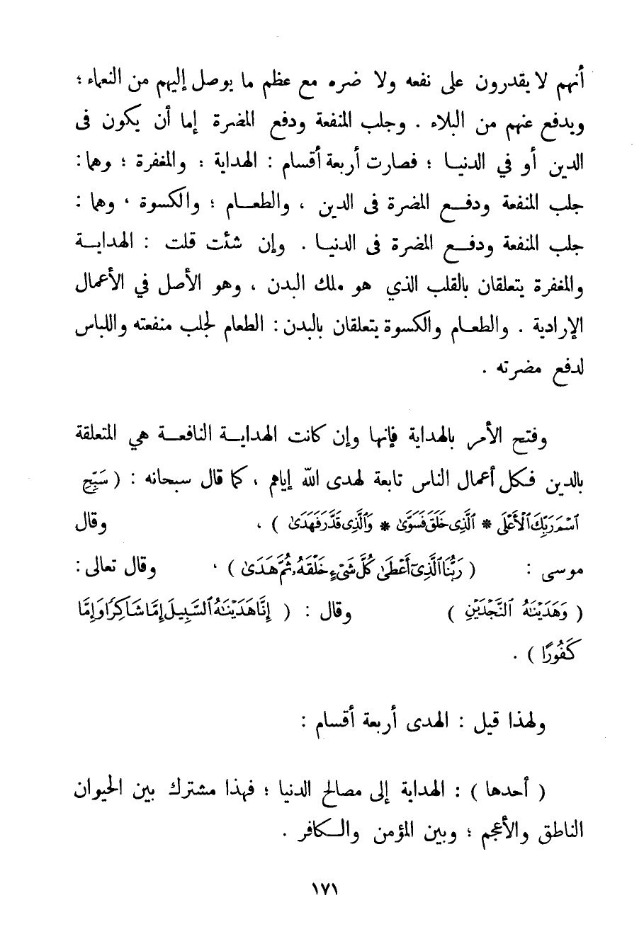 أَنَّهُمْ لَا يَقْدِرُونَ عَلَى نَفْعِهِ وَلَا ضَرِّهِ مَعَ عِظَمِ مَا يُوصِلُ إلَيْهِمْ مِنْ النَّعْمَاءِ؛ وَيَدْفَعُ عَنْهُمْ مِنْ الْبَلَاءِ. وَجَلْبُ الْمَنْفَعَةِ وَدَفْعُ الْمَضَرَّةِ إمَّا أَنْ يَكُونَ فِي الدِّينِ أَوْ فِي الدُّنْيَا؛ فَصَارَتْ أَرْبَعَةَ أَقْسَامٍ: الْهِدَايَةُ: وَالْمَغْفِرَةُ؛ وَهُمَا: جَلْبُ الْمَنْفَعَةِ وَدَفْعُ الْمَضَرَّةِ فِي الدِّينِ وَالطَّعَامِ؛ وَالْكُسْوَةِ وَهُمَا: جَلْبُ الْمَنْفَعَةِ وَدَفْعُ الْمَضَرَّةِ فِي الدُّنْيَا. وَإِنْ شِئْت قُلْت: الْهِدَايَةُ وَالْمَغْفِرَةُ يَتَعَلَّقَانِ بِالْقَلْبِ الَّذِي هُوَ مَلِكُ الْبَدَنِ وَهُوَ الْأَصْلُ فِي الْأَعْمَالِ الْإِرَادِيَّةِ. وَالطَّعَامُ وَالْكُسْوَةُ يَتَعَلَّقَانِ بِالْبَدَنِ: الطَّعَامُ لِجَلْبِ مَنْفَعَتِهِ وَاللِّبَاسُ لِدَفْعِ مَضَرَّتِهِ. وَفَتْحُ الْأَمْرِ بِالْهِدَايَةِ فَإِنَّهَا وَإِنْ كَانَتْ الْهِدَايَةُ النَّافِعَةُ هِيَ الْمُتَعَلِّقَةَ بِالدِّينِ فَكُلُّ أَعْمَالِ النَّاسِ تَابِعَةٌ لِهُدَى اللَّهِ إيَّاهُمْ كَمَا قَالَ سُبْحَانَهُ: {سَبِّحِ اسْمَ رَبِّكَ الْأَعْلَى} {الَّذِي خَلَقَ فَسَوَّى} {وَالَّذِي قَدَّرَ فَهَدَى} وَقَالَ مُوسَى: {رَبُّنَا الَّذِي أَعْطَى كُلَّ شَيْءٍ خَلْقَهُ ثُمَّ هَدَى} وَقَالَ تَعَالَى: {وَهَدَيْنَاهُ النَّجْدَيْنِ} وَقَالَ: {إنَّا هَدَيْنَاهُ السَّبِيلَ إمَّا شَاكِرًا وَإِمَّا كَفُورًا} . وَلِهَذَا قِيلَ: الْهُدَى أَرْبَعَةُ أَقْسَامٍ: أَحَدُهَا: الْهِدَايَةُ إلَى مَصَالِحِ الدُّنْيَا؛ فَهَذَا مُشْتَرَكٌ بَيْنَ الْحَيَوَانِ النَّاطِقِ وَالْأَعْجَمِ؛ وَبَيْنَ الْمُؤْمِنِ وَالْكَافِرِ.