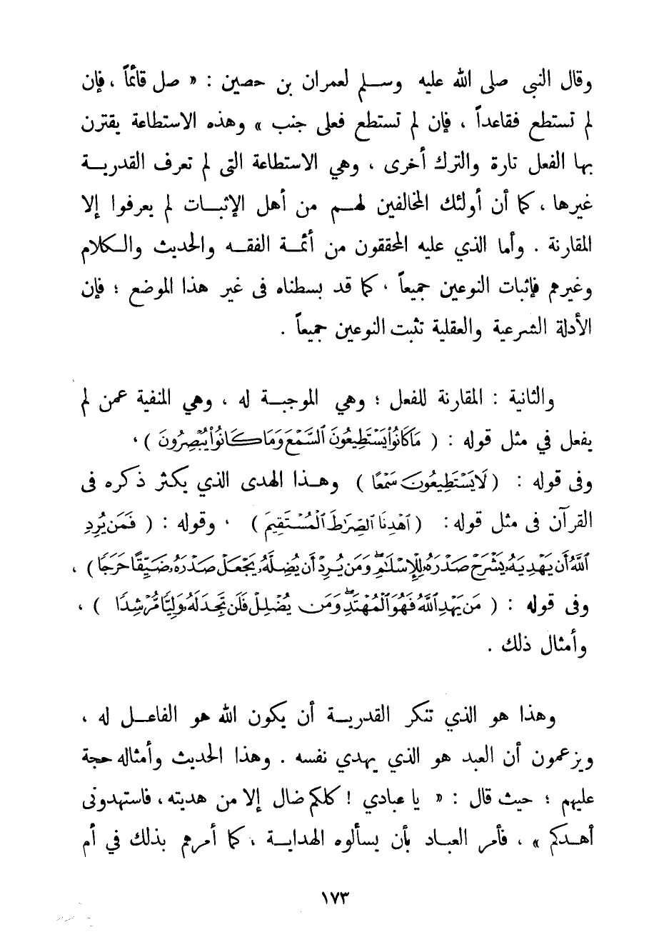 وَقَالَ النَّبِيُّ صَلَّى اللَّهُ عَلَيْهِ وَسَلَّمَ لِعِمْرَان بْنِ حُصَيْنٍ: " {صَلِّ قَائِمًا فَإِنْ لَمْ تَسْتَطِعْ فَقَاعِدًا فَإِنْ لَمْ تَسْتَطِعْ فَعَلَى جَنْبٍ} " وَهَذِهِ الِاسْتِطَاعَةُ يَقْتَرِنُ بِهَا الْفِعْلُ تَارَةً وَالتَّرْكُ أُخْرَى وَهِيَ الِاسْتِطَاعَةُ الَّتِي لَمْ تَعْرِفْ الْقَدَرِيَّةُ غَيْرَهَا كَمَا أَنَّ أُولَئِكَ الْمُخَالِفِينَ لَهُمْ مِنْ أَهْلِ الْإِثْبَاتِ لَمْ يَعْرِفُوا إلَّا الْمُقَارَنَةَ. وَأَمَّا الَّذِي عَلَيْهِ الْمُحَقِّقُونَ مِنْ أَئِمَّةِ الْفِقْهِ وَالْحَدِيثِ وَالْكَلَامِ وَغَيْرِهِمْ فَإِثْبَاتُ النَّوْعَيْنِ جَمِيعًا كَمَا قَدْ بَسَطْنَاهُ فِي غَيْرِ هَذَا الْمَوْضِعِ؛ فَإِنَّ الْأَدِلَّةَ الشَّرْعِيَّةَ وَالْعَقْلِيَّةَ تُثْبِتُ النَّوْعَيْنِ جَمِيعًا. وَالثَّانِيَةُ: الْمُقَارِنَةُ لِلْفِعْلِ؛ وَهِيَ الْمُوجِبَةُ لَهُ وَهِيَ الْمَنْفِيَّةُ عَمَّنْ لَمْ يَفْعَلْ فِي مِثْلِ قَوْلِهِ: {مَا كَانُوا يَسْتَطِيعُونَ السَّمْعَ وَمَا كَانُوا يُبْصِرُونَ} وَفِي قَوْلِهِ: {لَا يَسْتَطِيعُونَ سَمْعًا} وَهَذَا الْهُدَى الَّذِي يَكْثُرُ ذَكَرَهُ فِي الْقُرْآنِ فِي مِثْلِ قَوْلِهِ: {اهْدِنَا الصِّرَاطَ الْمُسْتَقِيمَ} وَقَوْلِهِ: {فَمَنْ يُرِدِ اللَّهُ أَنْ يَهدِيَهُ يَشْرَحْ صَدْرَهُ لِلْإِسْلَامِ وَمَنْ يُرِدْ أَنْ يُضِلَّهُ يَجْعَلْ صَدْرَهُ ضَيِّقًا حَرَجًا} وَفِي قَوْلِهِ: {مَنْ يَهْدِ اللَّهُ فَهُوَ الْمُهْتَدِي وَمَنْ يُضْلِلْ فَلَنْ تَجِدَ لَهُ وَلِيًّا مُرْشِدًا} وَأَمْثَالِ ذَلِكَ. وَهَذَا هُوَ الَّذِي تُنْكِرُ الْقَدَرِيَّةُ أَنْ يَكُونَ اللَّهُ هُوَ الْفَاعِلَ لَهُ وَيَزْعُمُونَ أَنَّ الْعَبْدَ هُوَ الَّذِي يَهْدِي نَفْسَهُ. وَهَذَا الْحَدِيثُ وَأَمْثَالُهُ حُجَّةٌ عَلَيْهِمْ؛ حَيْثُ قَالَ: " {يَا عِبَادِي كُلُّكُمْ ضَالٌّ إلَّا مَنْ هَدَيْته فَاسْتَهْدُونِي أَهْدِكُمْ} فَأَمَرَ الْعِبَادَ بِأَنْ يَسْأَلُوهُ الْهِدَايَةَ كَمَا أَمَرَهُمْ بِذَلِكَ فِي أُمِّ