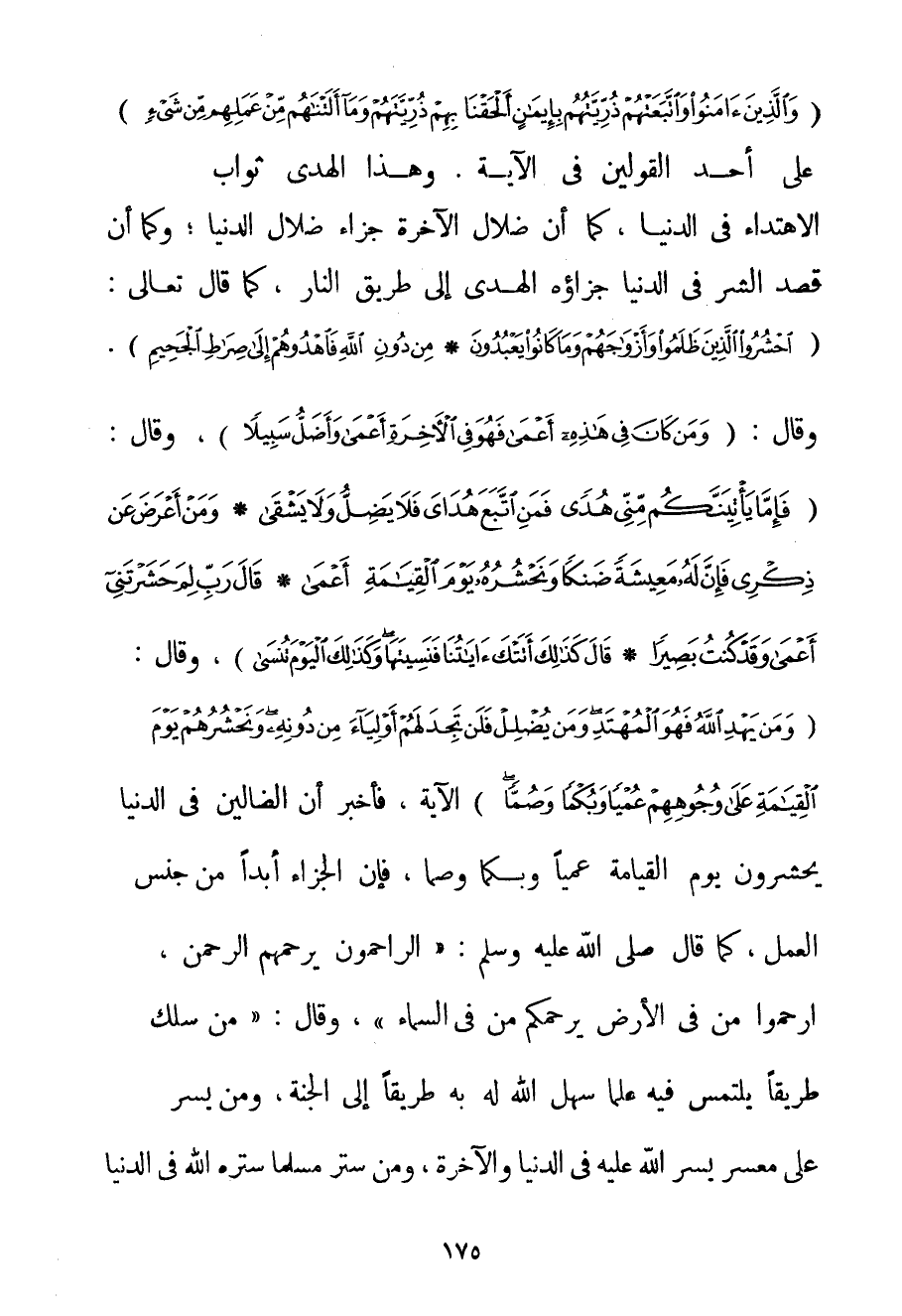 {وَالَّذِينَ آمَنُوا وَاتَّبَعَتْهُمْ ذُرِّيَّتُهُمْ بِإِيمَانٍ أَلْحَقْنَا بِهِمْ ذُرِّيَّتَهُمْ وَمَا أَلَتْنَاهُمْ مِنْ عَمَلِهِمْ مِنْ شَيْءٍ} عَلَى أَحَدِ الْقَوْلَيْنِ فِي الْآيَةِ. وَهَذَا الْهُدَى ثَوَابُ الِاهْتِدَاءِ فِي الدُّنْيَا كَمَا أَنَّ ضَلَالَ الْآخِرَةِ جَزَاءُ ضَلَالِ الدُّنْيَا؛ وَكَمَا أَنَّ قَصْدَ الشَّرِّ فِي الدُّنْيَا جَزَاؤُهُ الْهُدَى إلَى طَرِيقِ النَّارِ كَمَا قَالَ تَعَالَى: {احْشُرُوا الَّذِينَ ظَلَمُوا وَأَزْوَاجَهُمْ وَمَا كَانُوا يَعْبُدُونَ} {مِنْ دُونِ اللَّهِ فَاهْدُوهُمْ إلَى صِرَاطِ الْجَحِيمِ} . وَقَالَ: {وَمَنْ كَانَ فِي هَذِهِ أَعْمَى فَهُوَ فِي الْآخِرَةِ أَعْمَى وَأَضَلُّ سَبِيلًا} وَقَالَ: {فَإِمَّا يَأْتِيَنَّكُمْ مِنِّي هُدًى فَمَنِ اتَّبَعَ هُدَايَ فَلَا يَضِلُّ وَلَا يَشْقَى} {وَمَنْ أَعْرَضَ عَنْ ذِكْرِي فَإِنَّ لَهُ مَعِيشَةً ضَنْكًا وَنَحْشُرُهُ يَوْمَ الْقِيَامَةِ أَعْمَى} {قَالَ رَبِّ لِمَ حَشَرْتَنِي أَعْمَى وَقَدْ كُنْتُ بَصِيرًا} {قَالَ كَذَلِكَ أَتَتْكَ آيَاتُنَا فَنَسِيتَهَا وَكَذَلِكَ الْيَوْمَ تُنْسَى} وَقَالَ: {وَمَنْ يَهْدِ اللَّهُ فَهُوَ الْمُهْتَدِي وَمَنْ يُضْلِلْ فَلَنْ تَجِدَ لَهُمْ أَوْلِيَاءَ مِنْ دُونِهِ وَنَحْشُرُهُمْ يَوْمَ الْقِيَامَةِ عَلَى وُجُوهِهِمْ عُمْيًا وَبُكْمًا وَصُمًّا} الْآيَةَ فَأَخْبَرَ أَنَّ الضَّالِّينَ فِي الدُّنْيَا يُحْشَرُونَ يَوْمَ الْقِيَامَةِ عُمْيًا وَبُكْمًا وَصُمًّا فَإِنَّ الْجَزَاءَ أَبَدًا مِنْ جِنْسِ الْعَمَلِ كَمَا قَالَ صَلَّى اللَّهُ عَلَيْهِ وَسَلَّمَ " {الرَّاحِمُونَ يَرْحَمُهُمْ الرَّحْمَنُ ارْحَمُوا مَنْ فِي الْأَرْضِ يَرْحَمُكُمْ مَنْ فِي السَّمَاءِ} " وَقَالَ: " {مَنْ سَلَكَ طَرِيقًا يَلْتَمِسُ فِيهِ عِلْمًا سَهَّلَ اللَّهُ لَهُ بِهِ طَرِيقًا إلَى الْجَنَّةِ وَمَنْ يَسَّرَ عَلَى مُعْسِرٍ يَسَّرَ اللَّهُ عَلَيْهِ فِي الدُّنْيَا وَالْآخِرَةِ وَمَنْ سَتَرَ مُسْلِمًا سَتَرَهُ اللَّهُ فِي الدُّنْيَا