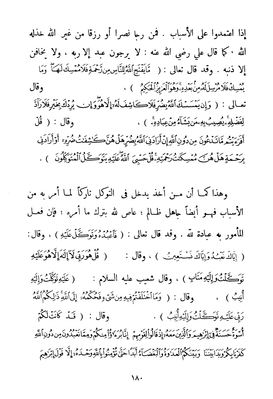 إذَا اعْتَمَدُوا عَلَى الْأَسْبَابِ. فَمَنْ رَجَا نَصْرًا أَوْ رِزْقًا مِنْ غَيْرِ اللَّهِ خَذَلَهُ اللَّهُ كَمَا قَالَ عَلِيٌّ رَضِيَ اللَّهُ عَنْهُ لَا يَرْجُوَن عَبْدٌ إلَّا رَبَّهُ وَلَا يَخَافَن إلَّا ذَنْبَهُ. وَقَدْ قَالَ تَعَالَى: {مَا يَفْتَحِ اللَّهُ لِلنَّاسِ مِنْ رَحْمَةٍ فَلَا مُمْسِكَ لَهَا وَمَا يُمْسِكْ فَلَا مُرْسِلَ لَهُ مِنْ بَعْدِهِ وَهُوَ الْعَزِيزُ الْحَكِيمُ} وَقَالَ تَعَالَى: {وَإِنْ يَمْسَسْكَ اللَّهُ بِضُرٍّ فَلَا كَاشِفَ لَهُ إلَّا هُوَ وَإِنْ يُرِدْكَ بِخَيْرٍ فَلَا رَادَّ لِفَضْلِهِ يُصِيبُ بِهِ مَنْ يَشَاءُ مِنْ عِبَادِهِ} وَقَالَ: {قُلْ أَفَرَأَيْتُمْ مَا تَدْعُونَ مِنْ دُونِ اللَّهِ إنْ أَرَادَنِيَ اللَّهُ بِضُرٍّ هَلْ هُنَّ كَاشِفَاتُ ضُرِّهِ أَوْ أَرَادَنِي بِرَحْمَةٍ هَلْ هُنَّ مُمْسِكَاتُ رَحْمَتِهِ قُلْ حَسْبِيَ اللَّهُ عَلَيْهِ يَتَوَكَّلُ الْمُتَوَكِّلُونَ} .