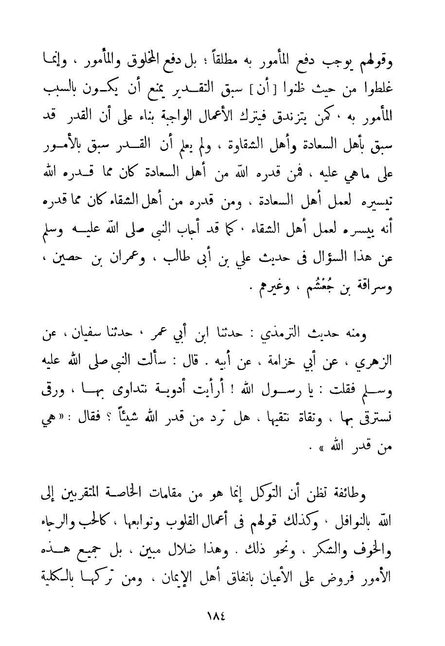 وَقَوْلُهُمْ يُوجِبُ دَفْعَ الْمَأْمُورِ بِهِ مُطْلَقًا؛ بَلْ دَفْعُ الْمَخْلُوقِ وَالْمَأْمُورِ وَإِنَّمَا غَلِطُوا مِنْ حَيْثُ ظَنُّوا أَنَّ سَبْقَ التَّقْدِيرِ يَمْنَعُ أَنْ يَكُونَ بِالسَّبَبِ الْمَأْمُورِ بِهِ كَمَنْ يَتَزَنْدَقُ فَيَتْرُكُ الْأَعْمَالَ الْوَاجِبَةَ بِنَاءً عَلَى أَنَّ الْقَدَرَ قَدْ سَبَقَهُ بِأَهْلِ السَّعَادَةِ وَأَهْلِ الشَّقَاوَةِ وَلَمْ يَعْلَمْ أَنَّ الْقَدَرَ سَبَقَ بِالْأُمُورِ عَلَى مَا هِيَ عَلَيْهِ فَمَنْ قَدَّرَهُ اللَّهُ مِنْ أَهْلِ السَّعَادَةِ كَانَ مِمَّا قَدَّرَهُ اللَّهُ تَيْسِيرُهُ لِعَمَلِ أَهْلِ السَّعَادَةِ وَمَنْ قَدَّرَهُ مِنْ أَهْلِ الشَّقَاءِ كَانَ مِمَّا قَدَّرَهُ أَنْ يُيَسِّرَهُ لِعَمَلِ أَهْلِ الشَّقَاءِ كَمَا قَدْ أَجَابَ النَّبِيُّ صَلَّى اللَّهُ عَلَيْهِ وَسَلَّمَ عَنْ هَذَا السُّؤَالِ فِي حَدِيثِ عَلِيِّ بْنِ أَبِي طَالِبٍ وَعِمْرَانَ بْنِ حُصَيْنٍ وَسُرَاقَةَ بْنِ جَعْشَمَ وَغَيْرِهِمْ. وَمِنْهُ حَدِيثُ التِّرْمِذِيِّ: حَدَّثَنَا ابْنُ أَبِي عُمَرَ حَدَّثَنَا سُفْيَانُ عَنْ الزُّهْرِيِّ عَنْ {أَبِي خِزَامَةَ عَنْ أَبِيهِ. قَالَ: سَأَلْت النَّبِيَّ صَلَّى اللَّهُ عَلَيْهِ وَسَلَّمَ فَقُلْت: يَا رَسُولَ اللَّهِ أَرَأَيْت أَدْوِيَةً نَتَدَاوَى بِهَا وَرُقًى نسترقي بِهَا وَتُقَاةً نَتَّقِيهَا هَلْ تَرُدُّ مِنْ قَدَرِ اللَّهِ شَيْئًا؟ فَقَالَ: هِيَ مِنْ قَدَرِ اللَّهِ} ". وَطَائِفَةٌ تَظُنُّ أَنَّ التَّوَكُّلَ إنَّمَا هُوَ مِنْ مَقَامَاتِ الْخَاصَّةِ الْمُتَقَرِّبِينَ إلَى اللَّهِ بِالنَّوَافِلِ وَكَذَلِكَ قَوْلُهُمْ فِي أَعْمَالِ الْقُلُوبِ وَتَوَابِعهَا كَالْحُبِّ وَالرَّجَاءِ وَالْخَوْفِ وَالشُّكْرِ وَنَحْوِ ذَلِكَ. وَهَذَا ضَلَالٌ مُبِينٌ بَلْ جَمِيعُ هَذِهِ الْأُمُورِ فُرُوضٌ عَلَى الْأَعْيَانِ بِاتِّفَاقِ أَهْلِ الْإِيمَانِ وَمَنْ تَرَكَهَا بِالْكُلِّيَّةِ