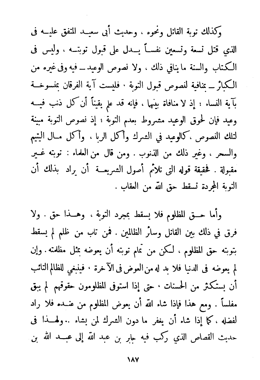 وَكَذَلِكَ تَوْبَةُ الْقَاتِلِ وَنَحْوِهِ وَحَدِيثُ أَبِي سَعِيدٍ الْمُتَّفَقُ عَلَيْهِ فِي الَّذِي قَتَلَ تِسْعَةً وَتِسْعِينَ نَفْسًا يَدُلُّ عَلَى قَبُولِ تَوْبَتِهِ وَلَيْسَ فِي الْكِتَابِ وَالسُّنَّةِ مَا يُنَافِي ذَلِكَ وَلَا نُصُوصَ الْوَعِيدِ - فِيهِ وَفِي غَيْرِهِ مِنْ الْكَبَائِرِ - بِمُنَافِيَةٍ لِنُصُوصِ قَبُولِ التَّوْبَةِ فَلَيْسَتْ آيَةُ الْفُرْقَانِ بِمَنْسُوخَةٍ بِآيَةِ النِّسَاءِ؛ إذْ لَا مُنَافَاةَ بَيْنَهُمَا فَإِنَّهُ قَدْ عَلِمَ يَقِينًا أَنَّ كُلَّ ذَنْبٍ فِيهِ وَعِيدٌ فَإِنَّ لُحُوقَ الْوَعِيدِ مَشْرُوطٌ بِعَدَمِ التَّوْبَةِ؛ إذْ نُصُوصُ التَّوْبَةِ مُبَيِّنَةٌ لِتِلْكَ النُّصُوصِ كَالْوَعِيدِ فِي الشِّرْكِ وَأَكْلِ الرِّبَا وَأَكْلِ مَالِ الْيَتِيمِ وَالسِّحْرِ وَغَيْرِ ذَلِكَ مِنْ الذُّنُوبِ. وَمَنْ قَالَ مِنْ الْعُلَمَاءِ: تَوْبَتُهُ غَيْرُ مَقْبُولَةٍ. فَحَقِيقَةُ قَوْلِهِ الَّتِي تُلَائِمُ أُصُولَ الشَّرِيعَةِ أَنْ يُرَادَ بِذَلِكَ أَنَّ التَّوْبَةَ الْمُجَرَّدَةَ تُسْقِطُ حَقَّ اللَّهِ مِنْ الْعِقَابِ. وَأَمَّا حَقُّ الْمَظْلُومِ فَلَا يَسْقُطُ بِمُجَرَّدِ التَّوْبَةِ وَهَذَا حَقٌّ. وَلَا فَرْقَ فِي ذَلِكَ بَيْنَ الْقَاتِلِ وَسَائِرِ الظَّالِمِينَ. فَمَنْ تَابَ مِنْ ظُلْمٍ لَمْ يَسْقُطْ بِتَوْبَتِهِ حَقُّ الْمَظْلُومِ لَكِنْ مِنْ تَمَامِ تَوْبَتِهِ أَنْ يُعَوِّضَهُ بِمِثْلِ مَظْلِمَتِهِ. وَإِنْ لَمْ يُعَوِّضْهُ فِي الدُّنْيَا فَلَا بُدَّ لَهُ مِنْ الْعِوَضِ فِي الْآخِرَةِ فَيَنْبَغِي لِلظَّالِمِ التَّائِبِ أَنْ يَسْتَكْثِرَ مِنْ الْحَسَنَاتِ حَتَّى إذَا اسْتَوْفَى الْمَظْلُومُونَ حُقُوقَهُمْ لَمْ يَبْقَ مُفْلِسًا. وَمَعَ هَذَا فَإِذَا شَاءَ اللَّهُ أَنْ يُعَوِّضَ الْمَظْلُومَ مِنْ عِنْدِهِ فَلَا رَادَّ لِفَضْلِهِ كَمَا إذَا شَاءَ أَنْ يَغْفِرَ مَا دُونَ الشِّرْكِ لِمَنْ يَشَاءُ. وَلِهَذَا فِي حَدِيثِ الْقِصَاصِ الَّذِي رَكِبَ فِيهِ جَابِرُ بْنُ عَبْدِ اللَّهِ إلَى عَبْدِ اللَّهِ بْنِ