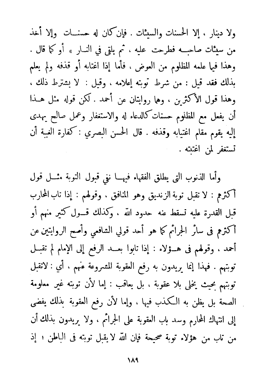 وَلَا دِينَارٌ إلَّا الْحَسَنَاتُ وَالسَّيِّئَاتُ. فَإِنْ كَانَ لَهُ حَسَنَاتٌ وَإِلَّا أُخِذَ مِنْ سَيِّئَاتِ صَاحِبِهِ فَطُرِحَتْ عَلَيْهِ ثُمَّ يُلْقَى فِي النَّارِ} " أَوْ كَمَا قَالَ. وَهَذَا فِيمَا عَلِمَهُ الْمَظْلُومُ مِنْ الْعِوَضِ فَأَمَّا إذَا اغْتَابَهُ أَوْ قَذَفَهُ وَلَمْ يَعْلَمْ بِذَلِكَ فَقَدْ قِيلَ: مِنْ شَرْطِ تَوْبَتِهِ إعْلَامُهُ وَقِيلَ: لَا يُشْتَرَطُ ذَلِكَ وَهَذَا قَوْلُ الْأَكْثَرِينَ وَهُمَا رِوَايَتَانِ عَنْ أَحْمَد. لَكِنَّ قَوْلَهُ مِثْلَ هَذَا أَنْ يَفْعَلَ مَعَ الْمَظْلُومِ حَسَنَاتٍ كَالدُّعَاءِ لَهُ وَالِاسْتِغْفَارِ وَعَمَلٍ صَالِحٍ يَهْدِي إلَيْهِ يَقُومُ مَقَامَ اغْتِيَابِهِ وَقَذْفِهِ. قَالَ الْحَسَنُ الْبَصْرِيُّ: كَفَّارَةُ الْغِيبَةِ أَنْ تَسْتَغْفِرَ لِمَنْ اغْتَبْته. وَأَمَّا الذُّنُوبُ الَّتِي يُطْلِقُ الْفُقَهَاءُ فِيهَا نَفْيَ قَبُولِ التَّوْبَةِ مِثْلَ قَوْلِ أَكْثَرِهِمْ: لَا تُقْبَلُ تَوْبَةُ الزِّنْدِيقِ وَهُوَ الْمُنَافِقُ وَقَوْلُهُمْ: إذَا تَابَ الْمُحَارِبُ قَبْلَ الْقُدْرَةِ عَلَيْهِ تَسْقُطُ عَنْهُ حُدُودُ اللَّهِ وَكَذَلِكَ قَوْلُ كَثِيرٍ مِنْهُمْ أَوْ أَكْثَرِهِمْ فِي سَائِرِ الْجَرَائِمِ كَمَا هُوَ أَحَدُ قَوْلَيْ الشَّافِعِيِّ وَأَصَحُّ الرِّوَايَتَيْنِ عَنْ أَحْمَد وَقَوْلُهُمْ فِي هَؤُلَاءِ: إذَا تَابُوا بَعْدَ الرَّفْعِ إلَى الْإِمَامِ لَمْ تُقْبَلْ تَوْبَتُهُمْ. فَهَذَا إنَّمَا يُرِيدُونَ بِهِ رَفْعَ الْعُقُوبَةِ الْمَشْرُوعَةِ عَنْهُمْ أَيْ: لَا تُقْبَلُ تَوْبَتُهُمْ بِحَيْثُ يُخَلَّى بِلَا عُقُوبَةٍ بَلْ يُعَاقَبُ: إمَّا لِأَنَّ تَوْبَتَهُ غَيْرُ مَعْلُومَةِ الصِّحَّةِ بَلْ يُظَنُّ بِهِ الْكَذِبُ فِيهَا وَأَمَّا لِأَنَّ رَفْعَ الْعُقُوبَةِ بِذَلِكَ يُفْضِي إلَى انْتِهَاكِ الْمَحَارِم وَسَدِّ بَابِ الْعُقُوبَةِ عَلَى الْجَرَائِمِ وَلَا يُرِيدُونَ بِذَلِكَ أَنَّ مَنْ تَابَ مِنْ هَؤُلَاءِ تَوْبَةً صَحِيحَةً فَإِنَّ اللَّهَ لَا يَقْبَلُ تَوْبَتَهُ فِي الْبَاطِنِ؛ إذْ