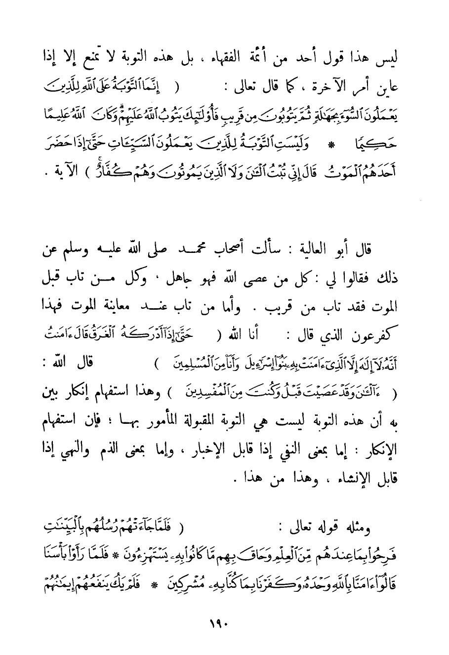 لَيْسَ هَذَا قَوْلَ أَحَدٍ مِنْ أَئِمَّةِ الْفُقَهَاءِ بَلْ هَذِهِ التَّوْبَةُ لَا تُمْنَعُ إلَّا إذَا عَايَنَ أَمْرَ الْآخِرَةِ كَمَا قَالَ تَعَالَى: {إنَّمَا التَّوْبَةُ عَلَى اللَّهِ لِلَّذِينَ يَعْمَلُونَ السُّوءَ بِجَهَالَةٍ ثُمَّ يَتُوبُونَ مِنْ قَرِيبٍ فَأُولَئِكَ يَتُوبُ اللَّهُ عَلَيْهِمْ وَكَانَ اللَّهُ عَلِيمًا حَكِيمًا} {وَلَيْسَتِ التَّوْبَةُ لِلَّذِينَ يَعْمَلُونَ السَّيِّئَاتِ حَتَّى إذَا حَضَرَ أَحَدَهُمُ الْمَوْتُ قَالَ إنِّي تُبْتُ الْآنَ وَلَا الَّذِينَ يَمُوتُونَ وَهُمْ كُفَّارٌ} الْآيَةَ. قَالَ أَبُو الْعَالِيَةِ: سَأَلْت أَصْحَابَ مُحَمَّدٍ صَلَّى اللَّهُ عَلَيْهِ وَسَلَّمَ عَنْ ذَلِكَ فَقَالُوا لِي: كُلُّ مَنْ عَصَى اللَّهَ فَهُوَ جَاهِلٌ وَكُلُّ مَنْ تَابَ قَبْلَ الْمَوْتِ فَقَدْ تَابَ مِنْ قَرِيبٍ. وَأَمَّا مَنْ تَابَ عِنْدَ مُعَايَنَةِ الْمَوْتِ فَهَذَا كَفِرْعَوْنَ الَّذِي قَالَ: أَنَا اللَّهُ {حَتَّى إذَا أَدْرَكَهُ الْغَرَقُ قَالَ آمَنْتُ أَنَّهُ لَا إلَهَ إلَّا الَّذِي آمَنَتْ بِهِ بَنُو إسْرَائِيلَ وَأَنَا مِنَ الْمُسْلِمِينَ} قَالَ اللَّهُ: {آلْآنَ وَقَدْ عَصَيْتَ قَبْلُ وَكُنْتَ مِنَ الْمُفْسِدِينَ} وَهَذَا اسْتِفْهَامُ إنْكَارٍ بَيَّنَ بِهِ أَنَّ هَذِهِ التَّوْبَةَ لَيْسَتْ هِيَ التَّوْبَةُ الْمَقْبُولَةُ الْمَأْمُورُ بِهَا؛ فَإِنَّ اسْتِفْهَامَ الْإِنْكَارِ: إمَّا بِمَعْنَى النَّفْيِ إذَا قَابَلَ الْإِخْبَارَ وَإِمَّا بِمَعْنَى الذَّمِّ وَالنَّهْيِ إذَا قَابَلَ الْإِنْشَاءَ وَهَذَا مِنْ هَذَا. وَمِثْلُهُ قَوْله تَعَالَى {فَلَمَّا جَاءَتْهُمْ رُسُلُهُمْ بِالْبَيِّنَاتِ فَرِحُوا بِمَا عِنْدَهُمْ مِنَ الْعِلْمِ وَحَاقَ بِهِمْ مَا كَانُوا بِهِ يَسْتَهْزِئُونَ} {فَلَمَّا رَأَوْا بَأْسَنَا قَالُوا آمَنَّا بِاللَّهِ وَحْدَهُ وَكَفَرْنَا بِمَا كُنَّا بِهِ مُشْرِكِينَ} {فَلَمْ يَكُ يَنْفَعُهُمْ إيمَانُهُمْ لَمَّا