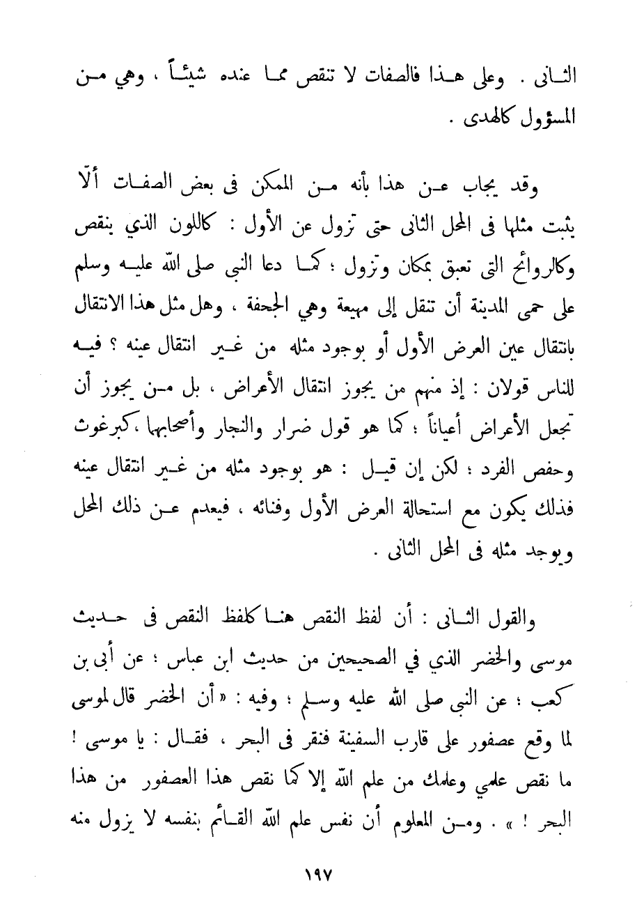 الثَّانِي. وَعَلَى هَذَا فَالصِّفَاتُ لَا تُنْقِصُ مِمَّا عِنْدَهُ شَيْئًا وَهِيَ مِنْ الْمَسْئُولِ كَالْهُدَى. وَقَدْ يُجَابُ عَنْ هَذَا بِأَنَّهُ مِنْ الْمُمْكِنِ فِي بَعْضِ الصِّفَاتِ أَلَّا يَثْبُتَ مِثْلُهَا فِي الْمَحَلِّ الثَّانِي حَتَّى تَزُولَ عَنْ الْأَوَّلِ: كَاللَّوْنِ الَّذِي يَنْقُصُ وَكَالرَّوَائِحِ الَّتِي تَعْبَقُ بِمَكَانِ وَتَزُولُ؛ كَمَا دَعَا النَّبِيُّ صَلَّى اللَّهُ عَلَيْهِ وَسَلَّمَ عَلَى حُمَّى الْمَدِينَةِ أَنْ تُنْقَلَ إلَى مهيعة وَهِيَ الْجُحْفَةُ وَهَلْ مِثْلُ هَذَا الِانْتِقَالِ بِانْتِقَالِ عَيْنِ الْعَرَضِ الْأَوَّلِ أَوْ بِوُجُودِ مِثْلِهِ مِنْ غَيْرِ انْتِقَالِ عَيْنِهِ؟ فِيهِ لِلنَّاسِ قَوْلَانِ: إذْ مِنْهُمْ مَنْ يُجَوِّزُ انْتِقَالَ الْأَعْرَاضِ بَلْ مَنْ يُجَوِّزُ أَنْ تُجْعَلَ الْأَعْرَاضُ أَعْيَانًا؛ كَمَا هُوَ قَوْلُ ضِرَارٍ وَالنَّجَّارِ وَأَصْحَابِهِمَا كَبُرْغُوثِ وَحَفْصٍ الْفَرْدِ؛ لَكِنْ إنْ قِيلَ: هُوَ بِوُجُودِ مِثْلِهِ مِنْ غَيْرِ انْتِقَالِ عَيْنِهِ فَذَلِكَ يَكُونُ مَعَ اسْتِحَالَةِ الْعَرَضِ الْأَوَّلِ وَفَنَائِهِ فَيُعْدَمُ عَنْ ذَلِكَ الْمَحَلُّ وَيُوجَدُ مِثْلُهُ فِي الْمَحَلِّ الثَّانِي. وَالْقَوْلُ الثَّانِي: أَنَّ لَفْظَ النَّقْصِ هُنَا كَلَفْظِ النَّقْصِ فِي حَدِيثِ مُوسَى وَالْخَضِرِ الَّذِي فِي الصَّحِيحَيْنِ مِنْ حَدِيثِ ابْنِ عَبَّاسٍ؛ عَنْ أبي بْنِ كَعْبٍ؛ عَنْ النَّبِيِّ صَلَّى اللَّهُ عَلَيْهِ وَسَلَّمَ وَفِيهِ: " {أَنَّ الْخَضِرَ قَالَ لِمُوسَى لَمَّا وَقَعَ عُصْفُورٌ عَلَى قَارِبِ السَّفِينَةِ فَنَقَرَ فِي الْبَحْرِ فَقَالَ: يَا مُوسَى مَا نَقَصَ عِلْمِي وَعِلْمُك مِنْ عِلْمِ اللَّهِ إلَّا كَمَا نَقَصَ هَذَا الْعُصْفُورُ مِنْ هَذَا الْبَحْرِ} " وَمِنْ الْمَعْلُومِ أَنَّ نَفْسَ عِلْمِ اللَّهِ الْقَائِمِ بِنَفْسِهِ لَا يَزُولُ مِنْهُ