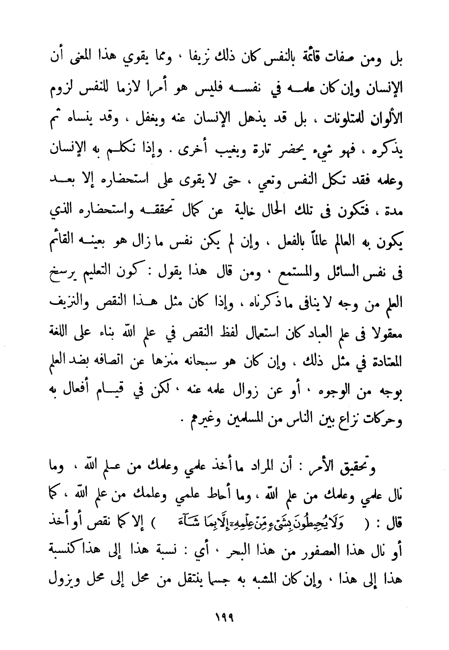 بَلْ وَمِنْ صِفَاتٍ قَائِمَةٍ بِالنَّفْسِ كَانَ ذَلِكَ نَزِيفًا وَمِمَّا يُقَوِّي هَذَا الْمَعْنَى أَنَّ الْإِنْسَانَ وَإِنْ كَانَ عِلْمُهُ فِي نَفْسِهِ فَلَيْسَ هُوَ أَمْرًا لَازِمًا لِلنَّفْسِ لُزُومَ الْأَلْوَانِ لِلْمُتَلَوِّنَاتِ بَلْ قَدْ يَذْهَلُ الْإِنْسَانُ عَنْهُ وَيَغْفُلُ وَقَدْ يَنْسَاهُ ثُمَّ يَذْكُرُهُ فَهُوَ شَيْءٌ يَحْضُرُ تَارَةً وَيَغِيبُ أُخْرَى. وَإِذَا تَكَلَّمَ بِهِ الْإِنْسَانُ وَعَلِمَهُ فَقَدْ تَكِلُ النَّفْسُ وَتَعِي حَتَّى لَا يَقْوَى عَلَى اسْتِحْضَارِهِ إلَّا بَعْدَ مُدَّةٍ فَتَكُونُ فِي تِلْكَ الْحَالِ خَالِيَةً عَنْ كَمَالِ تَحَقُّقِهِ وَاسْتِحْضَارِهِ الَّذِي يَكُونُ بِهِ الْعَالِمُ عَالِمًا بِالْفِعْلِ وَإِنْ لَمْ يَكُنْ نَفْسُ مَا زَالَ هُوَ بِعَيْنِهِ الْقَائِمُ فِي نَفْسِ السَّائِلِ وَالْمُسْتَمِعِ وَمَنْ قَالَ هَذَا يَقُولُ: كَوْنُ التَّعْلِيمِ يُرَسِّخُ الْعِلْمَ مِنْ وَجْهٍ لَا يُنَافِي مَا ذَكَرْنَاهُ وَإِذَا كَانَ مِثْلُ هَذَا النَّقْصِ وَالنَّزِيفِ مَعْقُولًا فِي عِلْمِ الْعِبَادِ كَانَ اسْتِعْمَالُ لَفْظِ النَّقْصِ فِي عِلْمِ اللَّهِ بِنَاءً عَلَى اللُّغَةِ الْمُعْتَادَةِ فِي مِثْلِ ذَلِكَ وَإِنْ كَانَ هُوَ سُبْحَانَهُ مُنَزَّهًا عَنْ اتِّصَافِهِ بِضِدِّ الْعِلْمِ بِوَجْهِ مِنْ الْوُجُوهِ أَوْ عَنْ زَوَالِ عِلْمِهِ عَنْهُ لَكِنْ فِي قِيَامِ أَفْعَالٍ بِهِ وَحَرَكَاتِ نِزَاعٍ بَيْنَ النَّاسِ مِنْ الْمُسْلِمِينَ وَغَيْرِهِمْ. وَتَحْقِيقُ الْأَمْرِ: أَنَّ الْمُرَادَ مَا أَخَذَ عِلْمِي وَعِلْمُك مِنْ عِلْمِ اللَّهِ وَمَا نَالَ عِلْمِي وَعِلْمُك مِنْ عِلْمِ اللَّهِ وَمَا أَحَاطَ عِلْمِي وَعِلْمَك مِنْ عِلْمِ اللَّهِ كَمَا قَالَ: {وَلَا يُحِيطُونَ بِشَيْءٍ مِنْ عِلْمِهِ إلَّا بِمَا شَاءَ} إلَّا كَمَا نَقَصَ أَوْ أَخَذَ أَوْ نَالَ هَذَا الْعُصْفُورُ مِنْ هَذَا الْبَحْرِ أَيْ: نِسْبَةُ هَذَا إلَى هَذَا كَنِسْبَةِ هَذَا إلَى هَذَا وَإِنْ كَانَ الْمُشَبَّهُ بِهِ جِسْمًا يَنْتَقِلُ مِنْ مَحَلٍّ إلَى مَحَلٍّ وَيَزُولُ