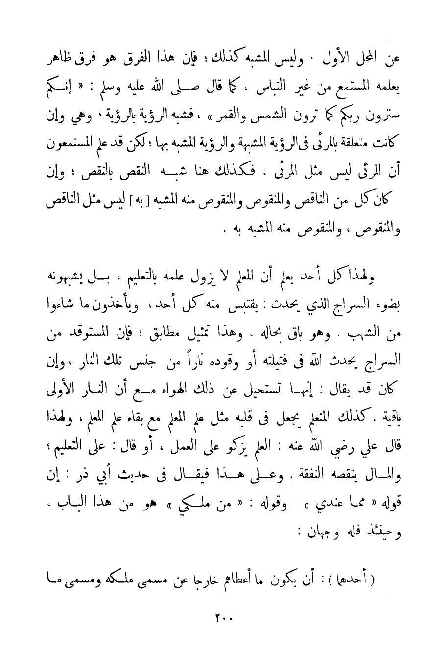 عَنْ الْمَحَلِّ الْأَوَّلِ وَلَيْسَ الْمُشَبَّهُ كَذَلِكَ؛ فَإِنَّ هَذَا الْفَرْقَ هُوَ فَرْقٌ ظَاهِرٌ يَعْلَمُهُ الْمُسْتَمِعُ مِنْ غَيْرِ الْتِبَاسٍ كَمَا قَالَ صَلَّى اللَّهُ عَلَيْهِ وَسَلَّمَ " {إنَّكُمْ سَتَرَوْنَ رَبَّكُمْ كَمَا تَرَوْنَ الشَّمْسَ وَالْقَمَرَ} " فَشَبَّهَ الرُّؤْيَةَ بِالرُّؤْيَةِ وَهِيَ وَإِنْ كَانَتْ مُتَعَلِّقَةً بِالْمَرْئِيِّ فِي الرُّؤْيَةِ الْمُشَبَّهَةِ وَالرُّؤْيَةِ الْمُشَبَّهِ بِهَا؛ لَكِنْ قَدْ عَلِمَ الْمُسْتَمِعُونَ أَنَّ الْمَرْئِيَّ لَيْسَ مِثْلَ الْمَرْئِيِّ فَكَذَلِكَ هُنَا شَبَّهَ النَّقْصَ بِالنَّقْصِ؛ وَإِنْ كَانَ كُلٌّ مِنْ النَّاقِصِ وَالْمَنْقُوصِ وَالْمَنْقُوصِ مِنْهُ الْمُشَبَّهِ بِهِ لَيْسَ مِثْلَ النَّاقِصِ وَالْمَنْقُوصِ وَالْمَنْقُوصُ مِنْهُ الْمُشَبَّهُ بِهِ. وَلِهَذَا كُلُّ أَحَدٍ يَعْلَمُ أَنَّ الْمُعَلِّمَ لَا يَزُولُ عِلْمُهُ بِالتَّعْلِيمِ بَلْ يُشَبِّهُونَهُ بِضَوْءِ السِّرَاجِ الَّذِي يَحْدُثُ: يَقْتَبِسُ مِنْهُ كُلُّ أَحَدٍ وَيَأْخُذُونَ مَا شَاءُوا مِنْ الشُّهُبِ وَهُوَ بَاقٍ بِحَالِهِ وَهَذَا تَمْثِيلٌ مُطَابِقٌ؛ فَإِنَّ الْمُسْتَوْقِدَ مِنْ السِّرَاجِ يُحْدِثُ اللَّهُ فِي فَتِيلَتِهِ أَوْ وَقُودِهِ نَارًا مِنْ جِنْسِ تِلْكَ النَّارِ وَإِنْ كَانَ قَدْ يُقَالُ: إنَّهَا تَسْتَحِيلُ عَنْ ذَلِكَ الْهَوَاءِ مَعَ أَنَّ النَّارَ الْأُولَى بَاقِيَةٌ كَذَلِكَ الْمُتَعَلِّمُ يَجْعَلُ فِي قَلْبِهِ مِثْلَ عِلْمِ الْمُعَلِّمِ مَعَ بَقَاءِ عِلْمِ الْمُعَلِّمِ وَلِهَذَا قَالَ عَلِيٌّ رَضِيَ اللَّهُ عَنْهُ الْعِلْمُ يَزْكُو عَلَى الْعَمَلِ أَوْ قَالَ: عَلَى التَّعْلِيمِ؛ وَالْمَالُ يُنْقِصُهُ النَّفَقَةُ. وَعَلَى هَذَا فَيُقَالُ فِي حَدِيثِ أَبِي ذَرٍّ: إنَّ قَوْلَهُ " مِمَّا عِنْدِي "؛ وَقَوْلَهُ: " مِنْ مُلْكِي " هُوَ مِنْ هَذَا الْبَابِ وَحِينَئِذٍ فَلَهُ وَجْهَانِ: