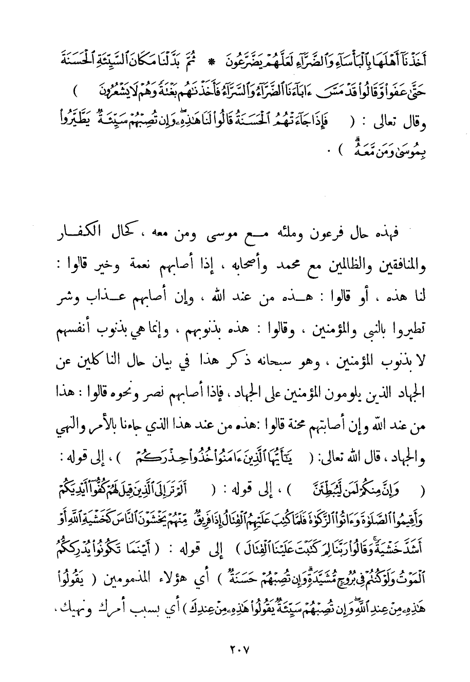 قَرْيَةٍ مِنْ نَبِيٍّ إلَّا أَخَذْنَا أَهْلَهَا بِالْبَأْسَاءِ وَالضَّرَّاءِ لَعَلَّهُمْ يَضَّرَّعُونَ} {ثُمَّ بَدَّلْنَا مَكَانَ السَّيِّئَةِ الْحَسَنَةَ حَتَّى عَفَوْا وَقَالُوا قَدْ مَسَّ آبَاءَنَا الضَّرَّاءُ وَالسَّرَّاءُ فَأَخَذْنَاهُمْ بَغْتَةً وَهُمْ لَا يَشْعُرُونَ} وَقَالَ تَعَالَى: {فَإِذَا جَاءَتْهُمُ الْحَسَنَةُ قَالُوا لَنَا هَذِهِ وَإِنْ تُصِبْهُمْ سَيِّئَةٌ يَطَّيَّرُوا بِمُوسَى وَمَنْ مَعَهُ} . فَهَذِهِ حَالُ فِرْعَوْنَ وَمَلَئِهِ مَعَ مُوسَى وَمَنْ مَعَهُ كَحَالِ الْكُفَّارِ وَالْمُنَافِقِينَ وَالظَّالِمِينَ مَعَ مُحَمَّدٍ وَأَصْحَابِهِ إذَا أَصَابَهُمْ نِعْمَةٌ وَخَيْرٌ قَالُوا: لَنَا هَذِهِ أَوْ قَالُوا: هَذِهِ مِنْ عِنْدِ اللَّهِ وَإِنْ أَصَابَهُمْ عَذَابٌ وَشَرٌّ تَطَيَّرُوا بِالنَّبِيِّ وَالْمُؤْمِنِينَ وَقَالُوا: هَذِهِ بِذُنُوبِهِمْ وَإِنَّمَا هِيَ بِذُنُوبِ أَنْفُسِهِمْ لَا بِذُنُوبِ الْمُؤْمِنِينَ وَهُوَ سُبْحَانَهُ ذَكَرَ هَذَا فِي بَيَانِ حَالِ النَّاكِلِينَ عَنْ الْجِهَادِ الَّذِينَ يَلُومُونَ الْمُؤْمِنِينَ عَلَى الْجِهَادِ فَإِذَا أَصَابَهُمْ نَصْرٌ وَنَحْوُهُ قَالُوا: هَذَا مِنْ عِنْدِ اللَّهِ وَإِنْ أَصَابَتْهُمْ مِحْنَةٌ قَالُوا: هَذِهِ مِنْ عِنْدِ هَذَا الَّذِي جَاءَنَا بِالْأَمْرِ وَالنَّهْيِ وَالْجِهَادِ قَالَ اللَّهُ تَعَالَى: {يَا أَيُّهَا الَّذِينَ آمَنُوا خُذُوا حِذْرَكُمْ} إلَى قَوْلِهِ: {وَإِنَّ مِنْكُمْ لَمَنْ لَيُبَطِّئَنَّ} إلَى قَوْلِهِ: {أَلَمْ تَرَ إلَى الَّذِينَ قِيلَ لَهُمْ كُفُّوا أَيْدِيَكُمْ وَأَقِيمُوا الصَّلَاةَ وَآتُوا الزَّكَاةَ فَلَمَّا كُتِبَ عَلَيْهِمُ الْقِتَالُ إذَا فَرِيقٌ مِنْهُمْ يَخْشَوْنَ النَّاسَ كَخَشْيَةِ اللَّهِ أَوْ أَشَدَّ خَشْيَةً وَقَالُوا رَبَّنَا لِمَ كَتَبْتَ عَلَيْنَا الْقِتَالَ} إلَى قَوْلِهِ: {أَيْنَمَا تَكُونُوا يُدْرِكُكُمُ الْمَوْتُ وَلَوْ كُنْتُمْ فِي بُرُوجٍ مُشَيَّدَةٍ وَإِنْ تُصِبْهُمْ حَسَنَةٌ} أَيْ هَؤُلَاءِ الْمَذْمُومِينَ {يَقُولُوا هَذِهِ مِنْ عِنْدِ اللَّهِ وَإِنْ تُصِبْهُمْ سَيِّئَةٌ يَقُولُوا هَذِهِ مِنْ عِنْدِكَ} أَيْ بِسَبَبِ أَمْرِك وَنَهْيِك